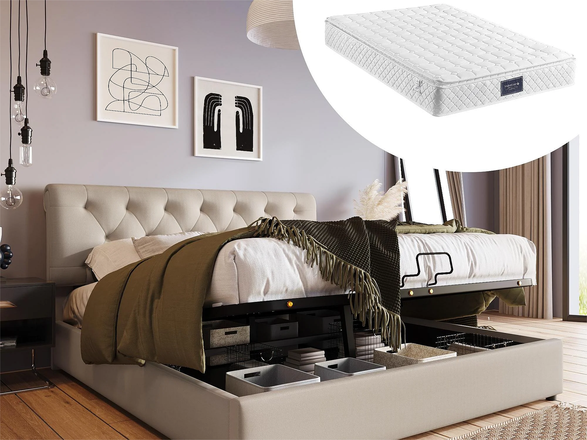 Cama con canapé 160 x 200 cm - tejido de lino - estilo contemporáneo - natural + colchón