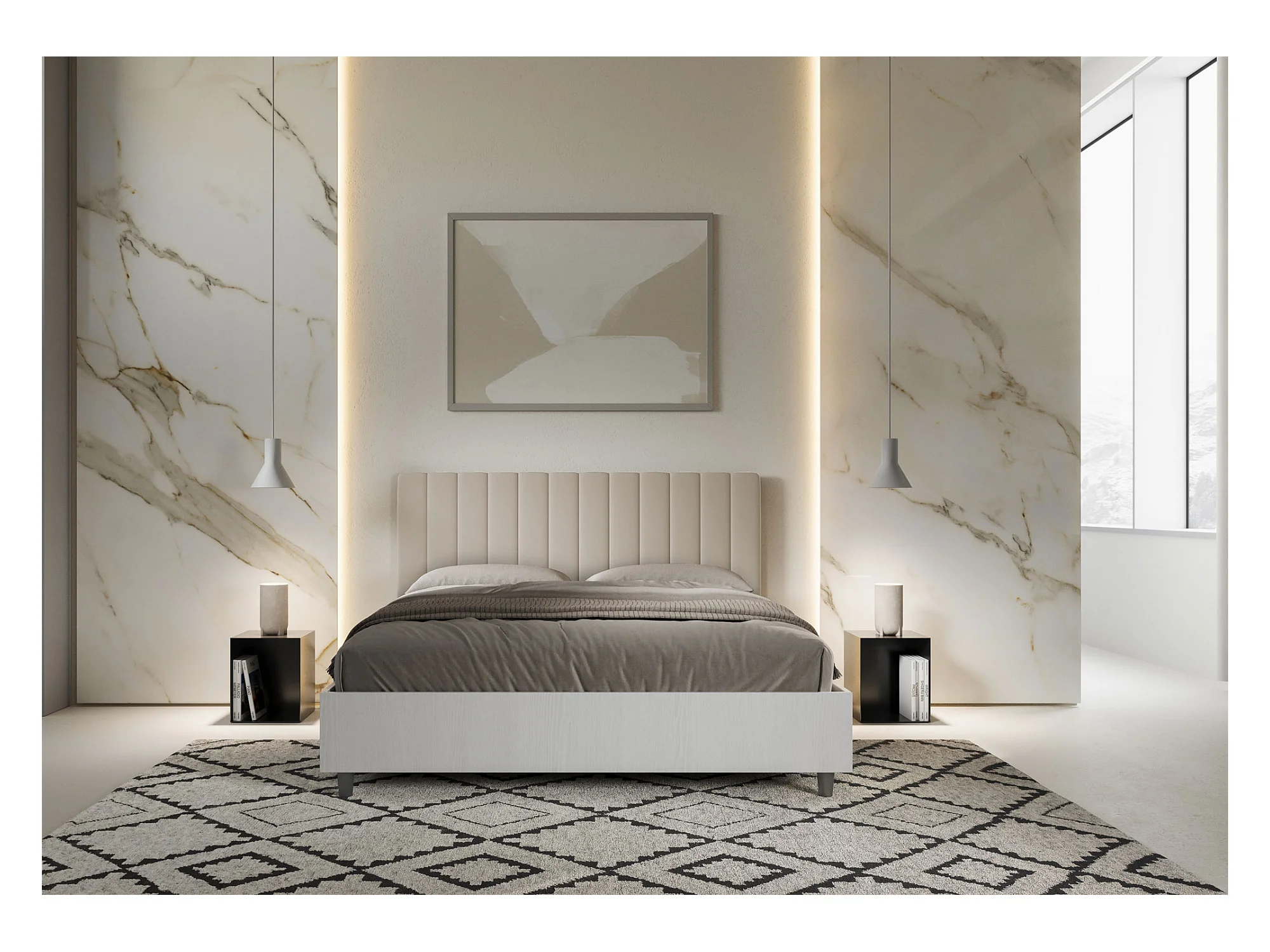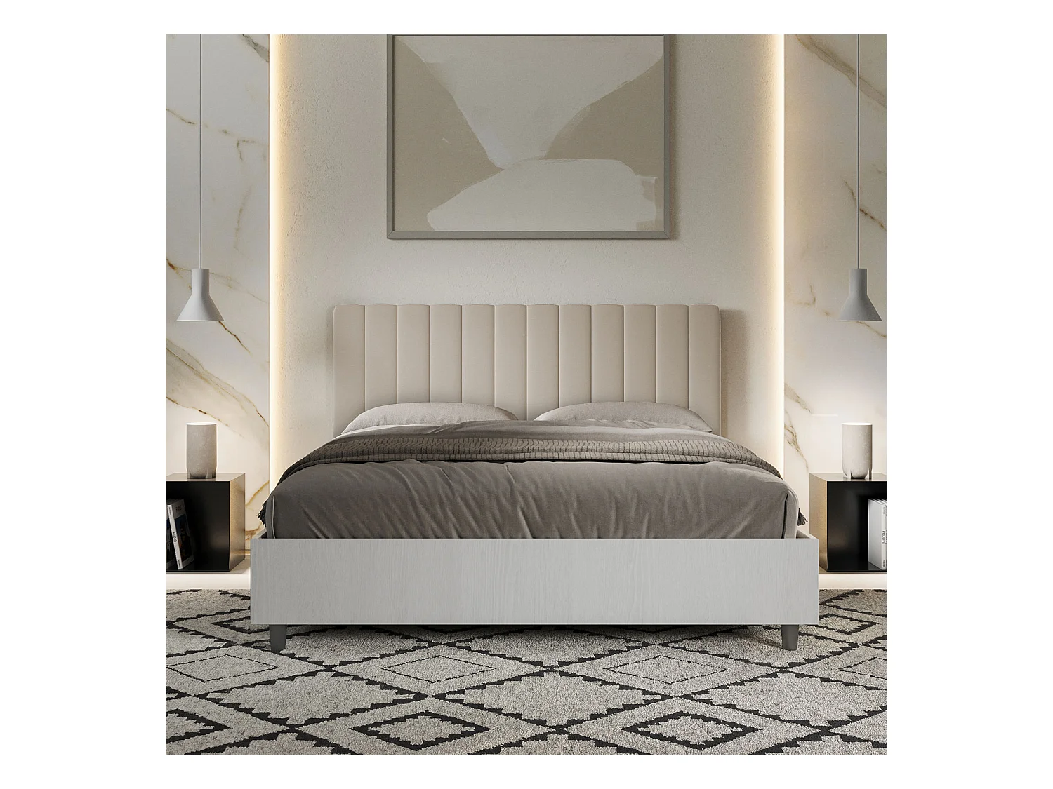 Cama contenedor 160x190 cabecero estructura fresno blanco melamina/piel gris tórtola Kaia