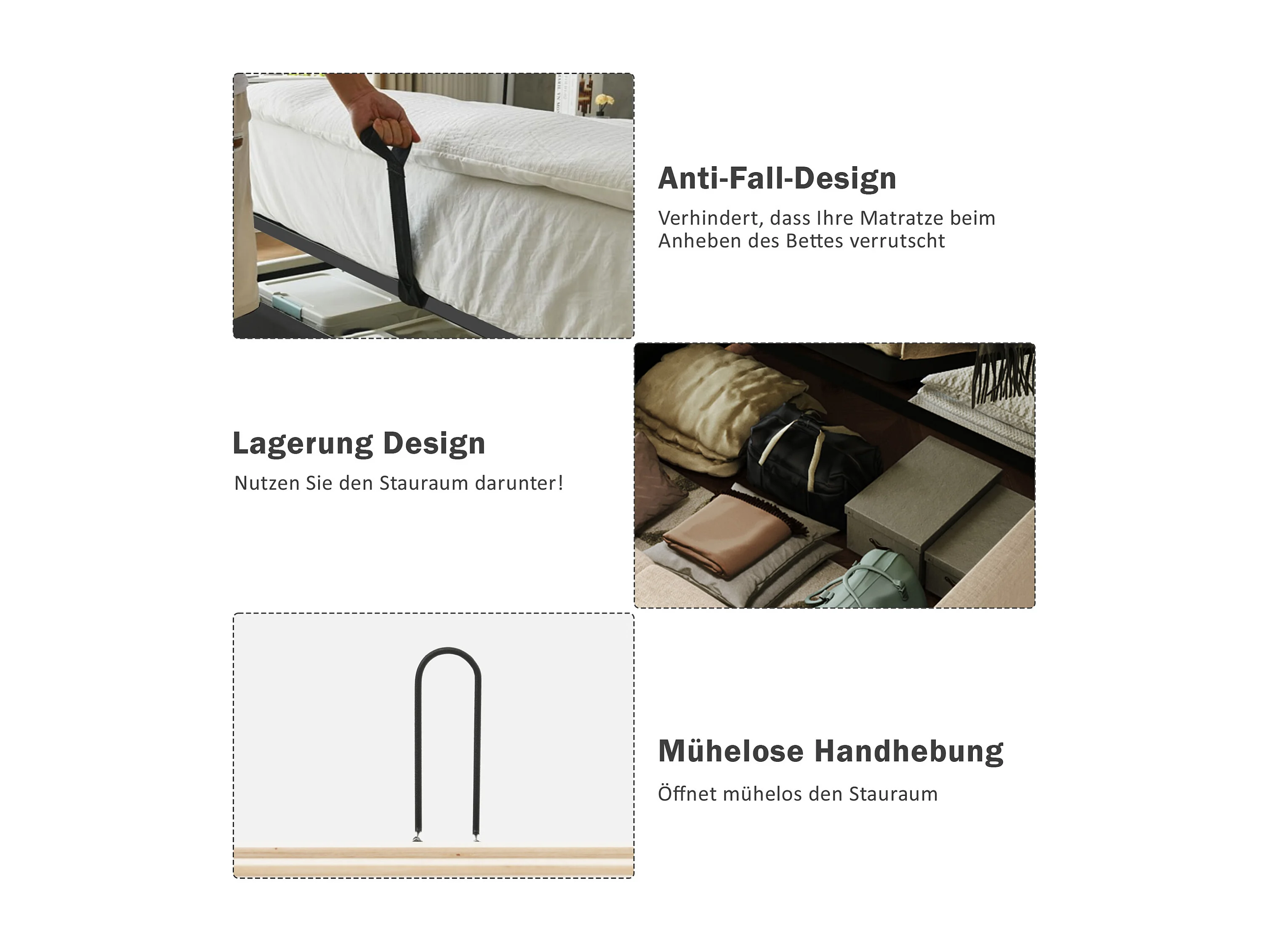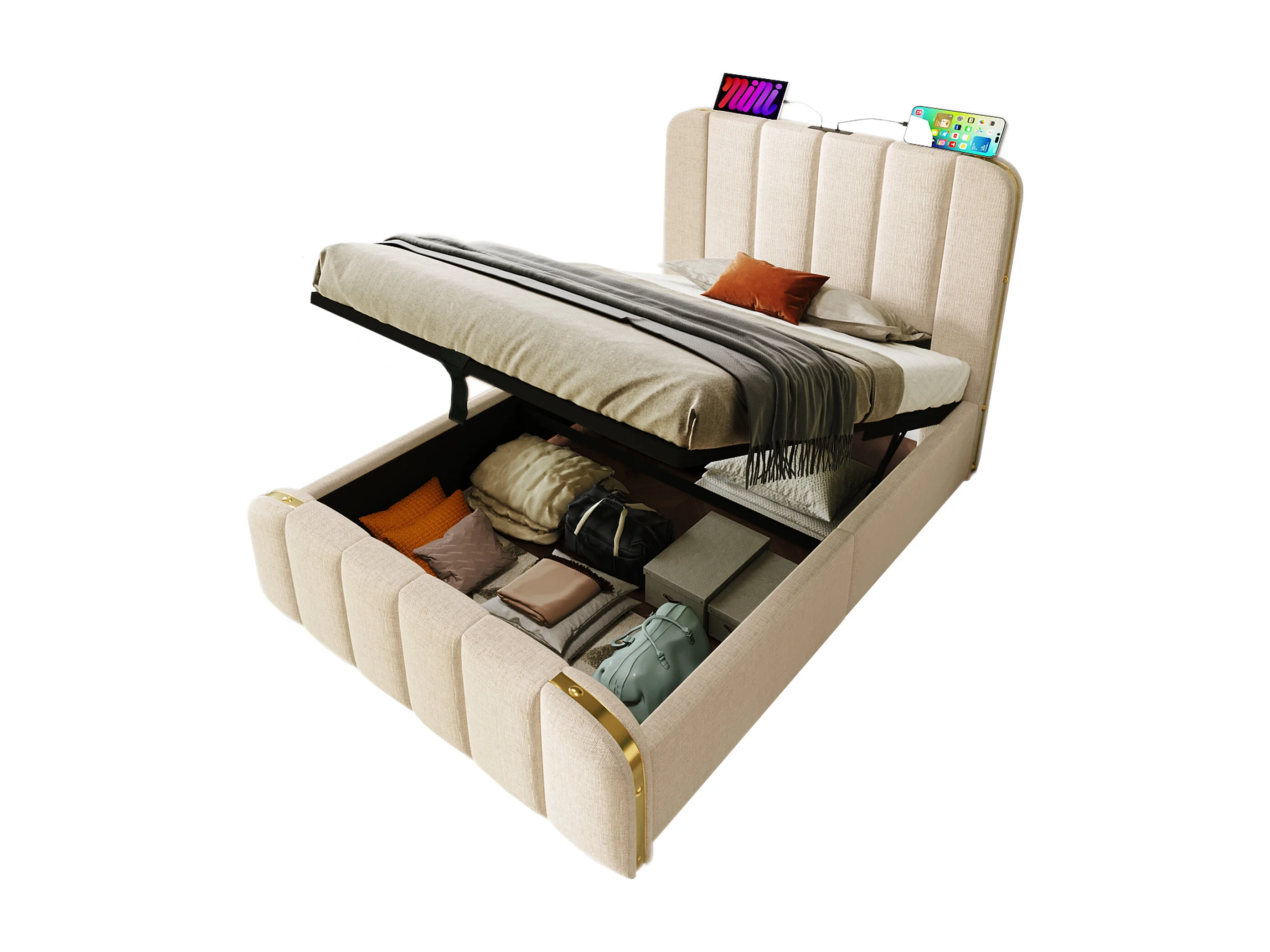 Cama contenedor 90 x 200 cm con cabecero - Toma USB tipo C - tejido de lino - beige (sin colchón)