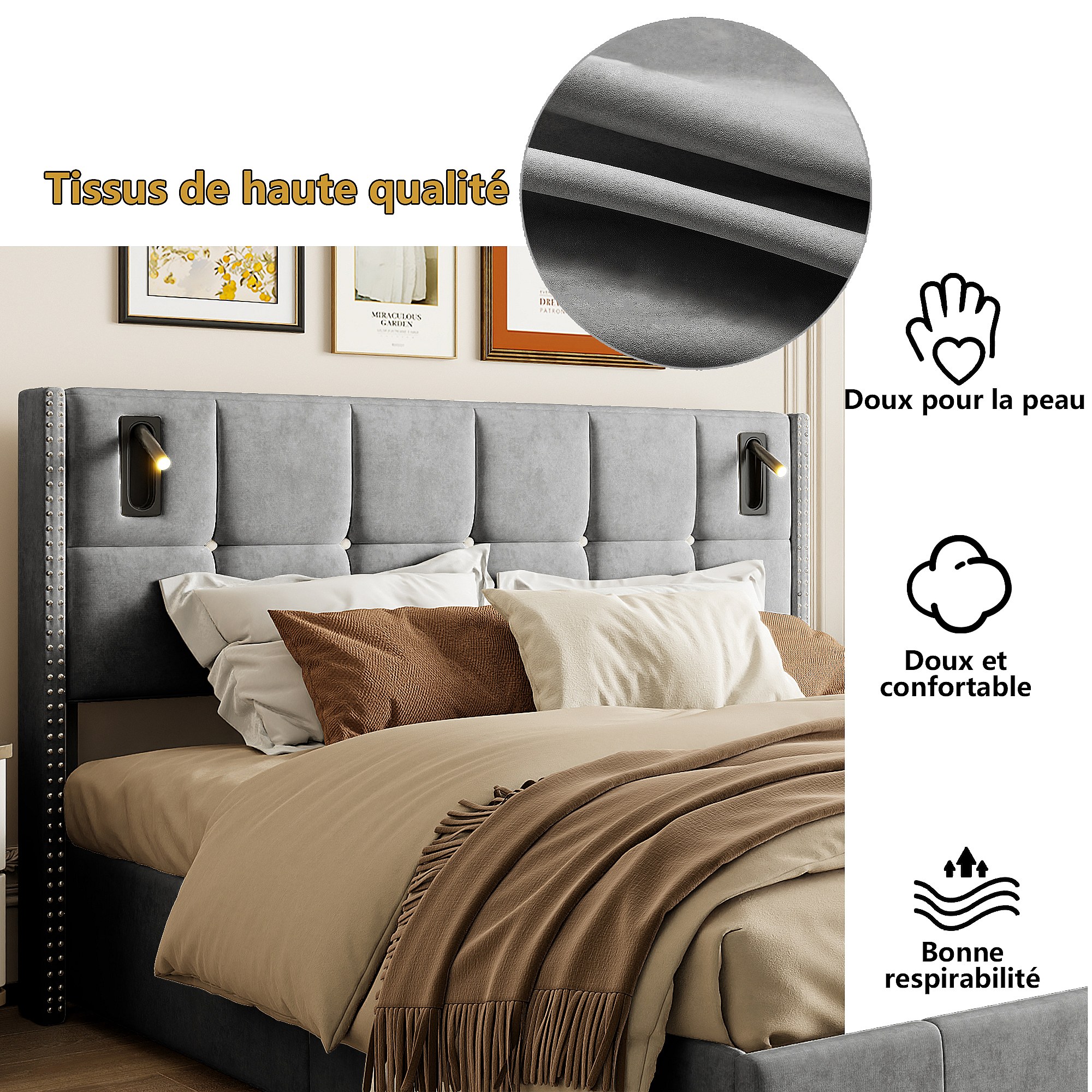 Cama de 140 x 200 cm con canapé, cama doble con luz de lectura, USB y función de almacenamiento, gris