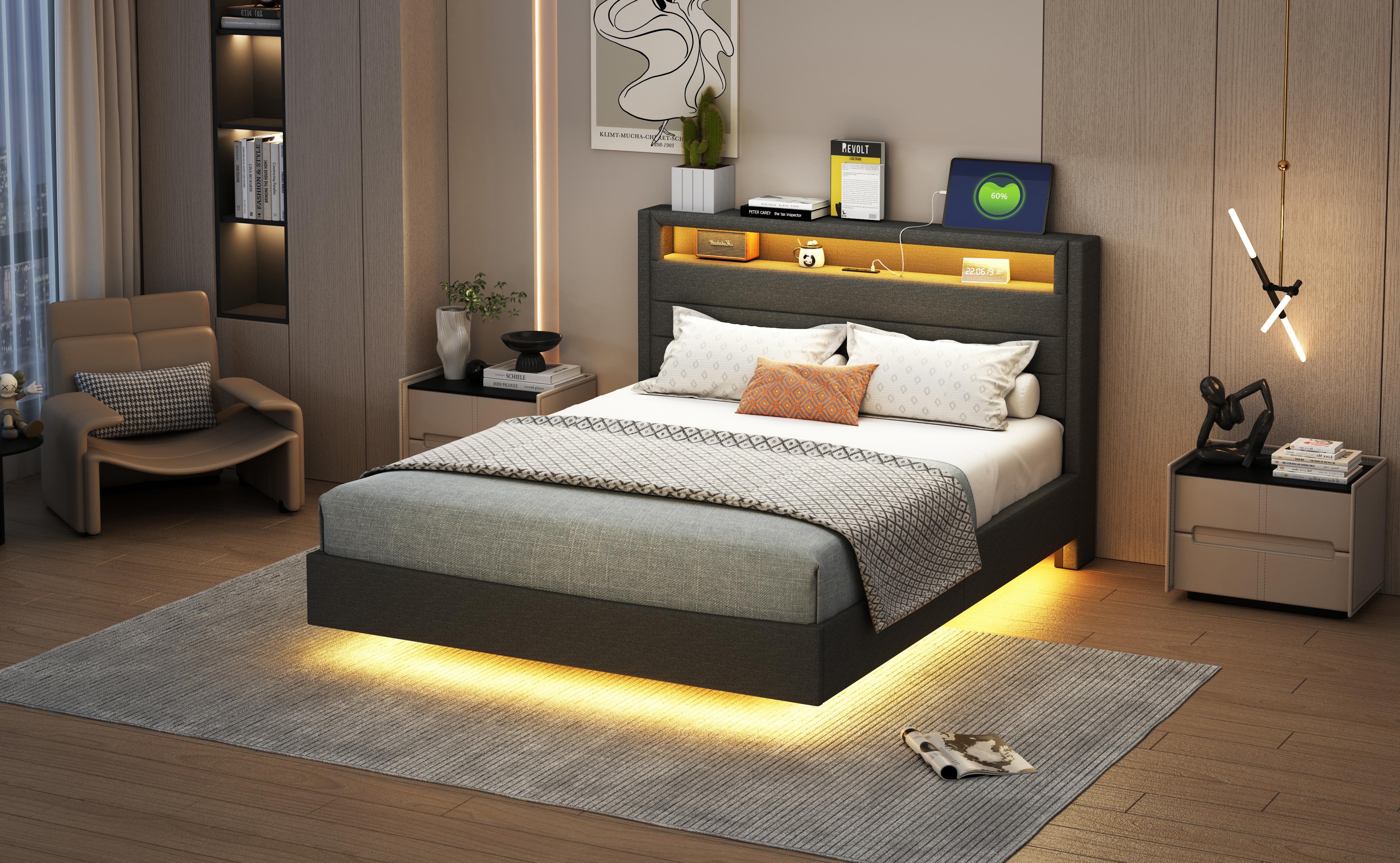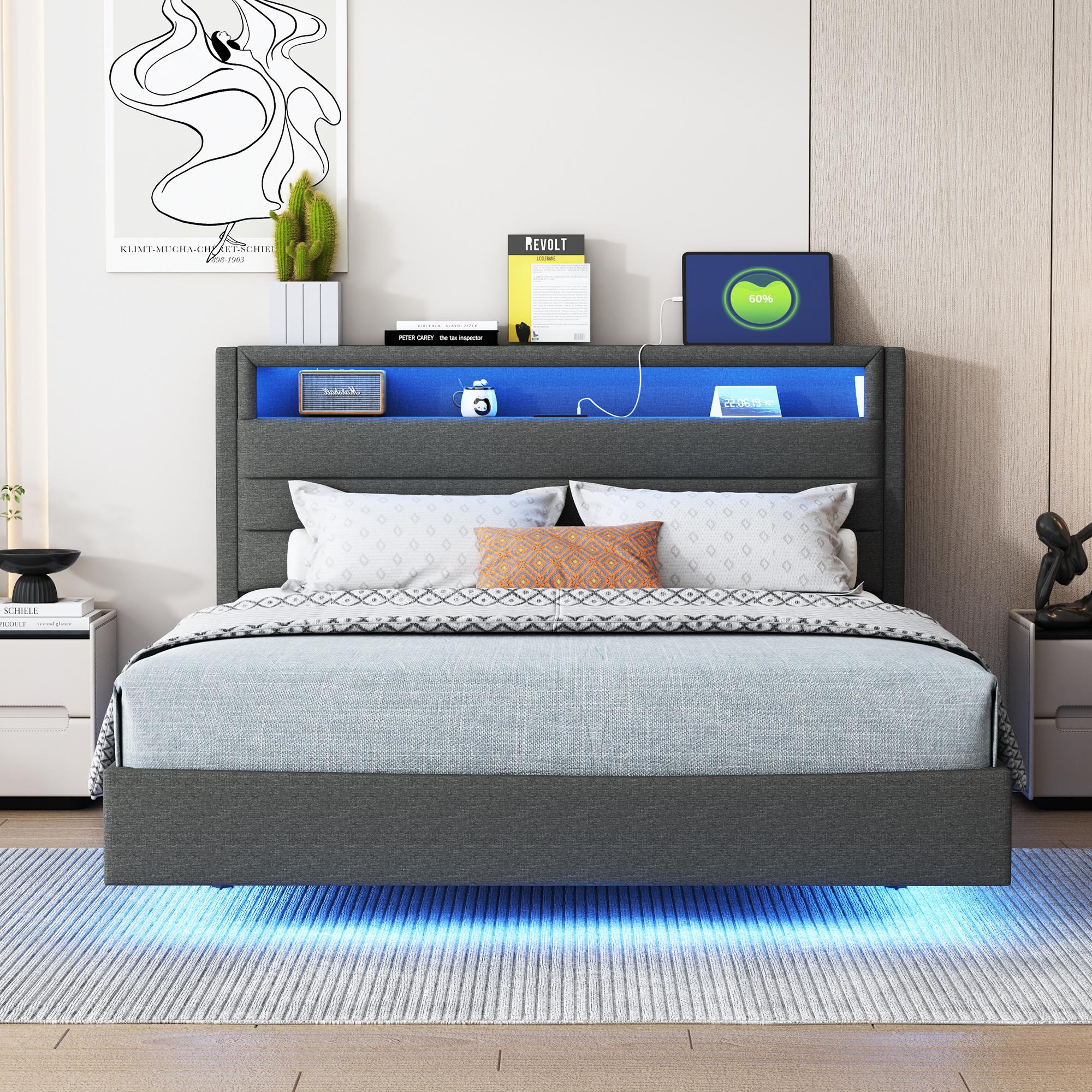 Cama flotante 140x200 cm, estructura hidráulica con almacenaje, cama multifuncional sin cabecero con iluminación LED, lino gris (201x161x31 cm)
