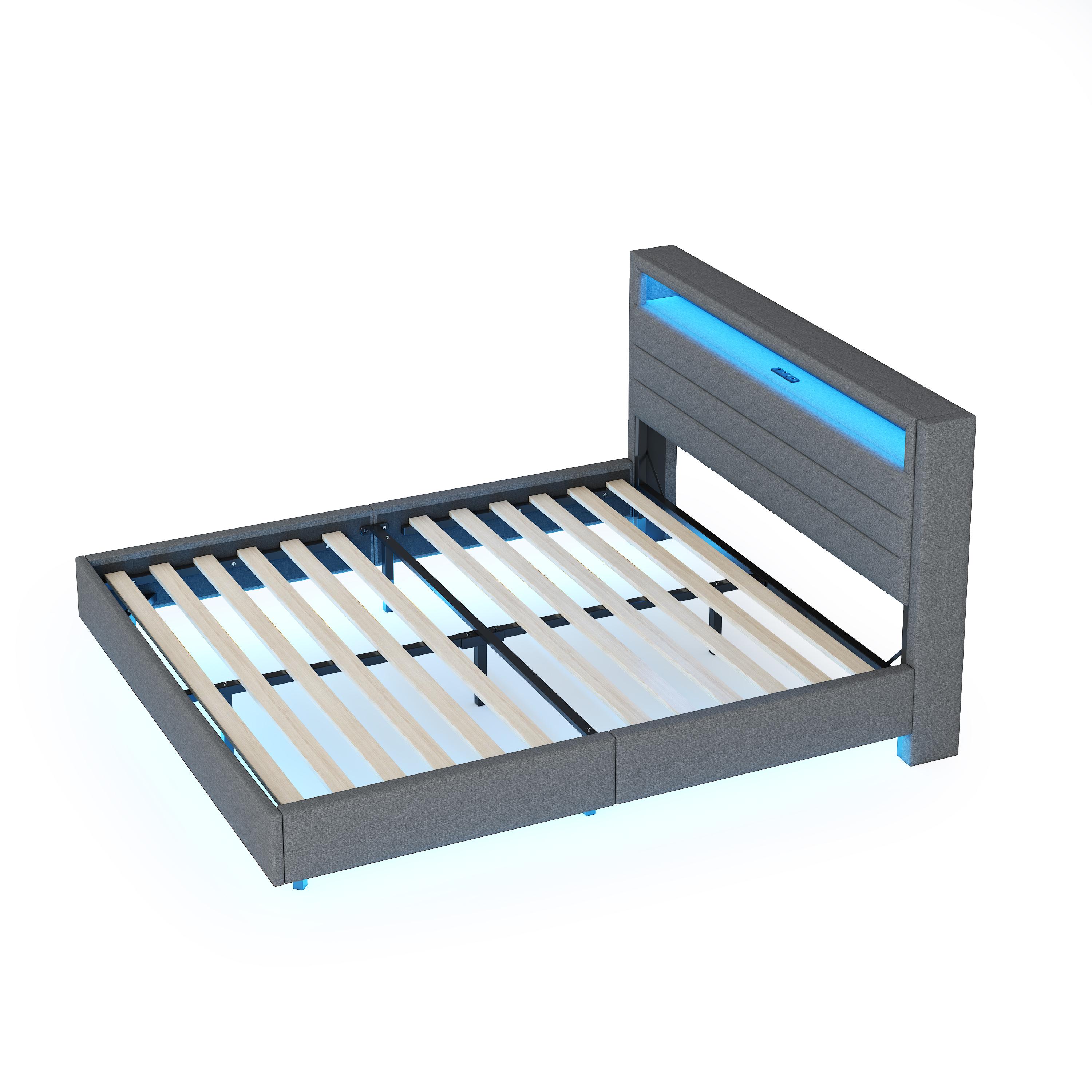 Cama 140x200 cm con puerto USB e iluminación LED de colores, tejido de lino, estructura modular con somier de láminas, color gris (203x164x100 cm)