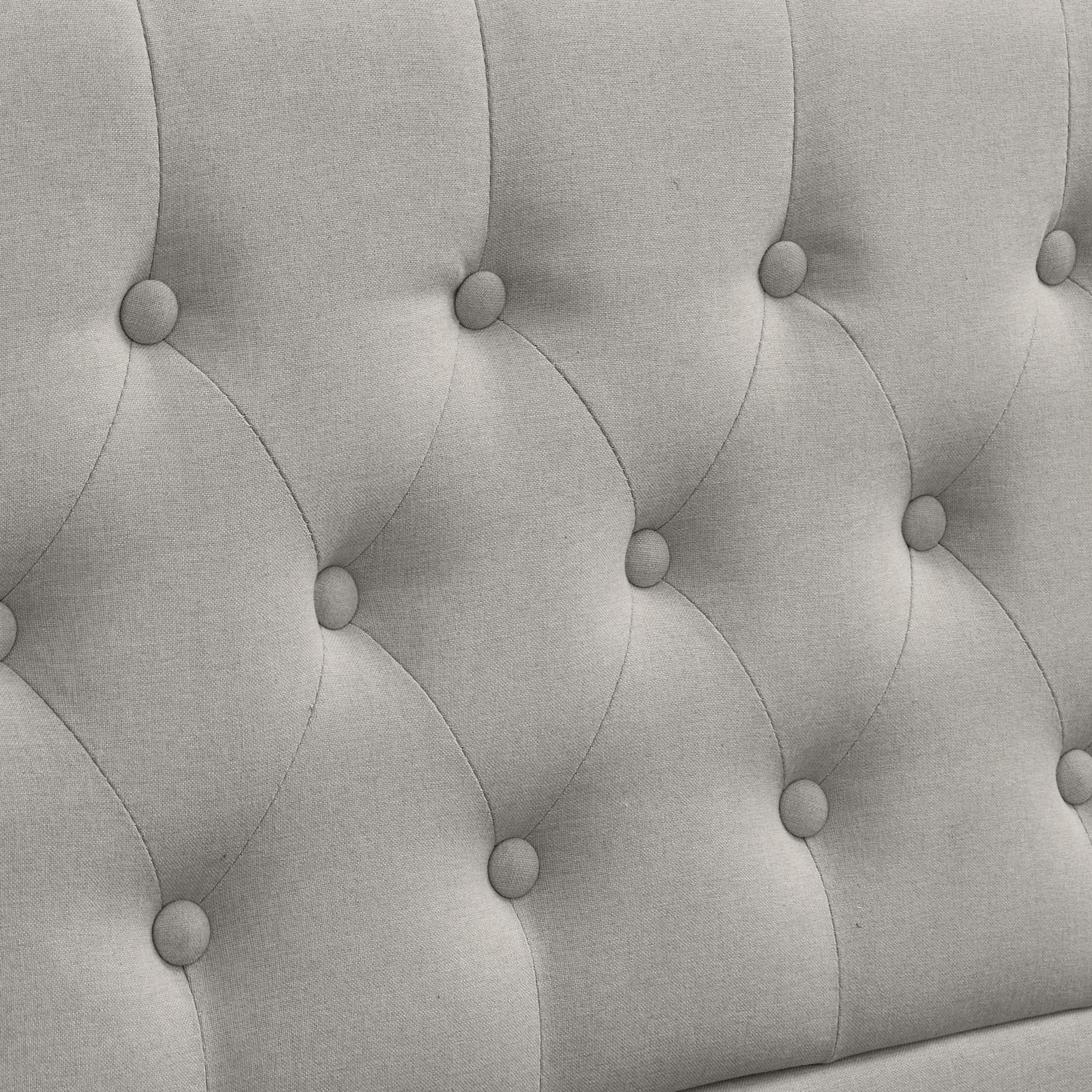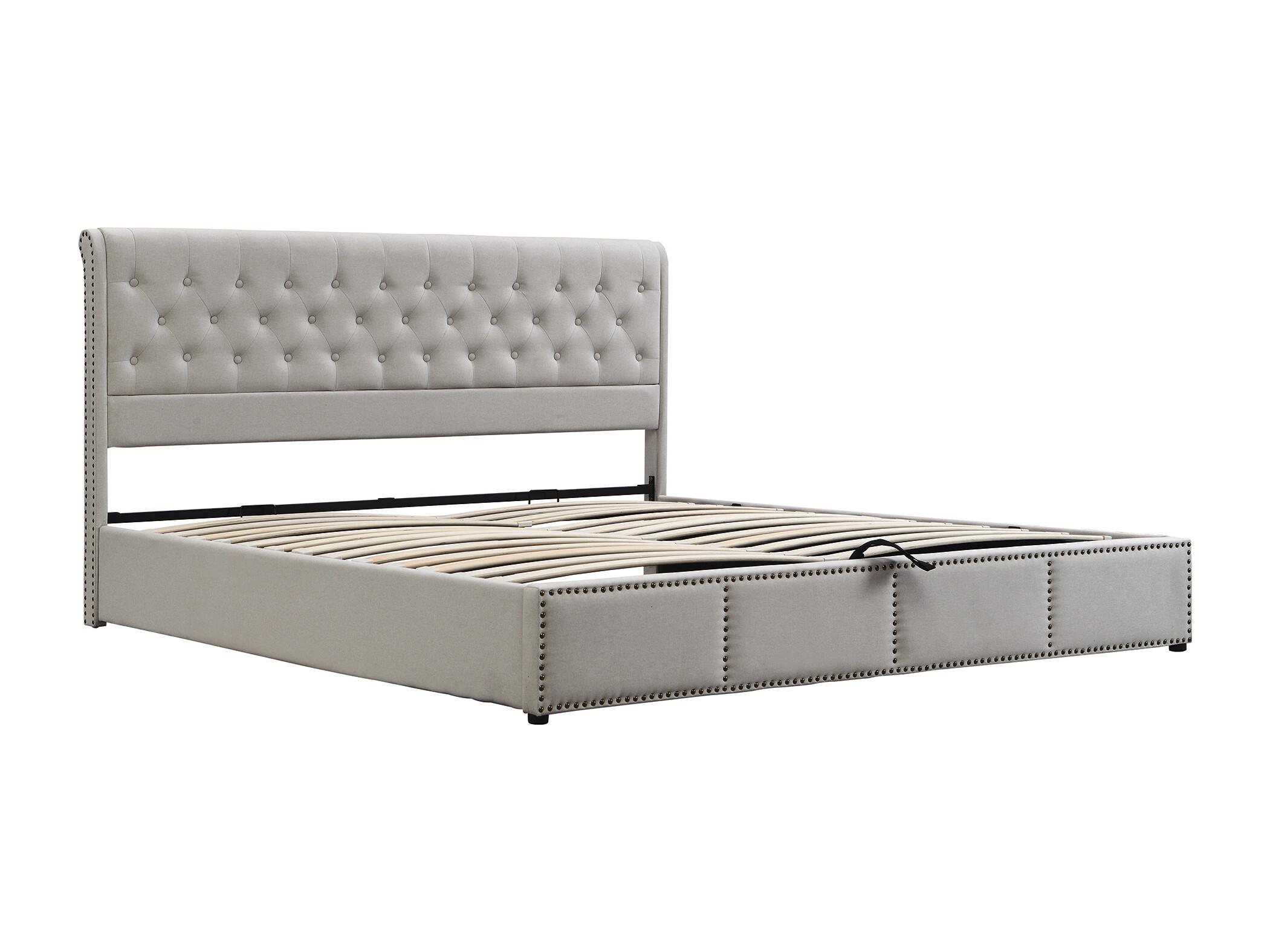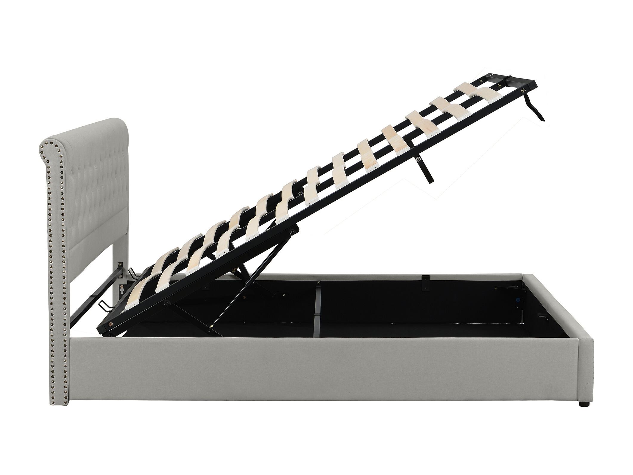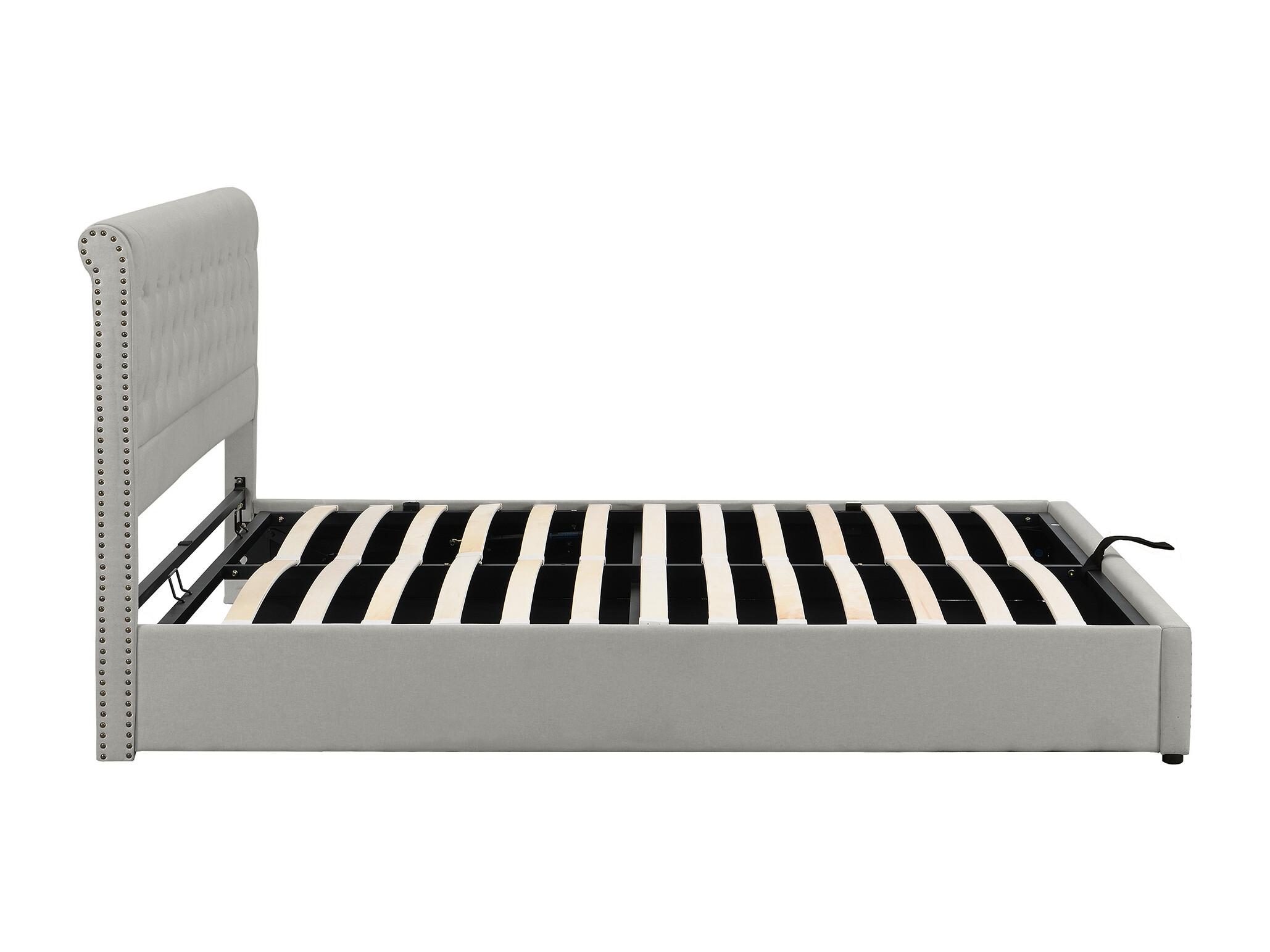 Cama de 140x200 cm en algodón-lino gris con cajón hidráulico y clavos decorativos.