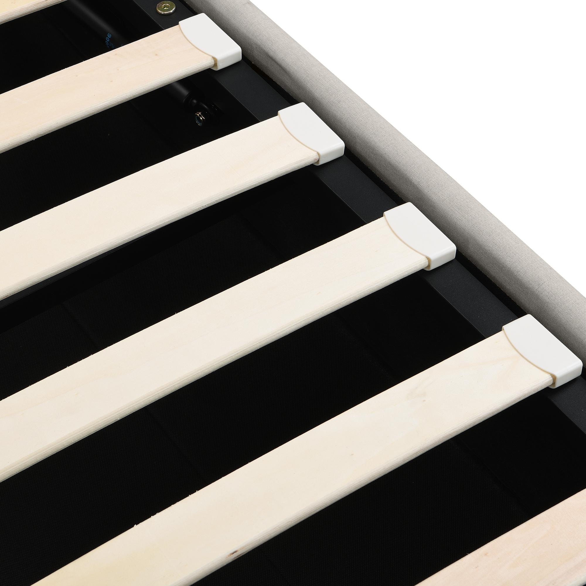 Cama doble con función de carga USB Tipo C, estructura de lino gris, base de madera, 140x200cm