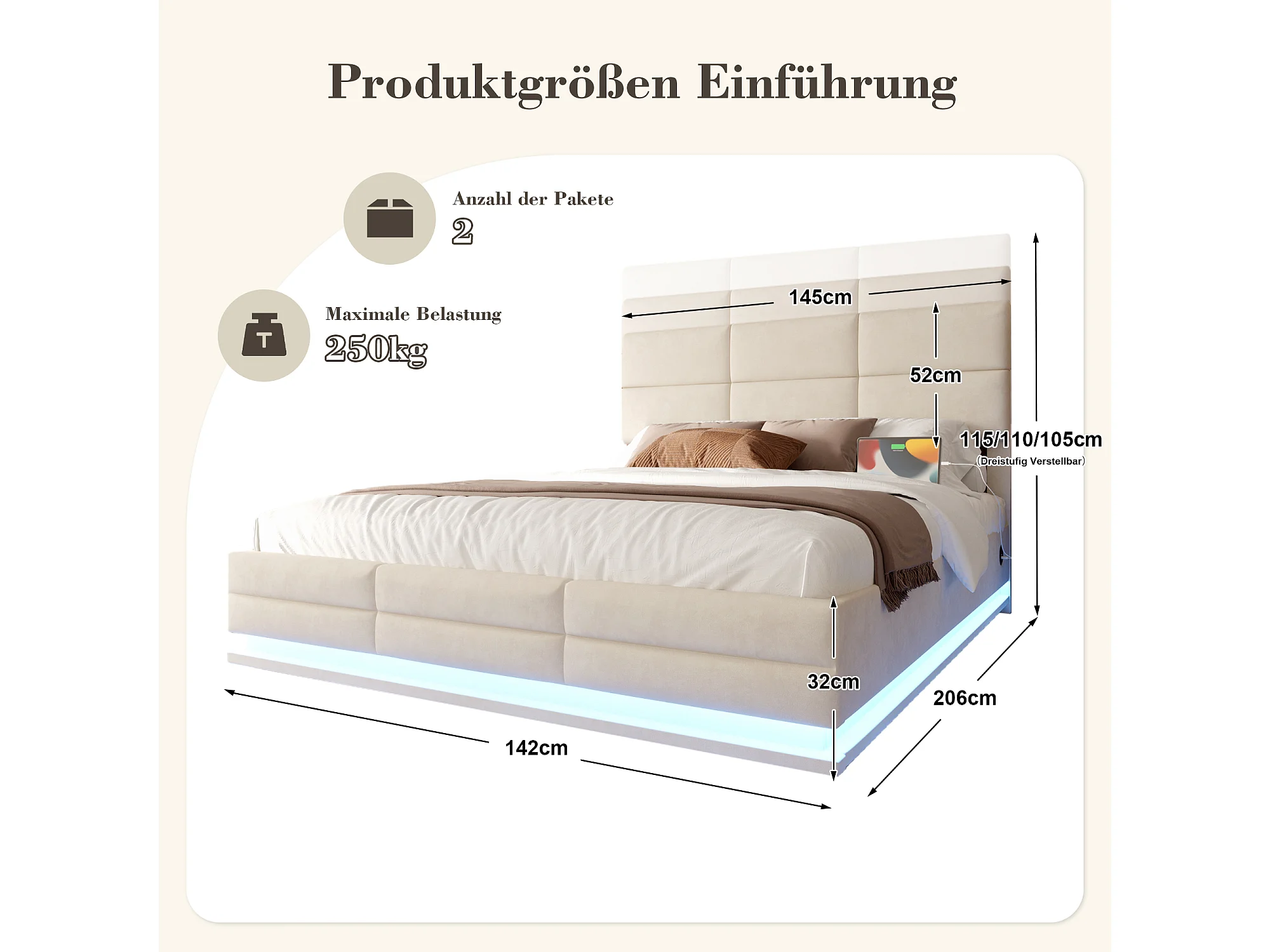 Cama doble 140x200 cm tapizada en blanco roto, con LED, 4 cajones de almacenaje, cabecero regulable, caja de almacenamiento y somier de láminas