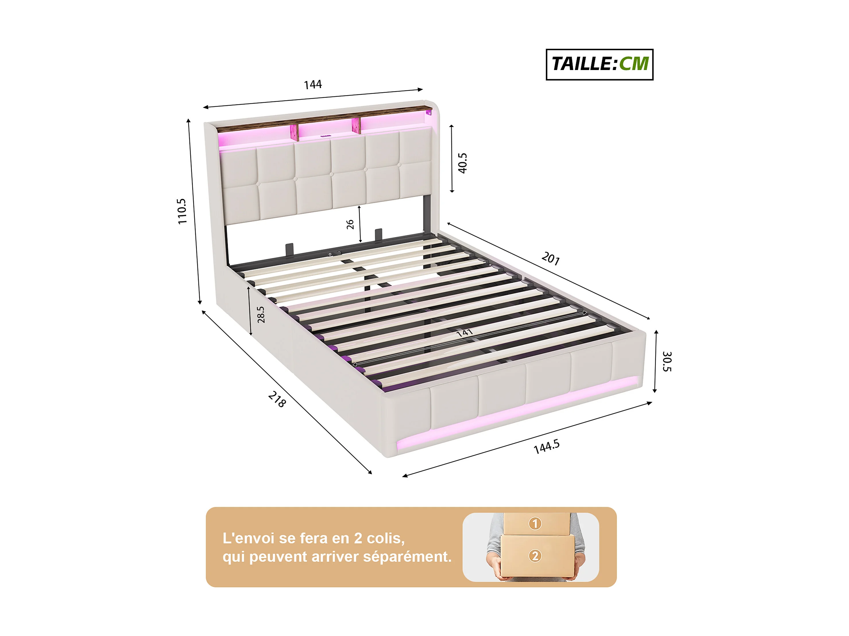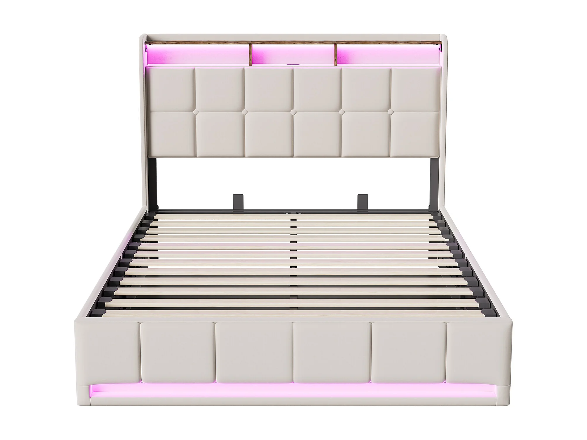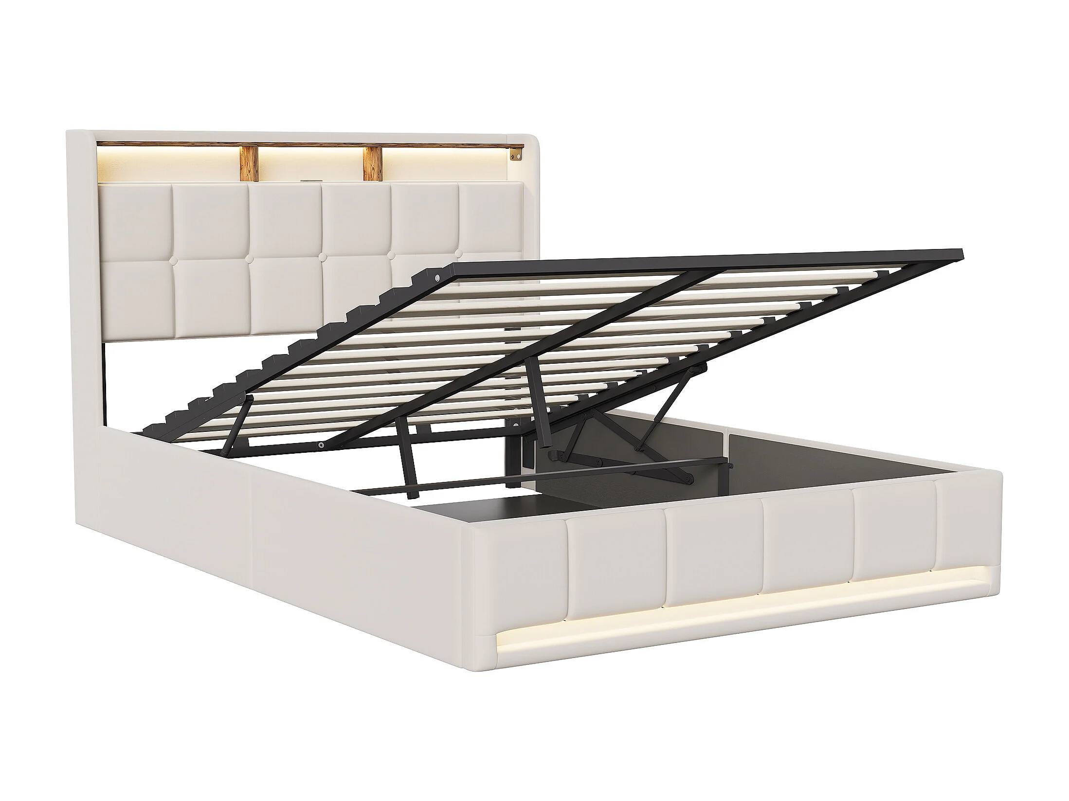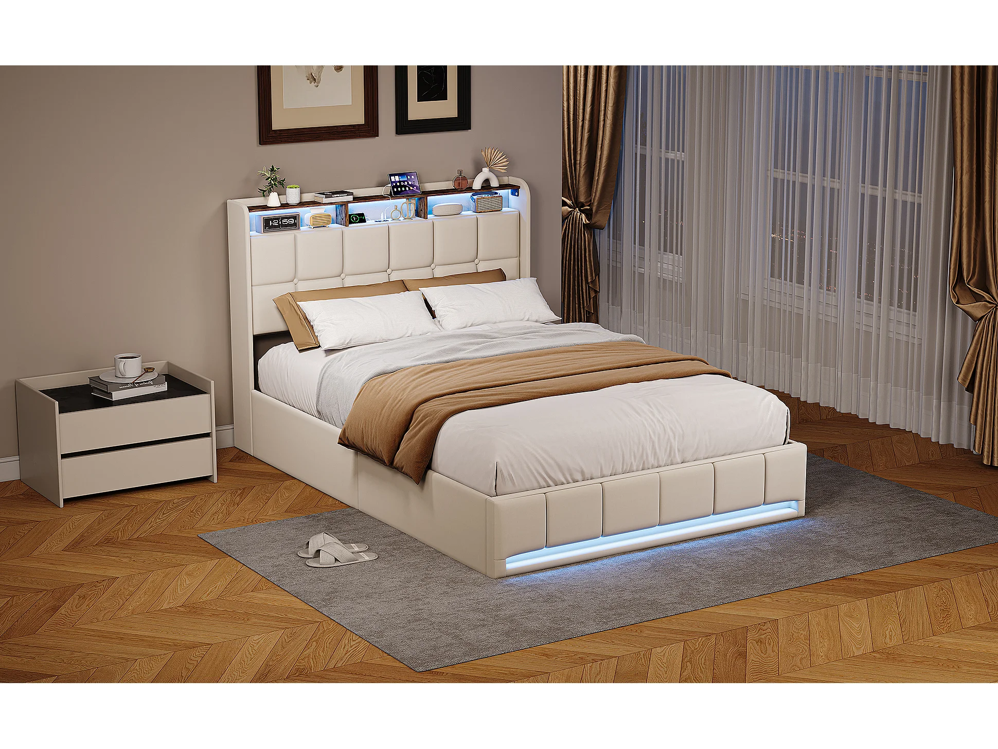 Cama de 140x200cm con almacenamiento, LED, puerto USB y puerto Tipo-C, cama doble tapizada con almacenamiento, estructura de cama, base de láminas, lino, beige