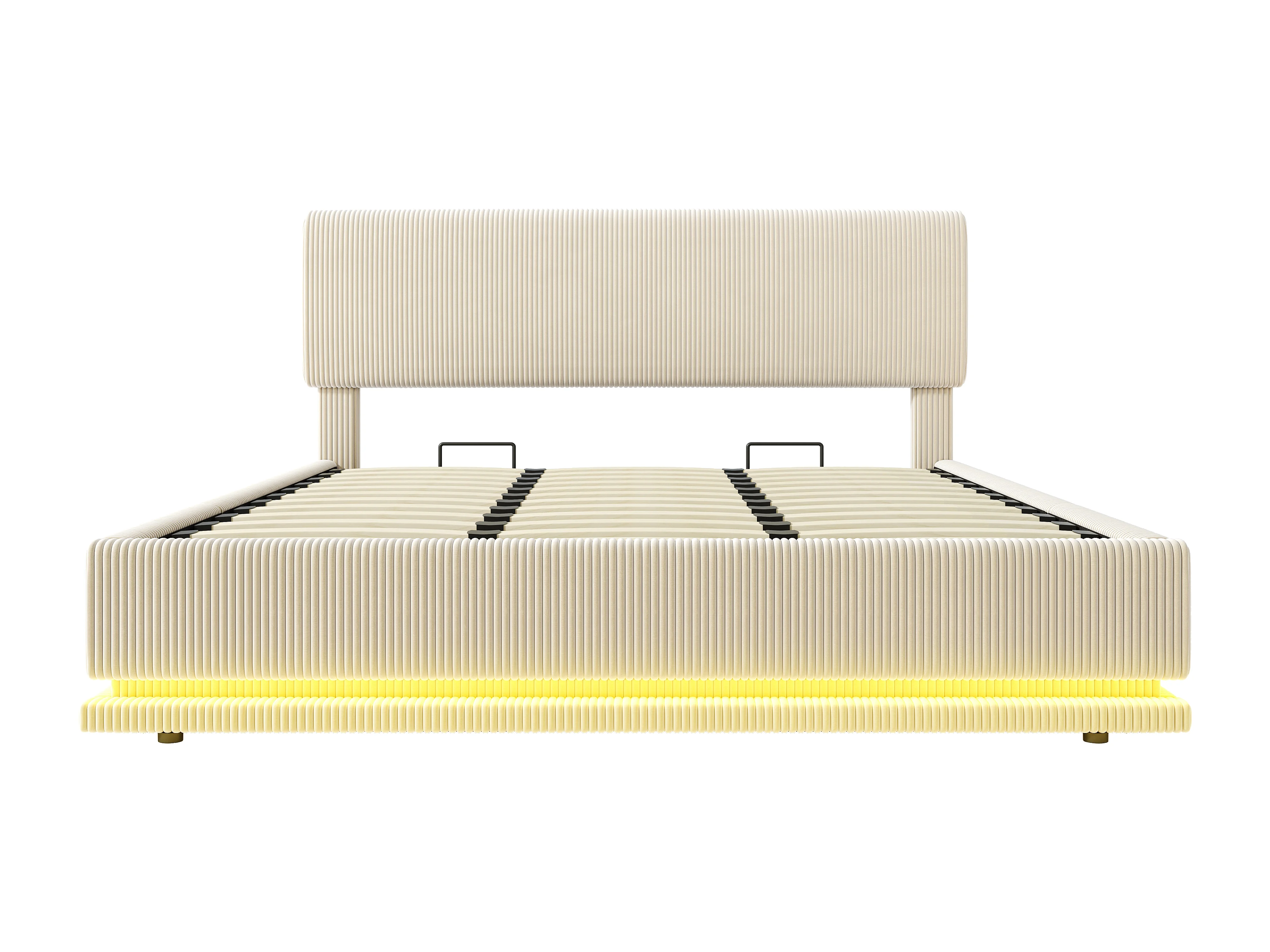 Cama de 180 x 200 cm con almacenaje en pana beige - Cama doble para adultos con cabecero ajustable, iluminación LED y puertos USB