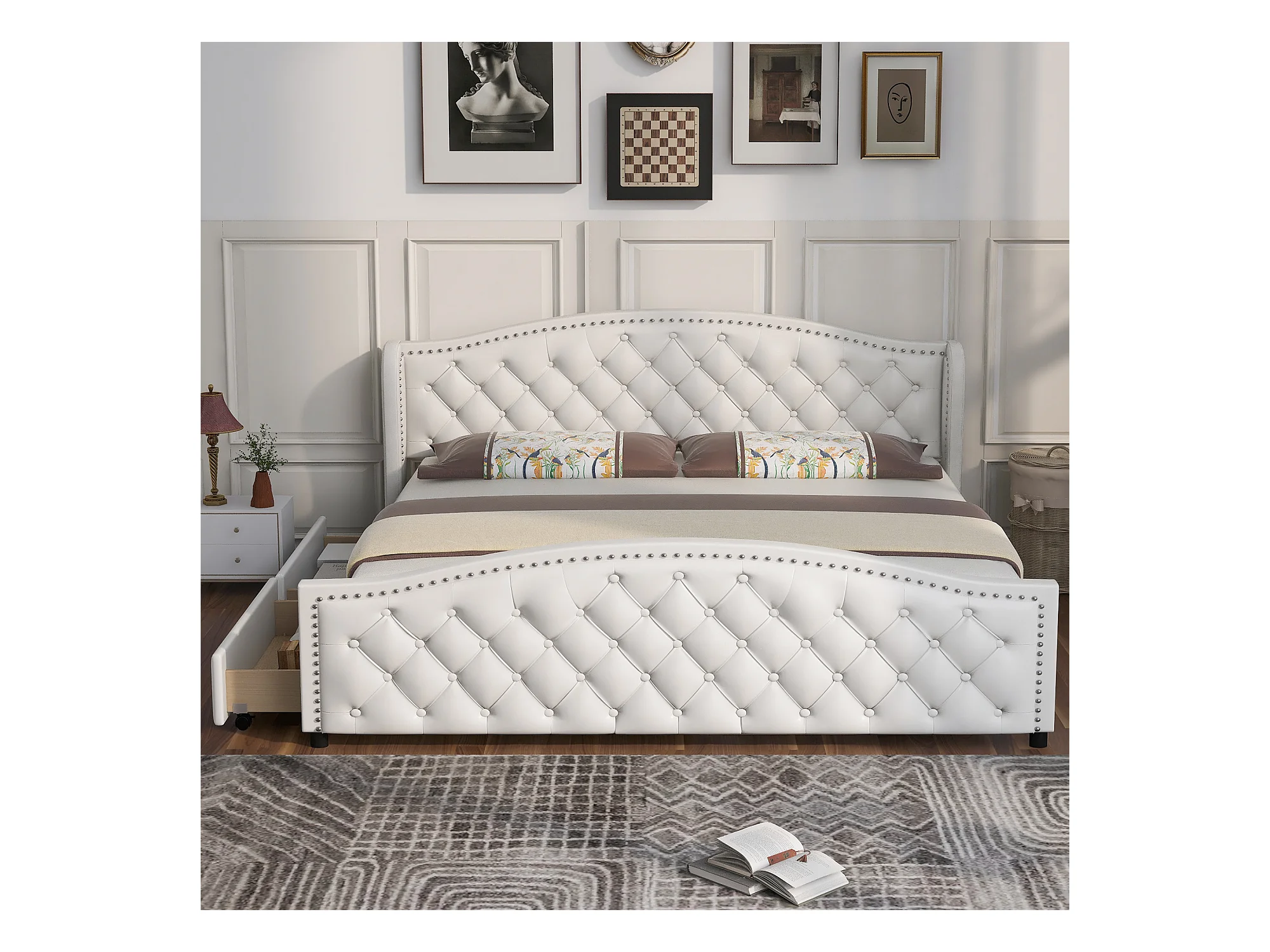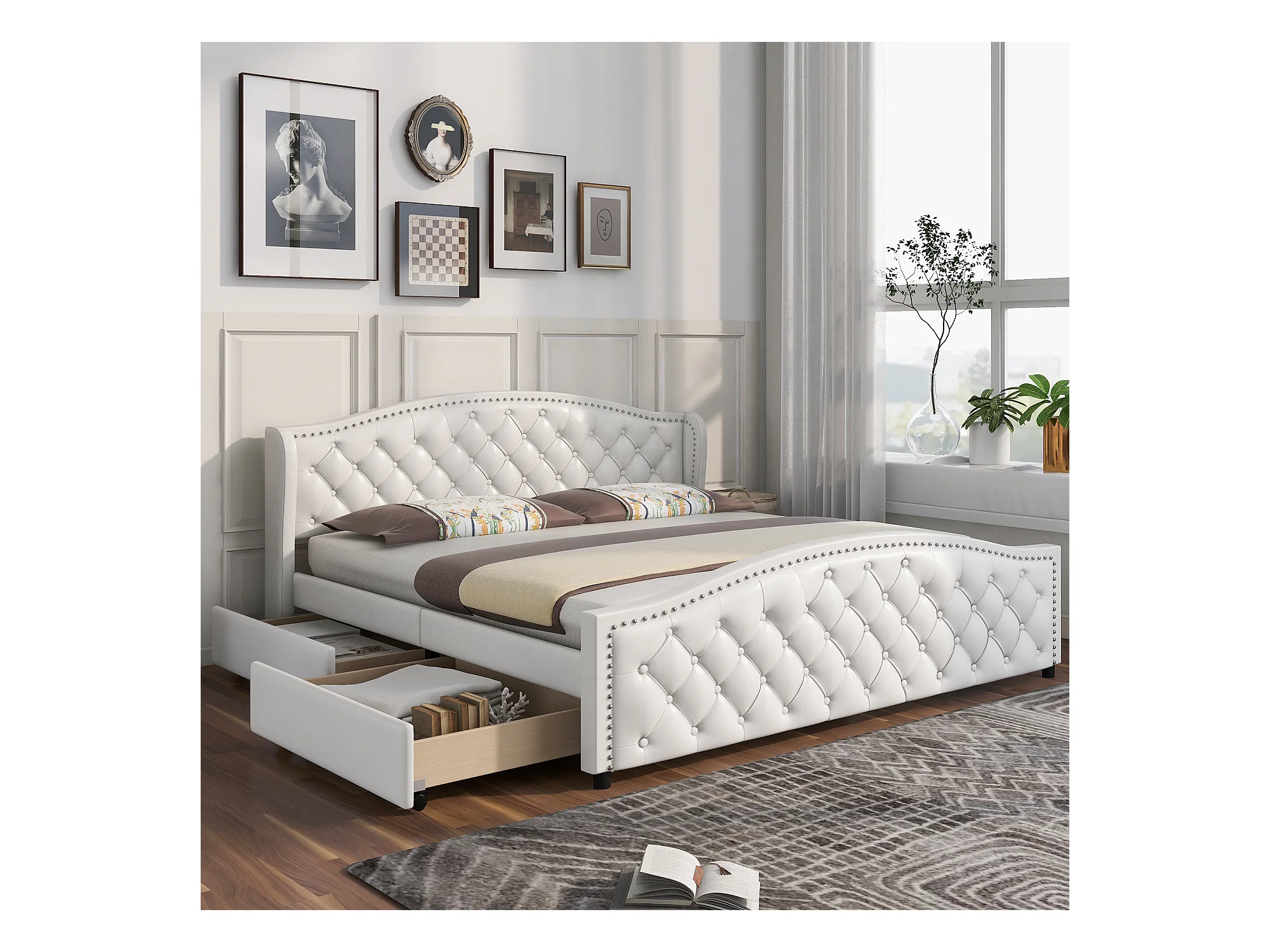 Cama de 180x200 cm en PU blanco con cabecero alto y 2 cajones de almacenaje, somier de láminas