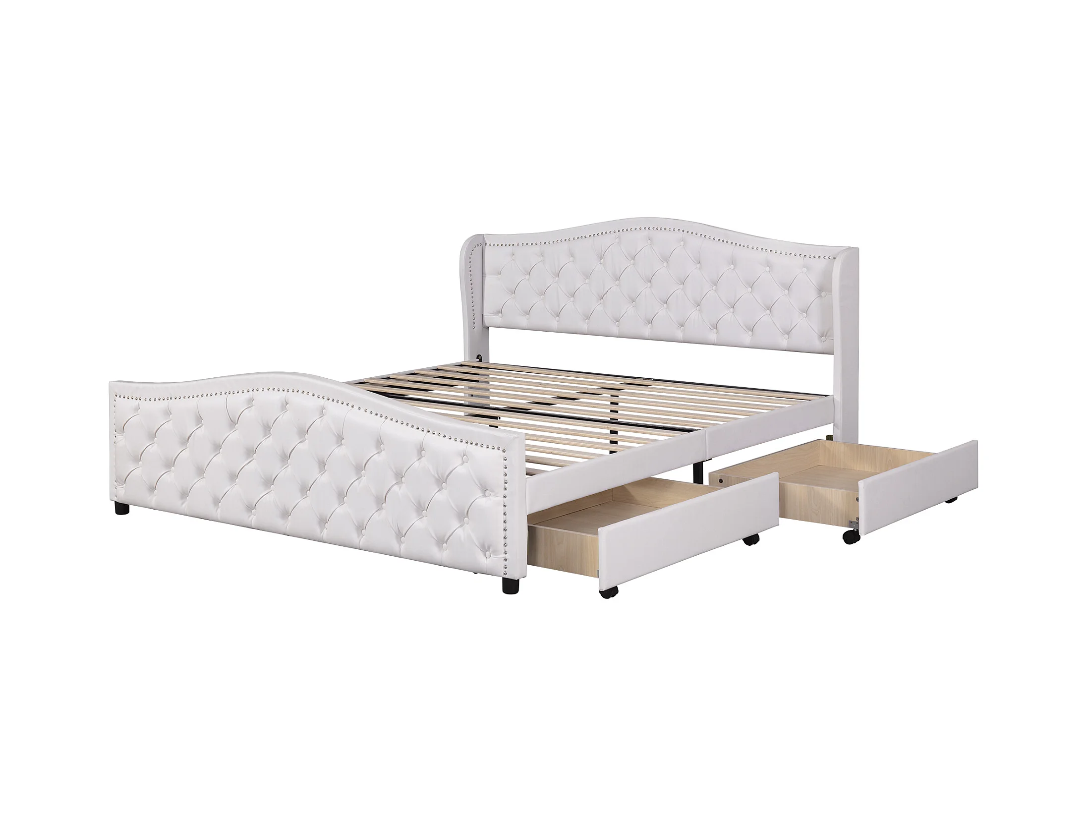 Cama tapizada 180x200 cm - cama doble con 2 cajones de almacenaje - somier de láminas de madera - PU blanco