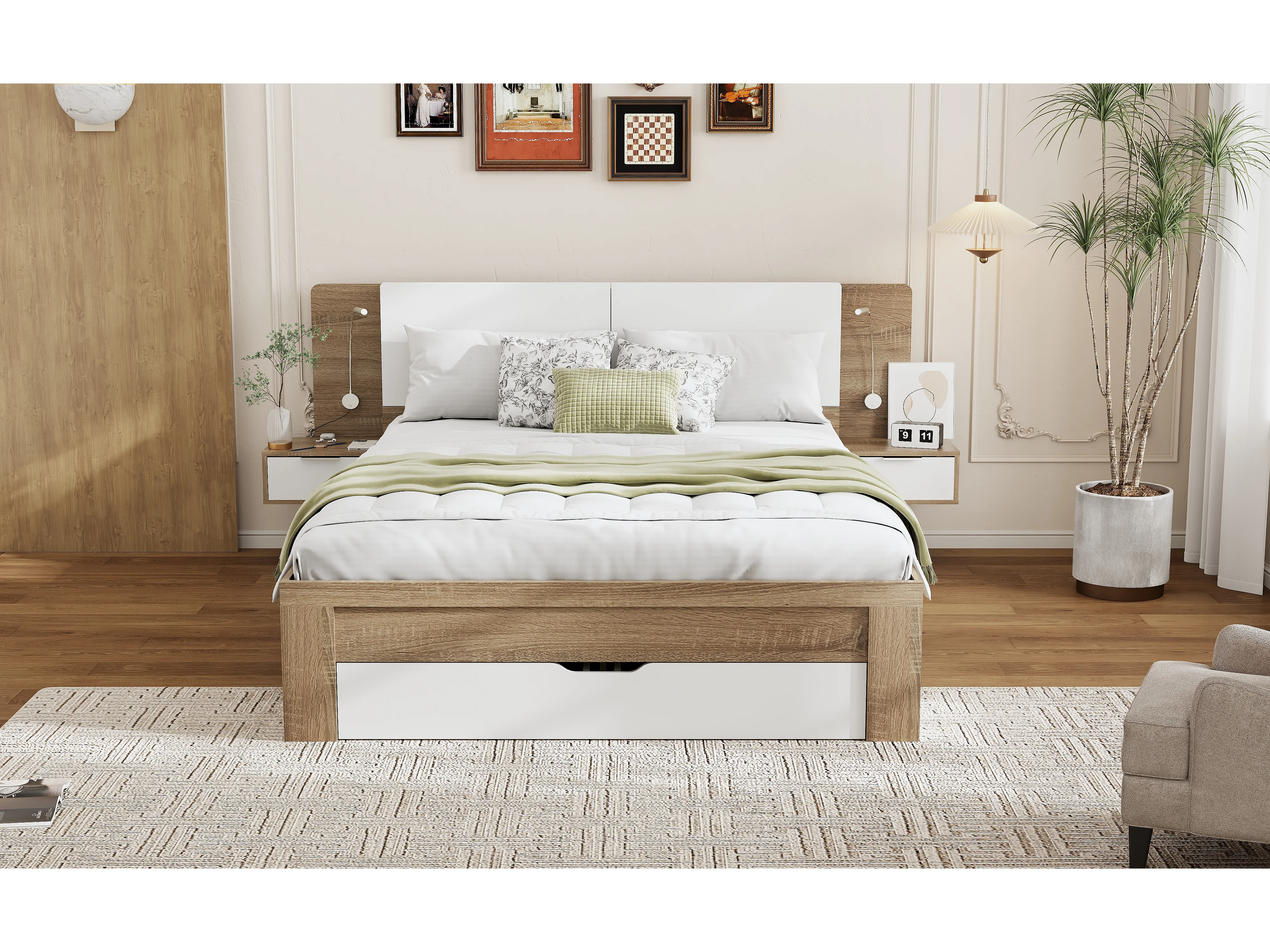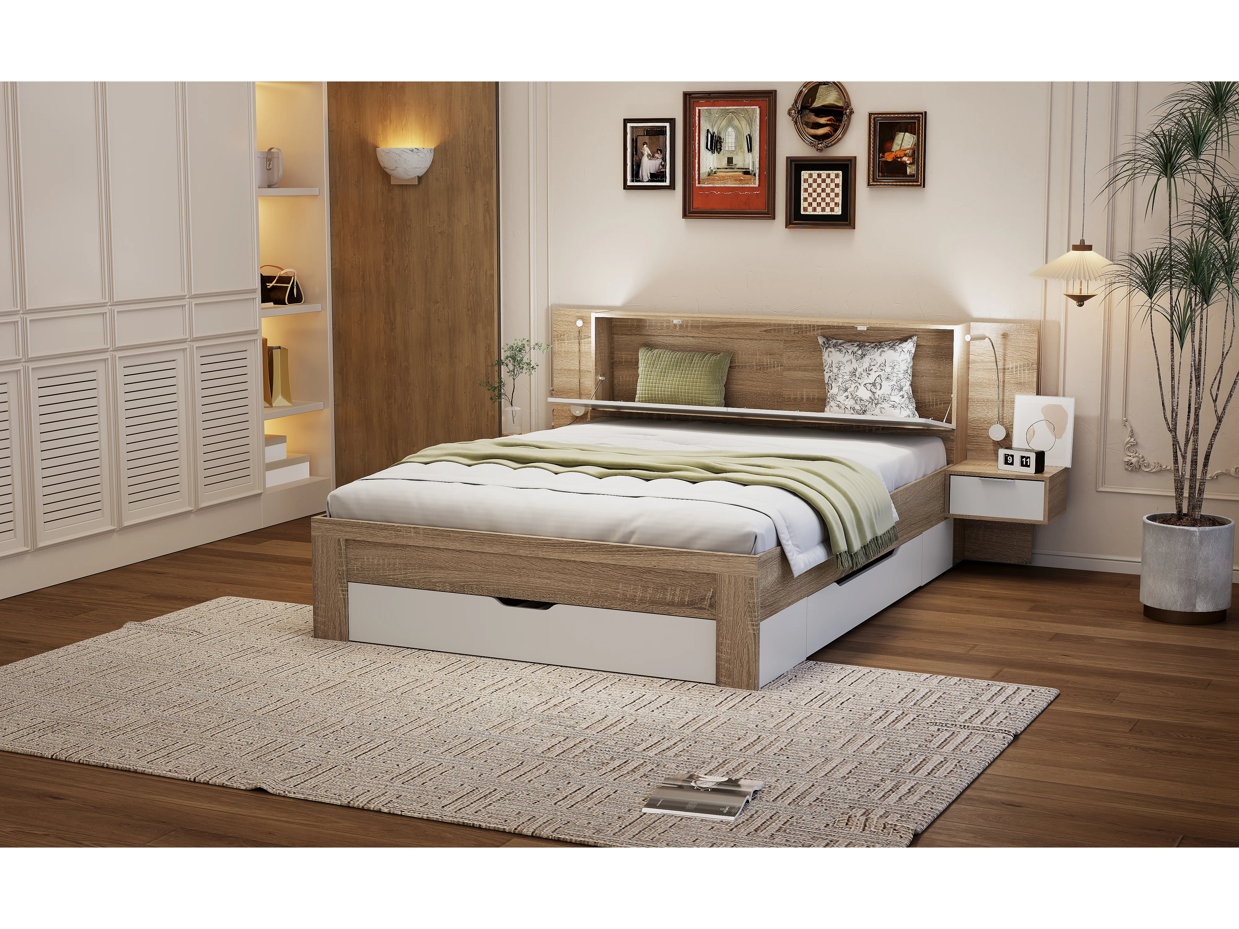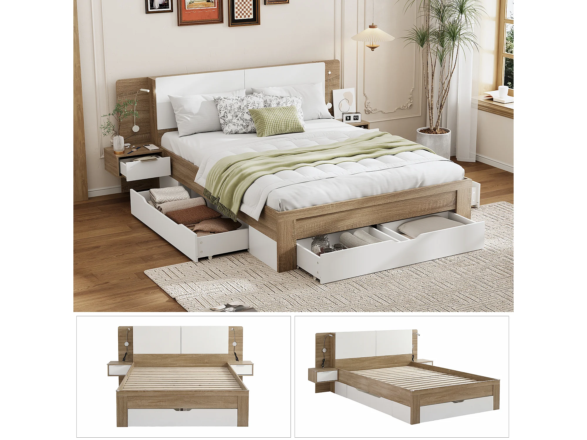 Cama de adulto 140 x 200 cm - 2 mesitas de noche + 4 cajones grandes y almacenaje - Madera MDF - Roble