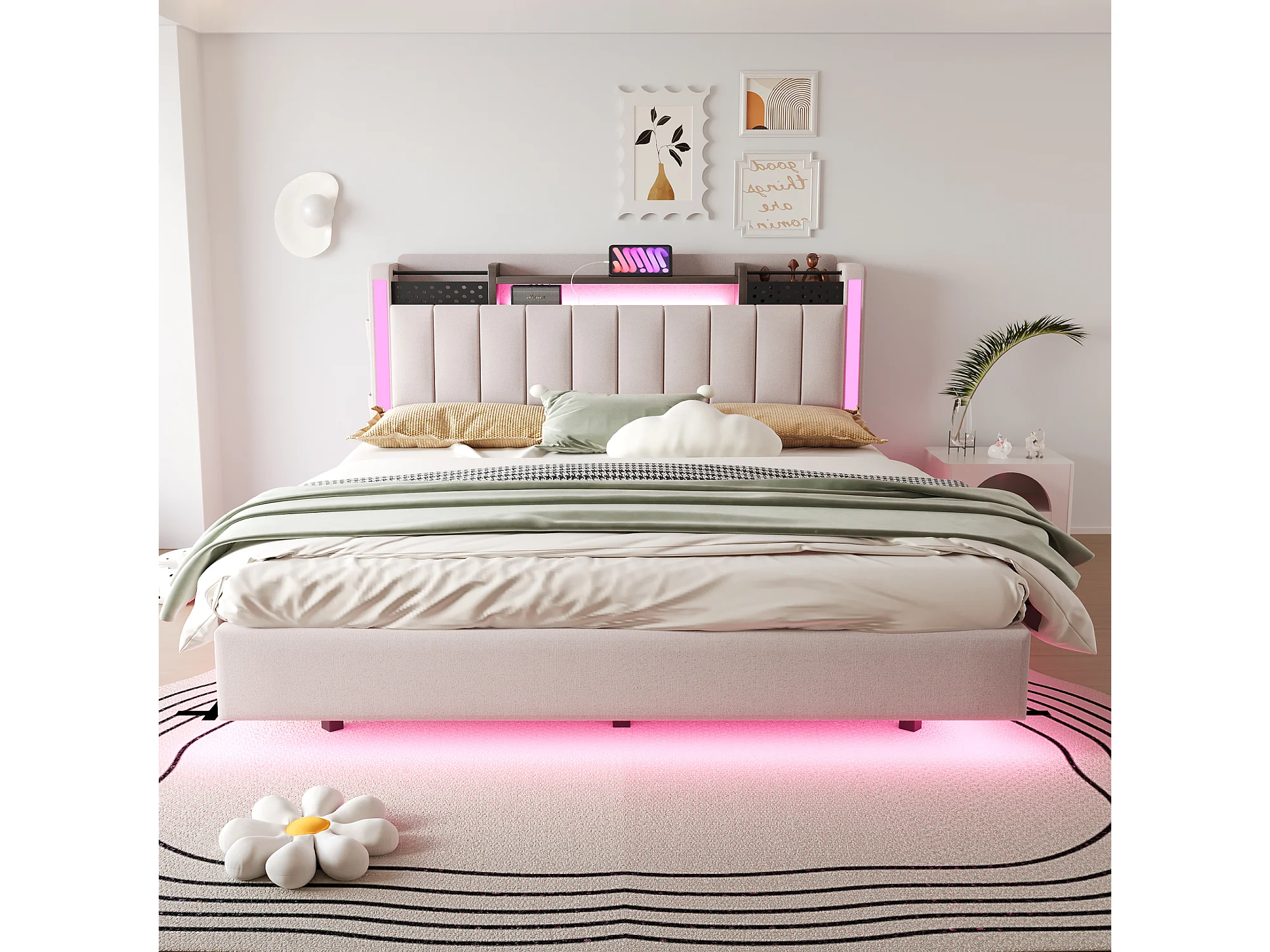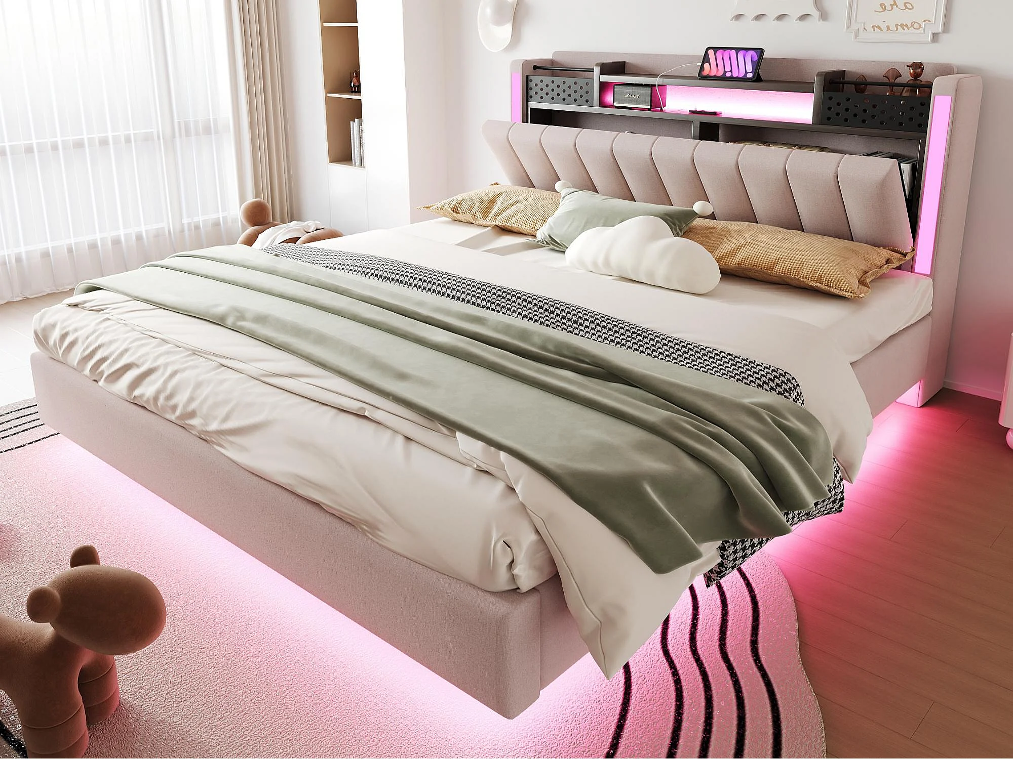 Cama acolchada 160x200cm - Cabecero multifuncional - con luz LED y puerto USB - diseño flotante - Beige