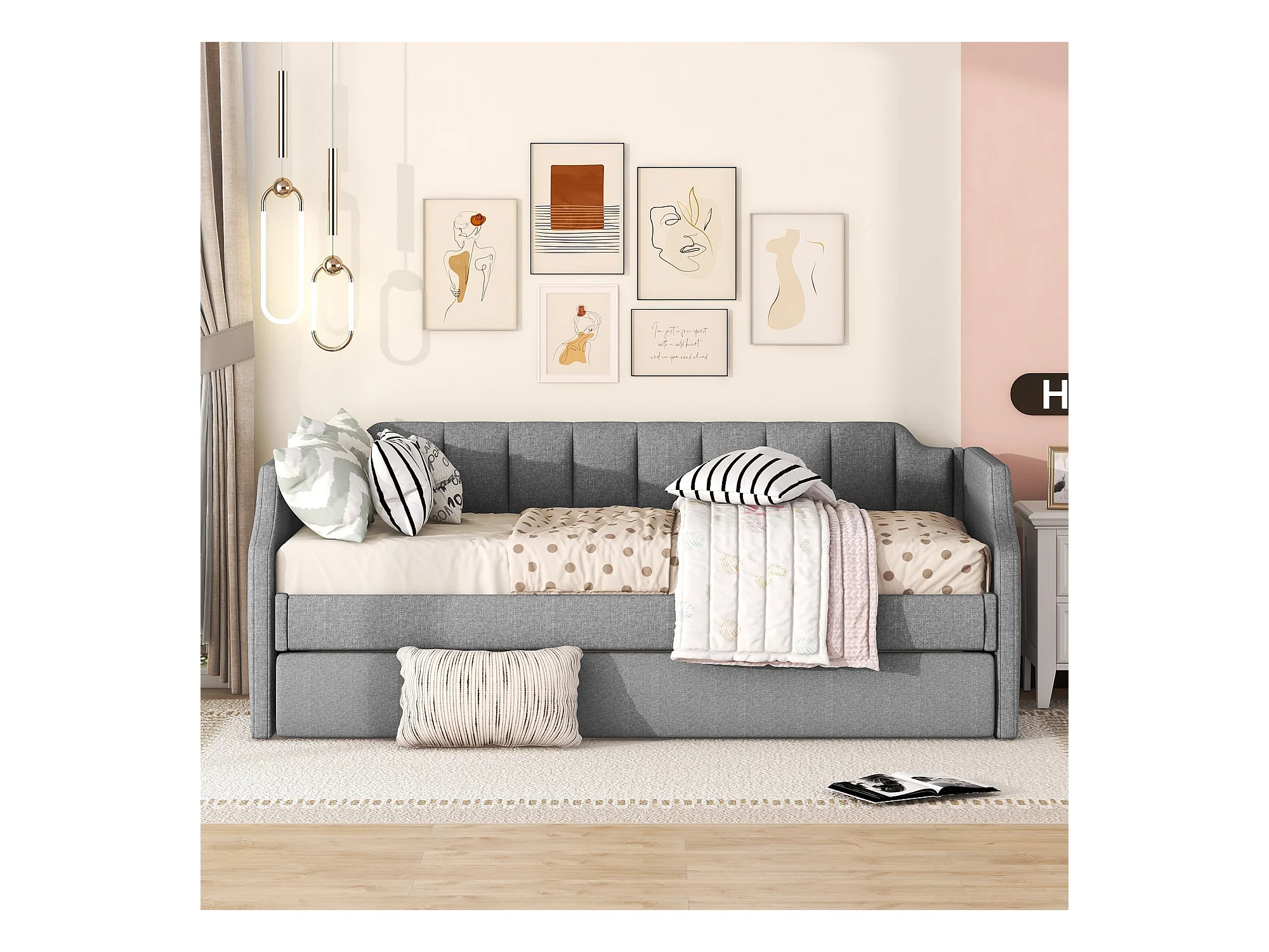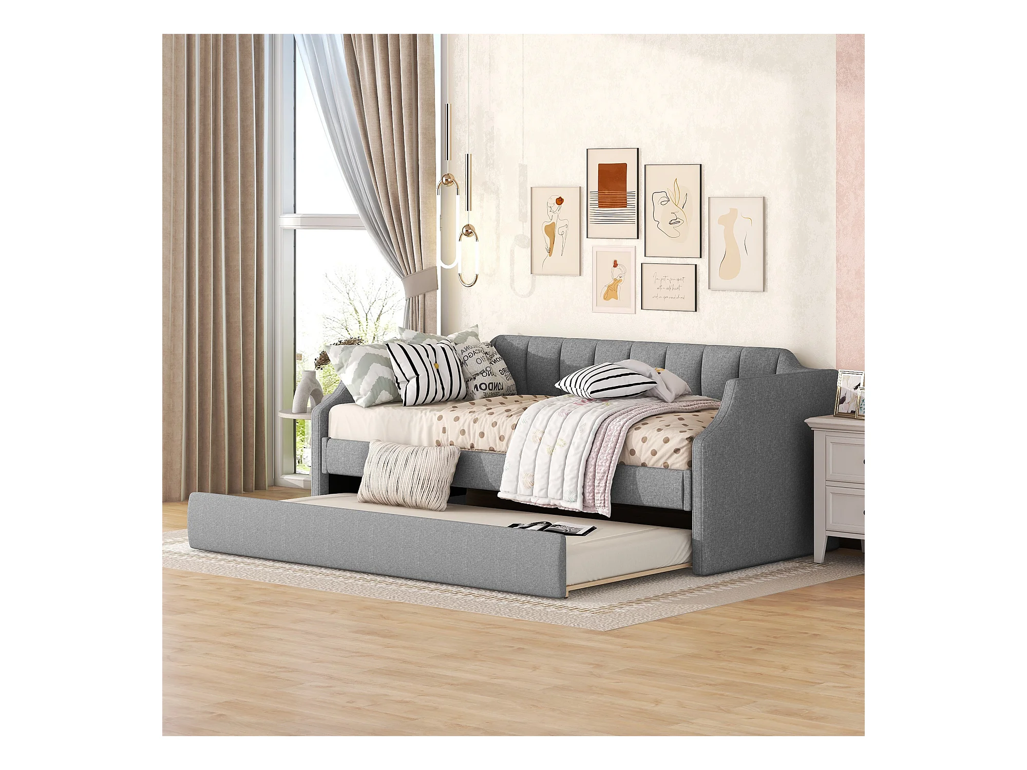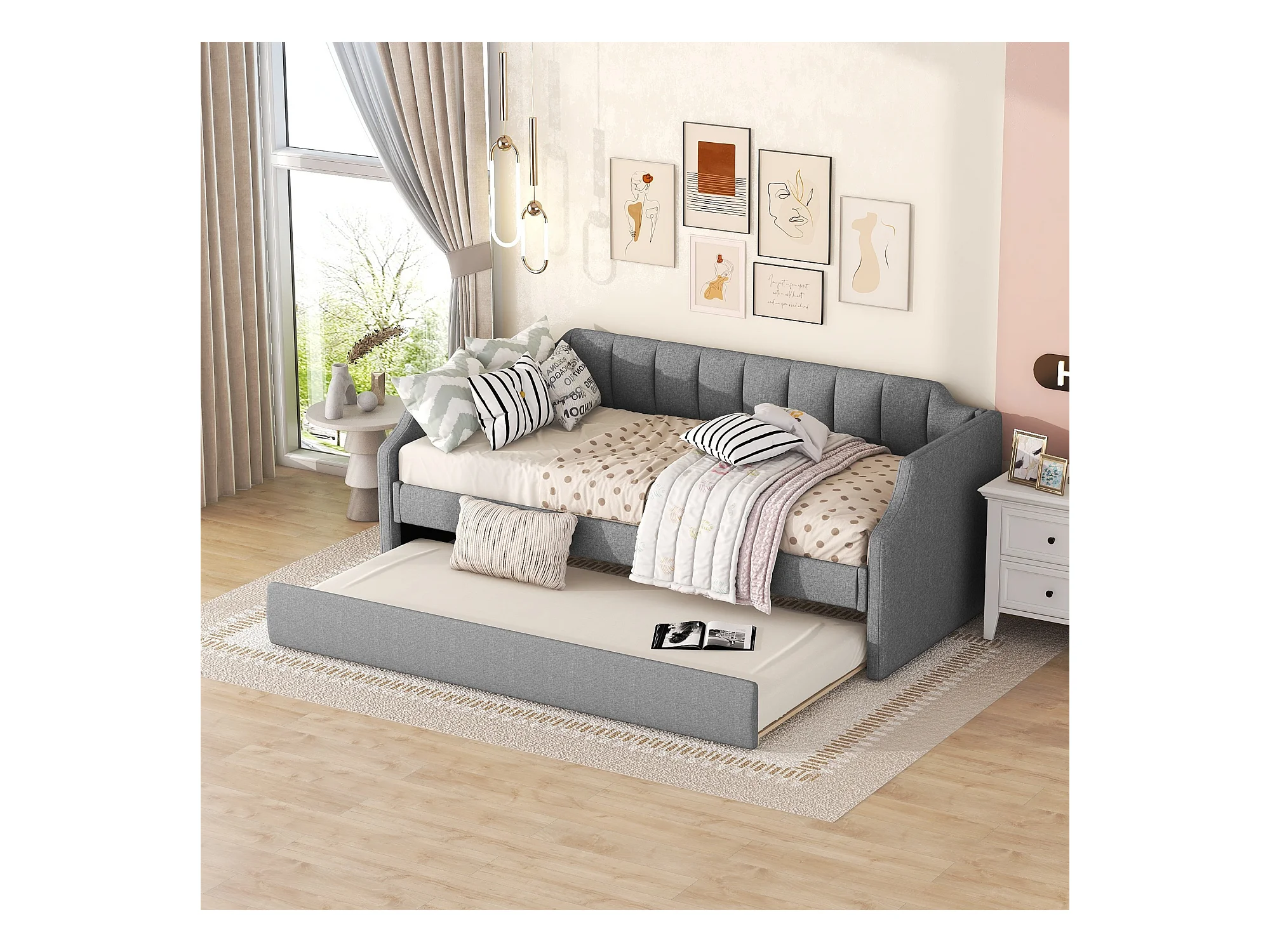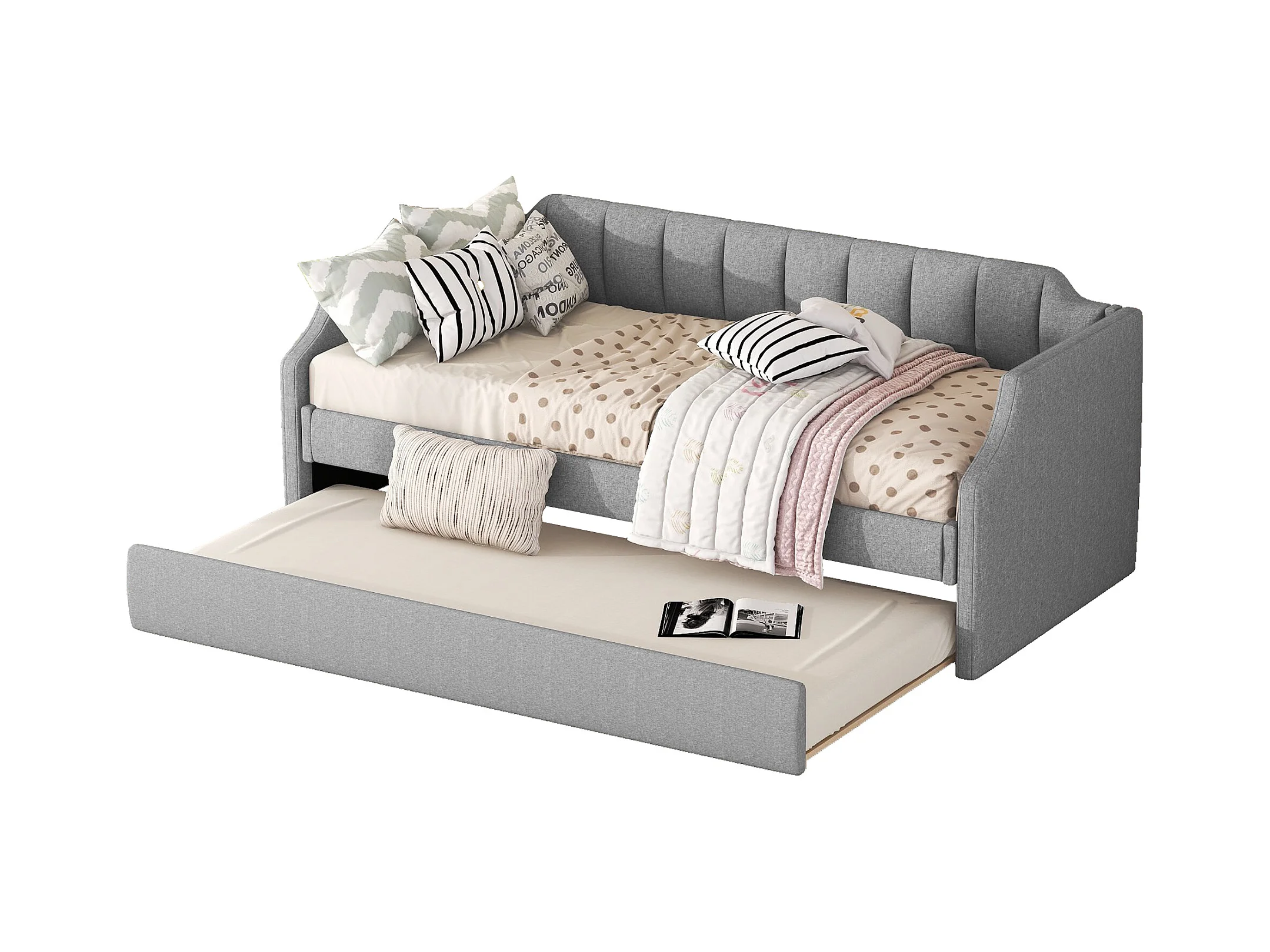 Cama de día 90x200 cm con cama rodante, en lino, gris, funcional y práctica (213x97x81 cm)