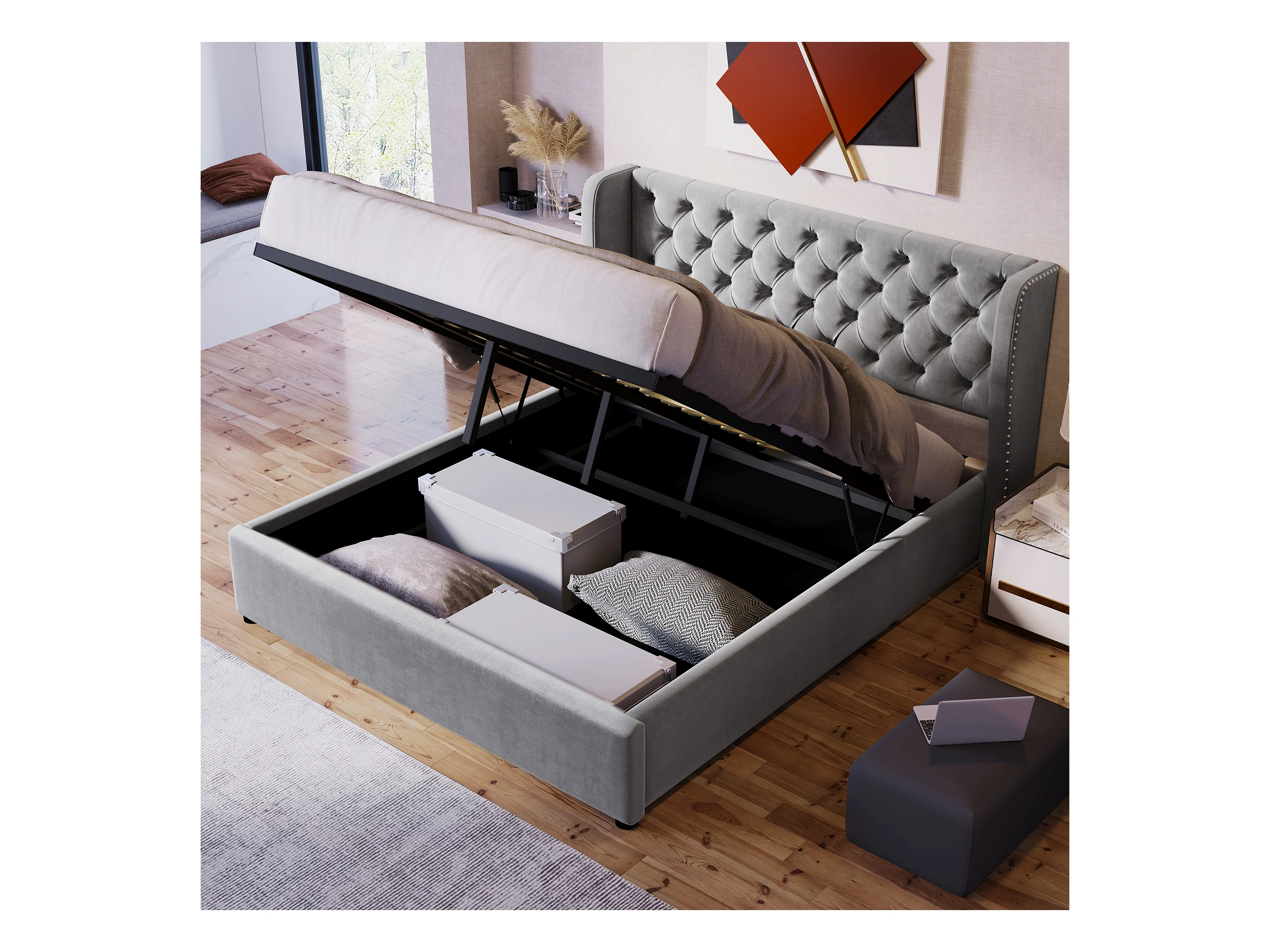 Estructura de cama otomana sin colchón terciopelo gris claro