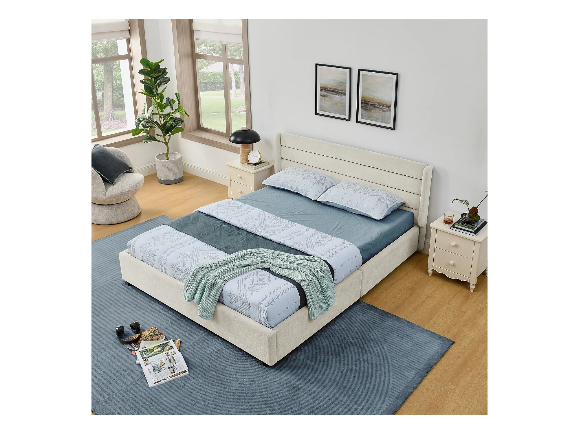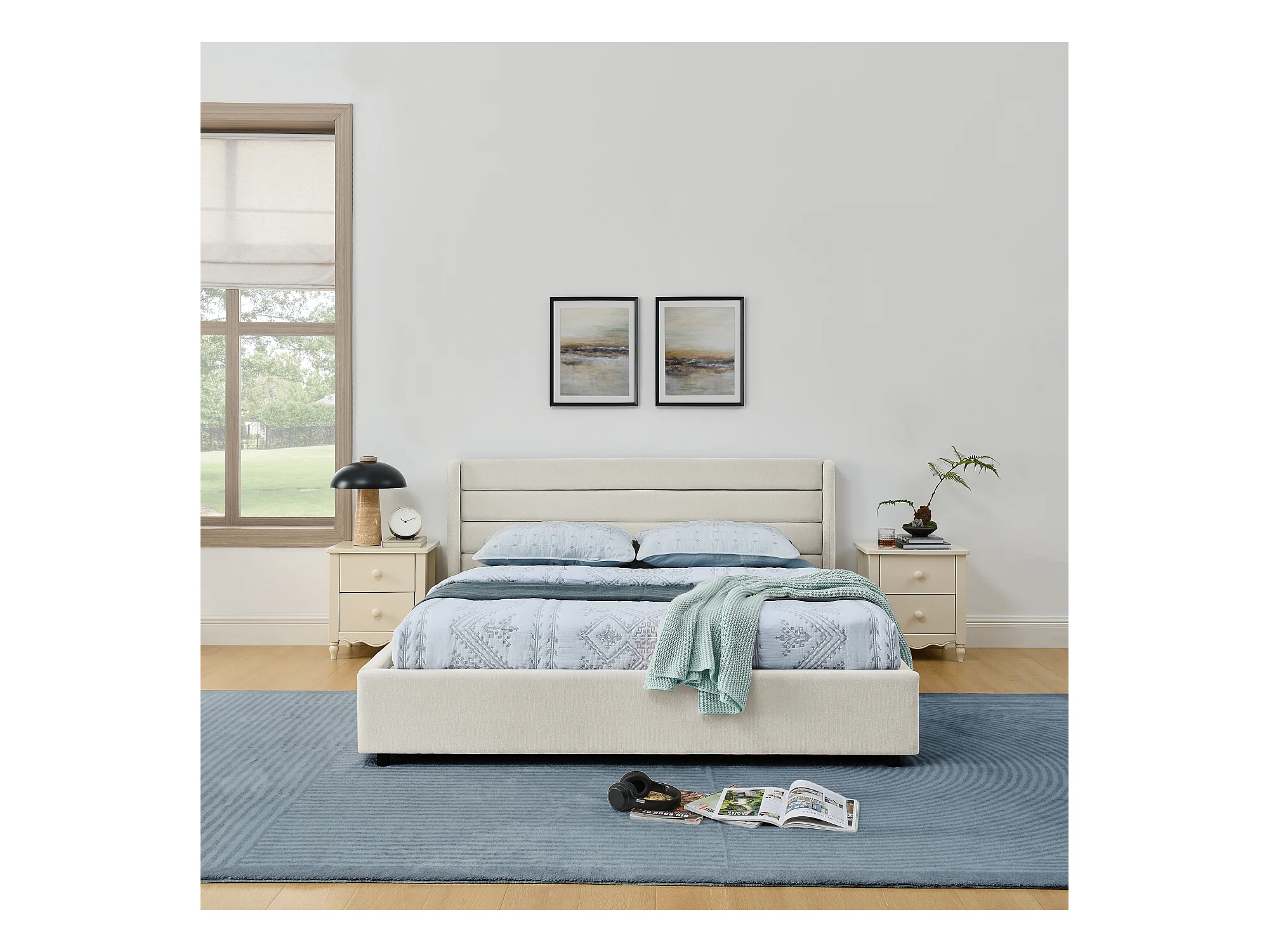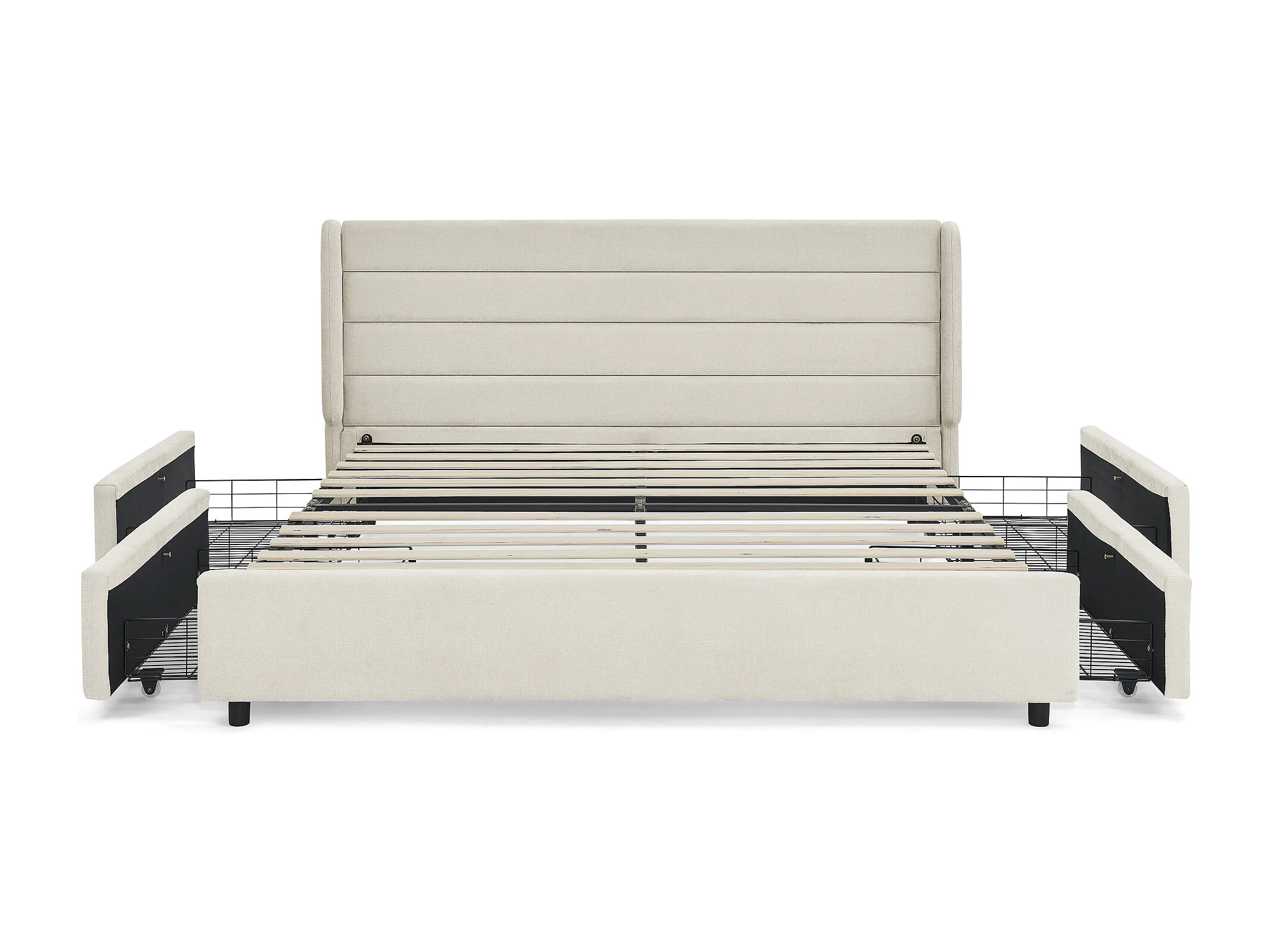 Cama de matrimonio 140x200cm con cajones, somier de láminas, cabecero y piecero, tejido de lino beige (211x148x95,5cm)