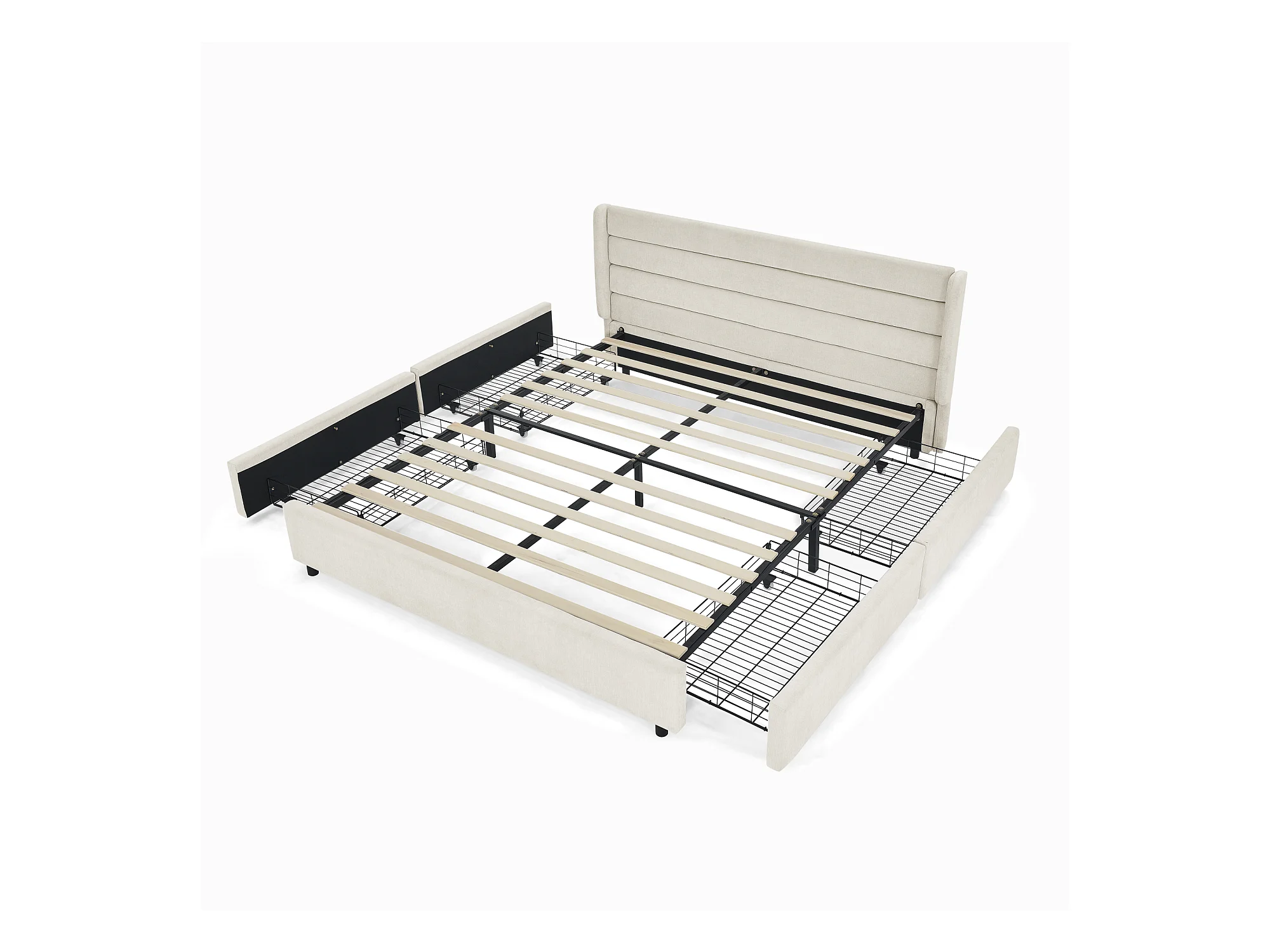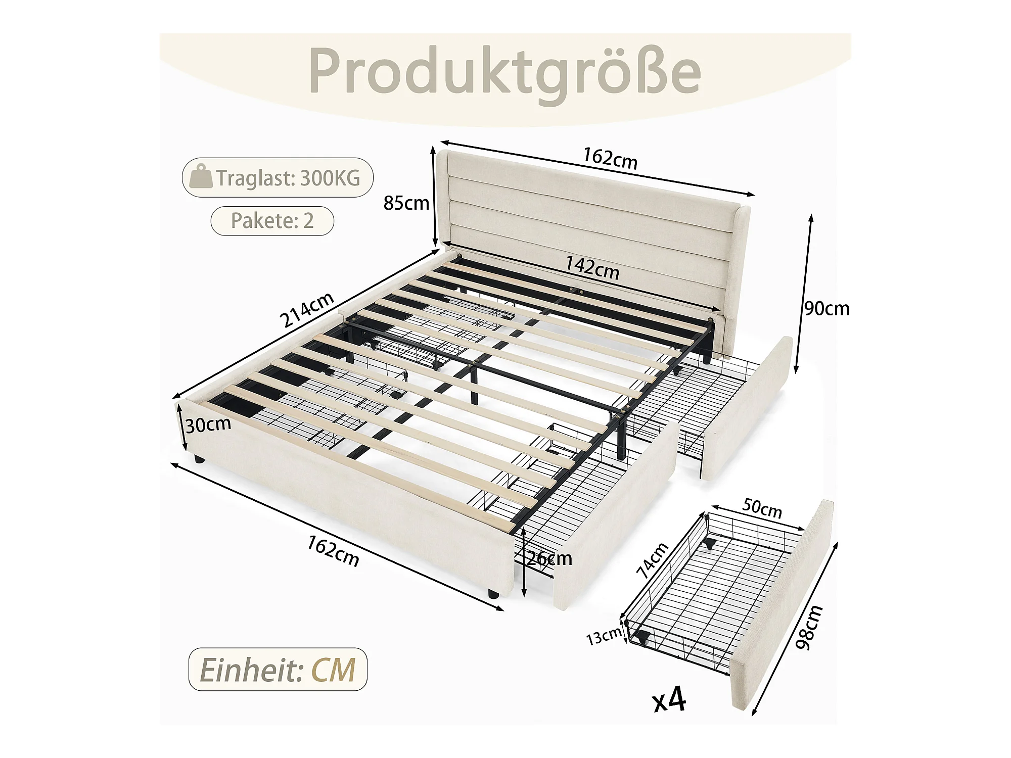 Cama de matrimonio 140x200 cm con 4 cajones, tejido chenilla beige, sin colchón