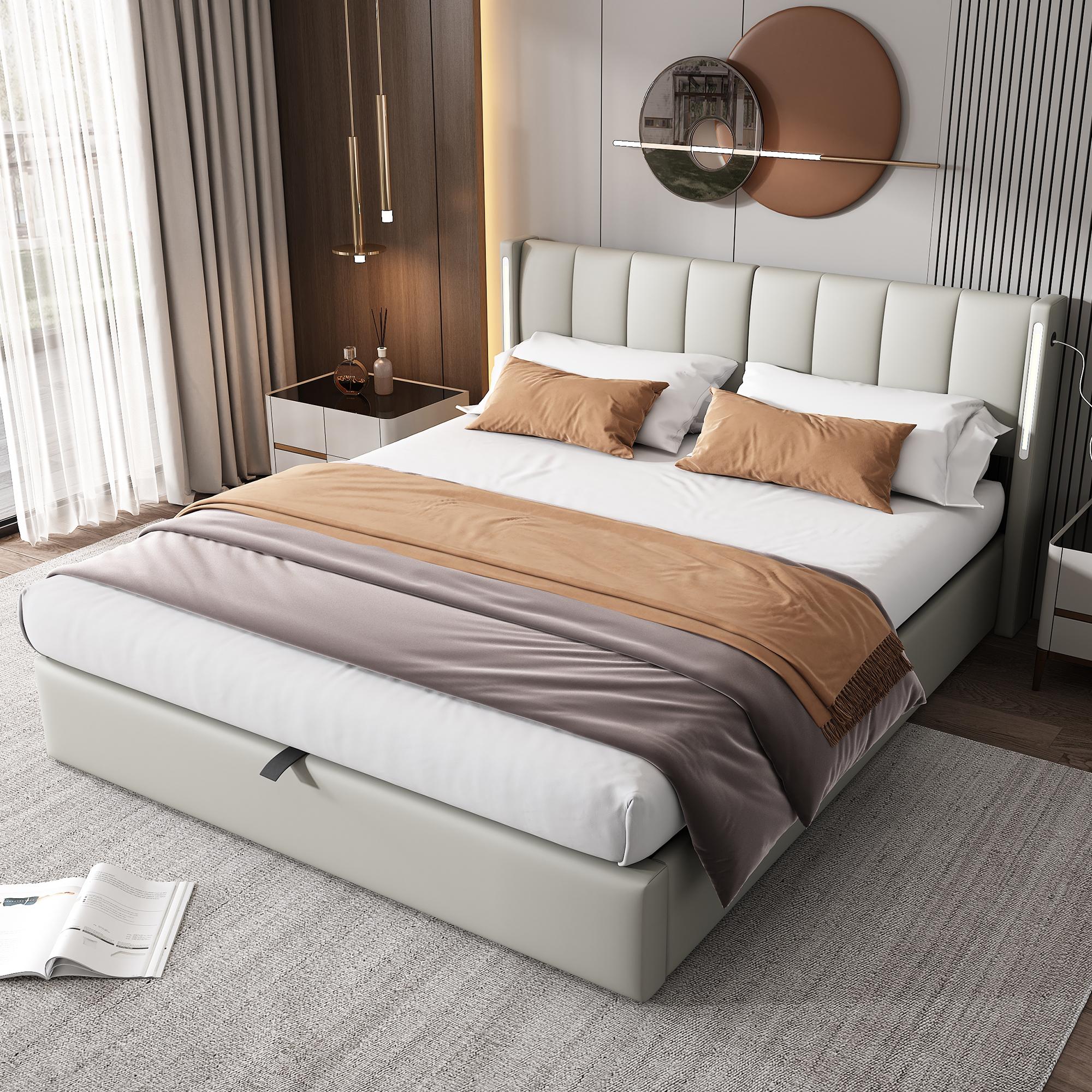 Cama basculante de 140 x 200 cm con LED, tapizada hidráulica, cabecero y somier de láminas, gris, terciopelo