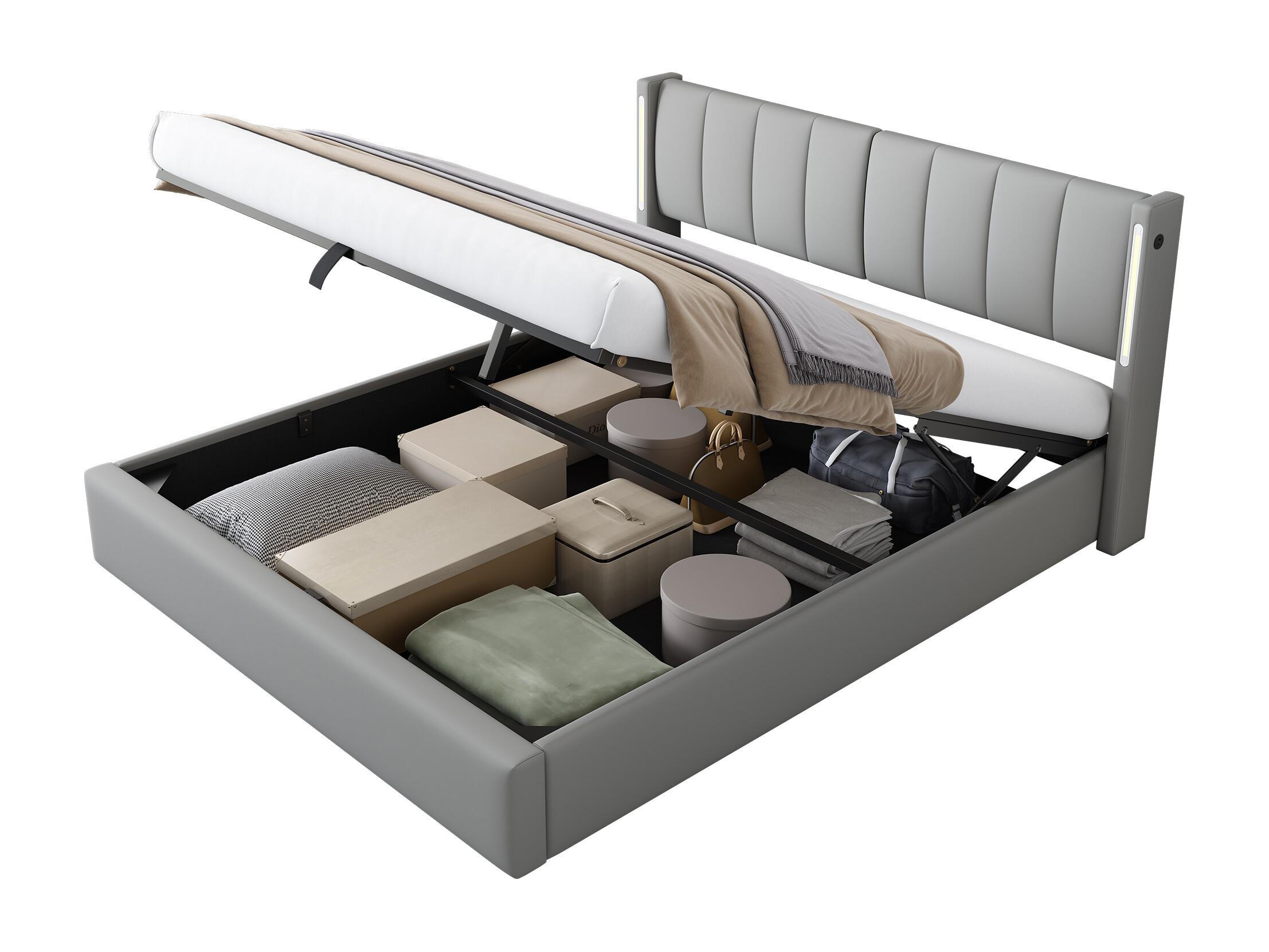 Cama de matrimonio 140x200 PU gris con LED, canapé hidráulico, cabecero regulable y USB