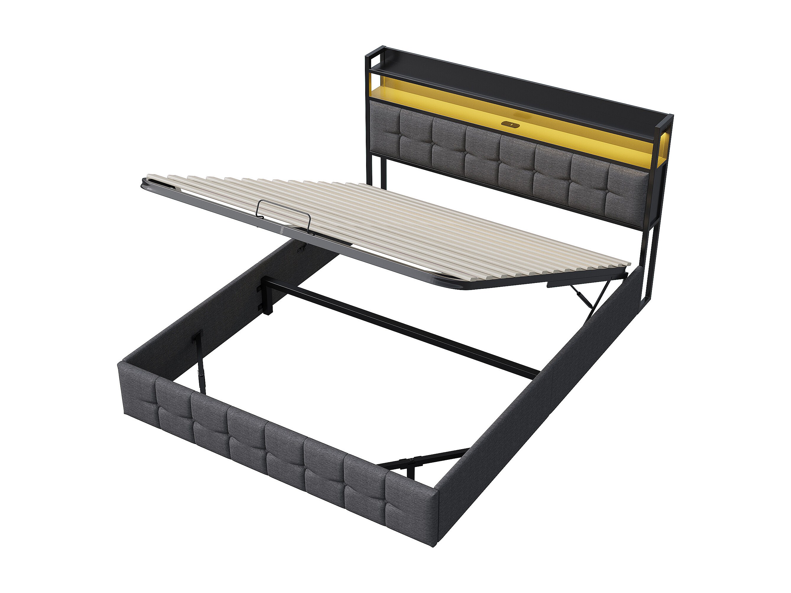 Cama de matrimonio 160x200 cm con base y almacenaje, camas tapizadas con LED y toma USB, lino, gris