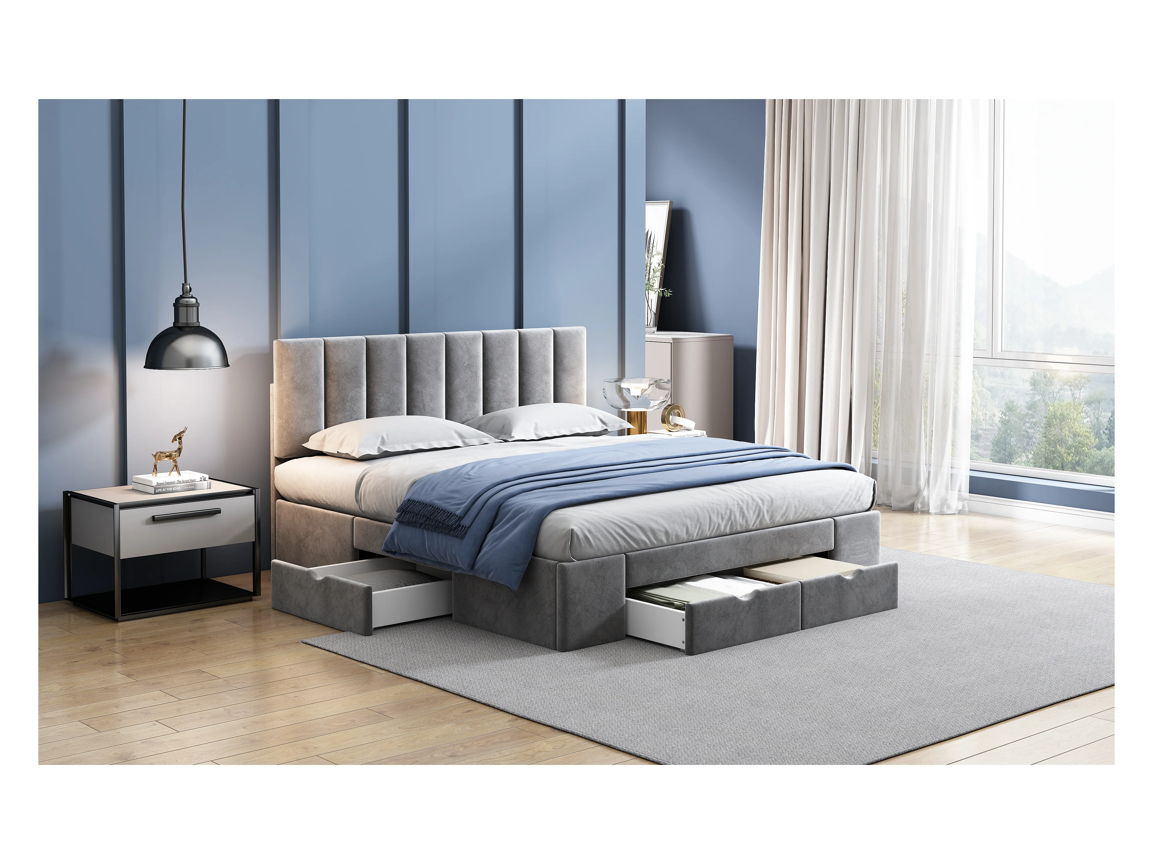 Cama de matrimonio 160x200 cm en terciopelo gris con base, cabecero y 4 cajones de almacenaje.