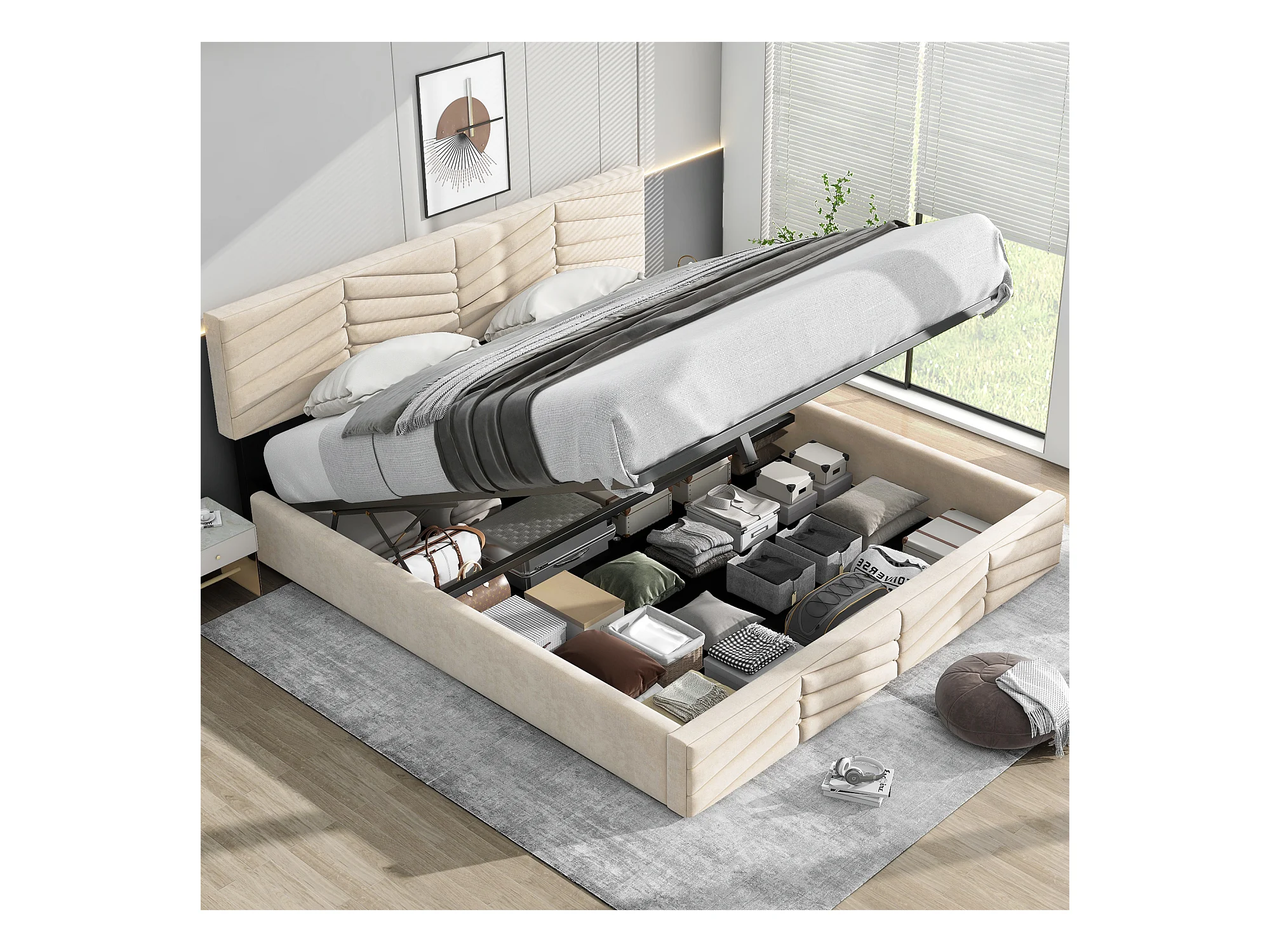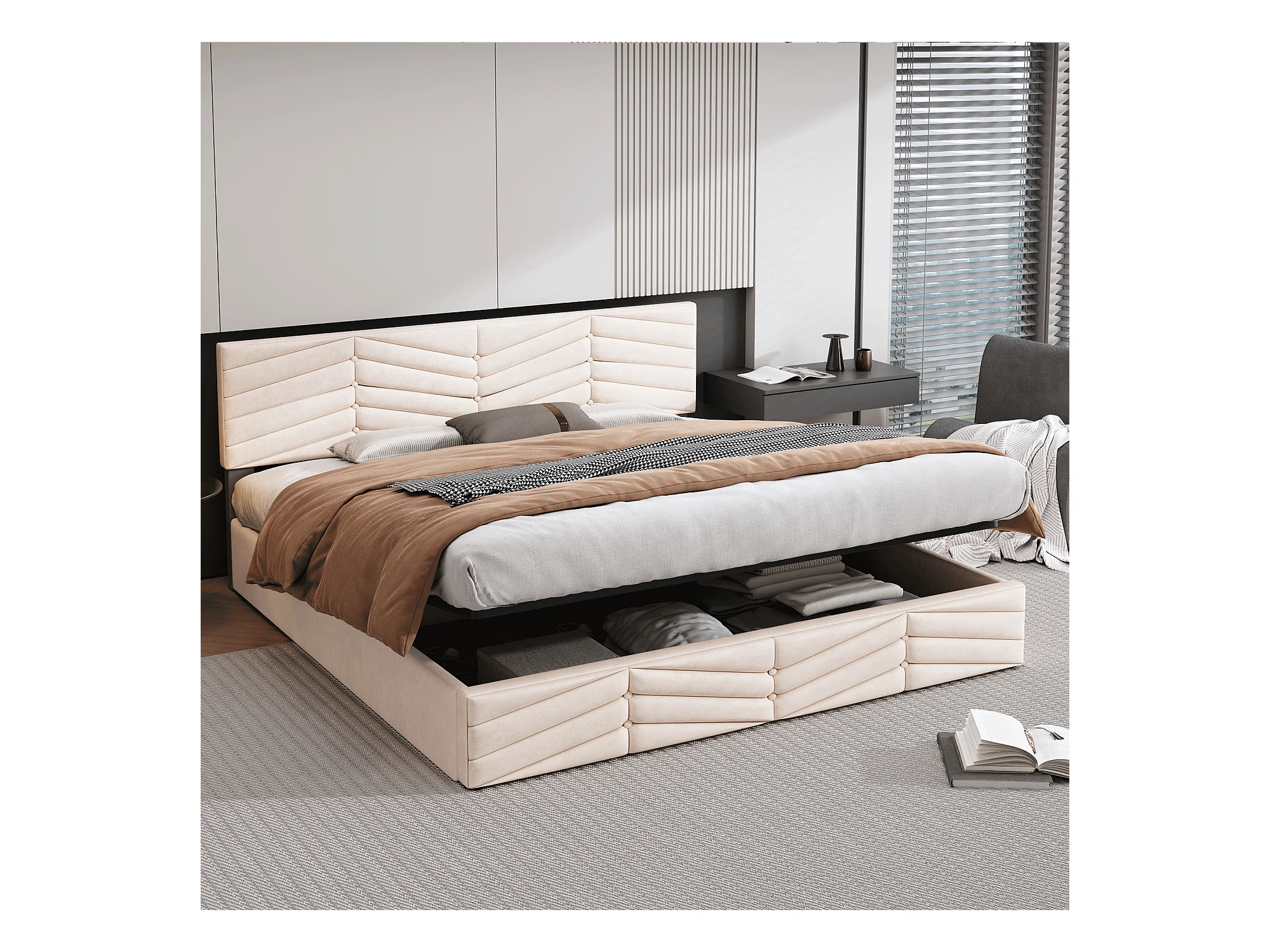 Cama tapizada LED 160x200 terciopelo beige con almacenaje hidráulico y cajones integrados