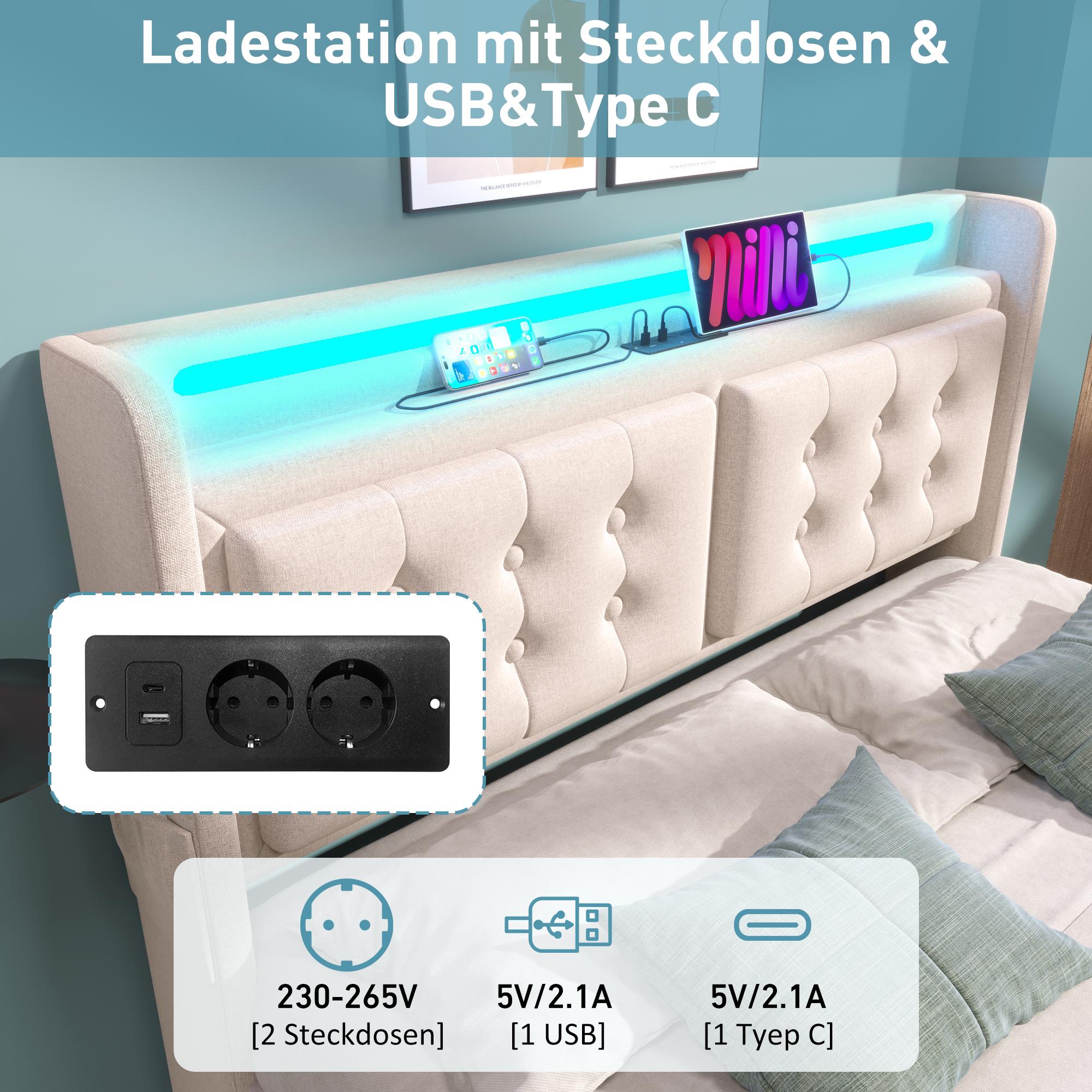 Cama 160x200 cm con USB y LED, diseño de patas ocultas, tejido de lino beige (213x165x113,5 cm)