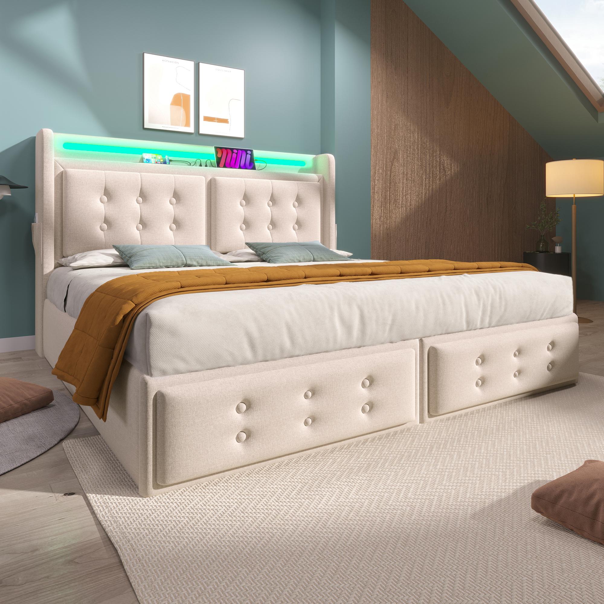 Cama de matrimonio 160x200 con cabecero LED y puerto USB-C, 4 cajones de almacenaje, base de madera y metal, beige, (220x161x109 cm)