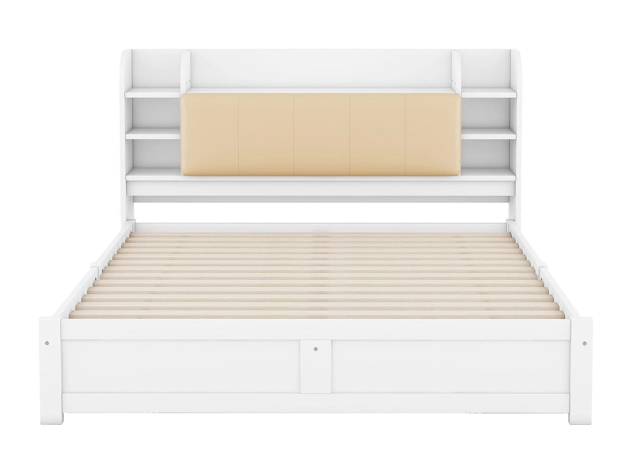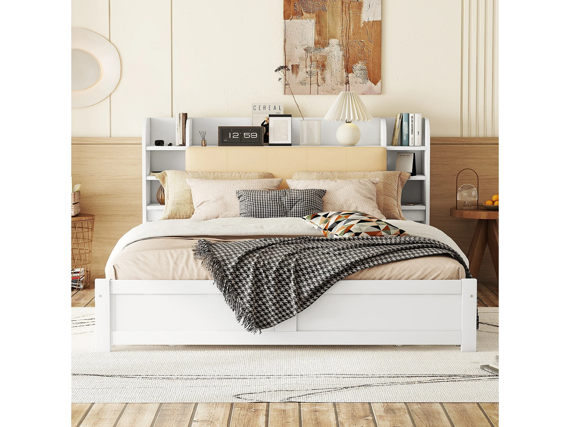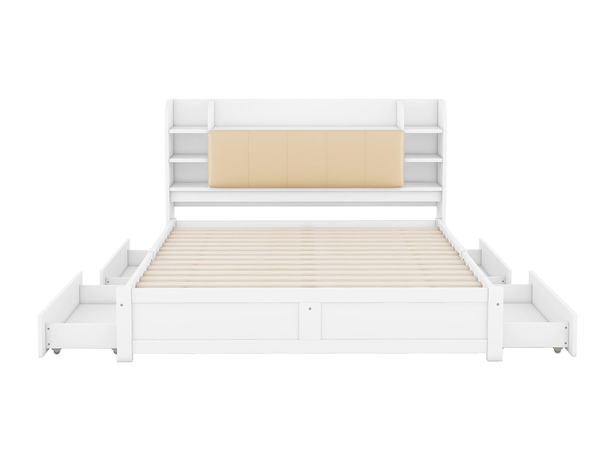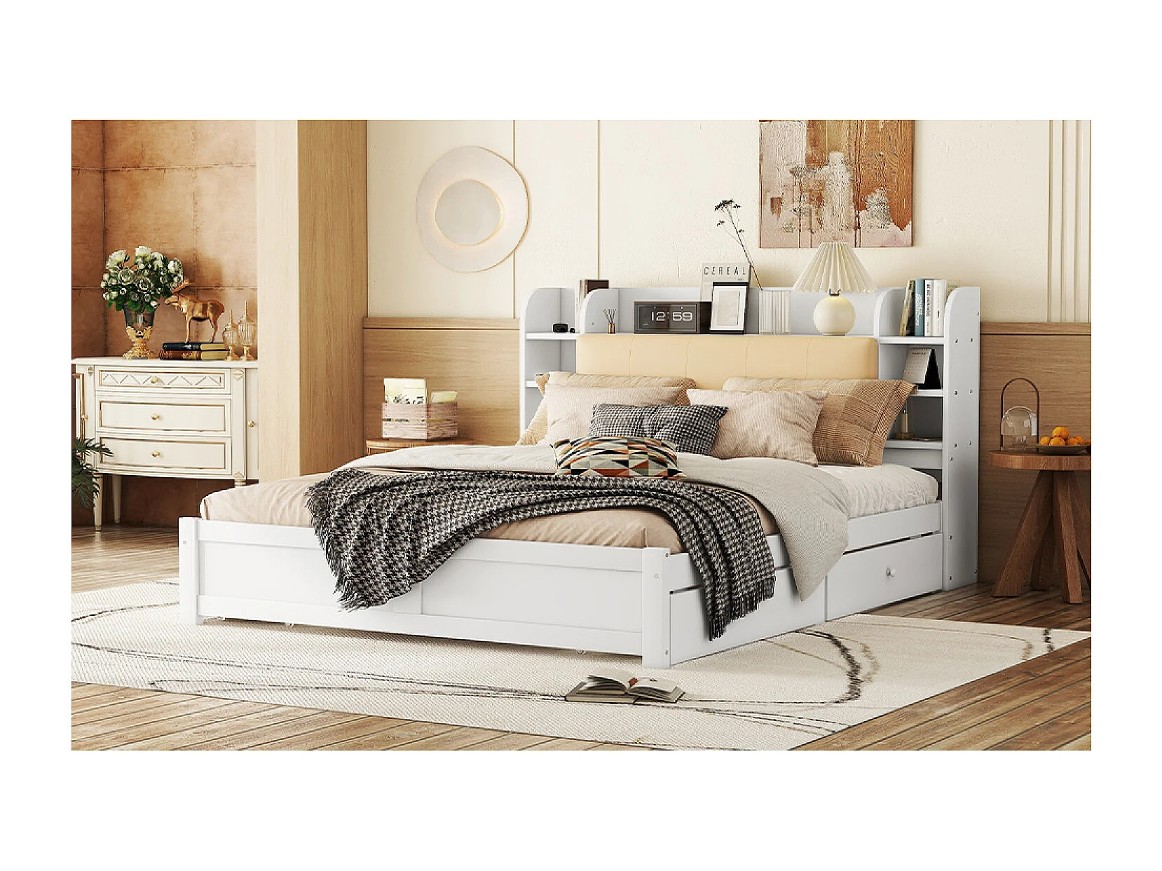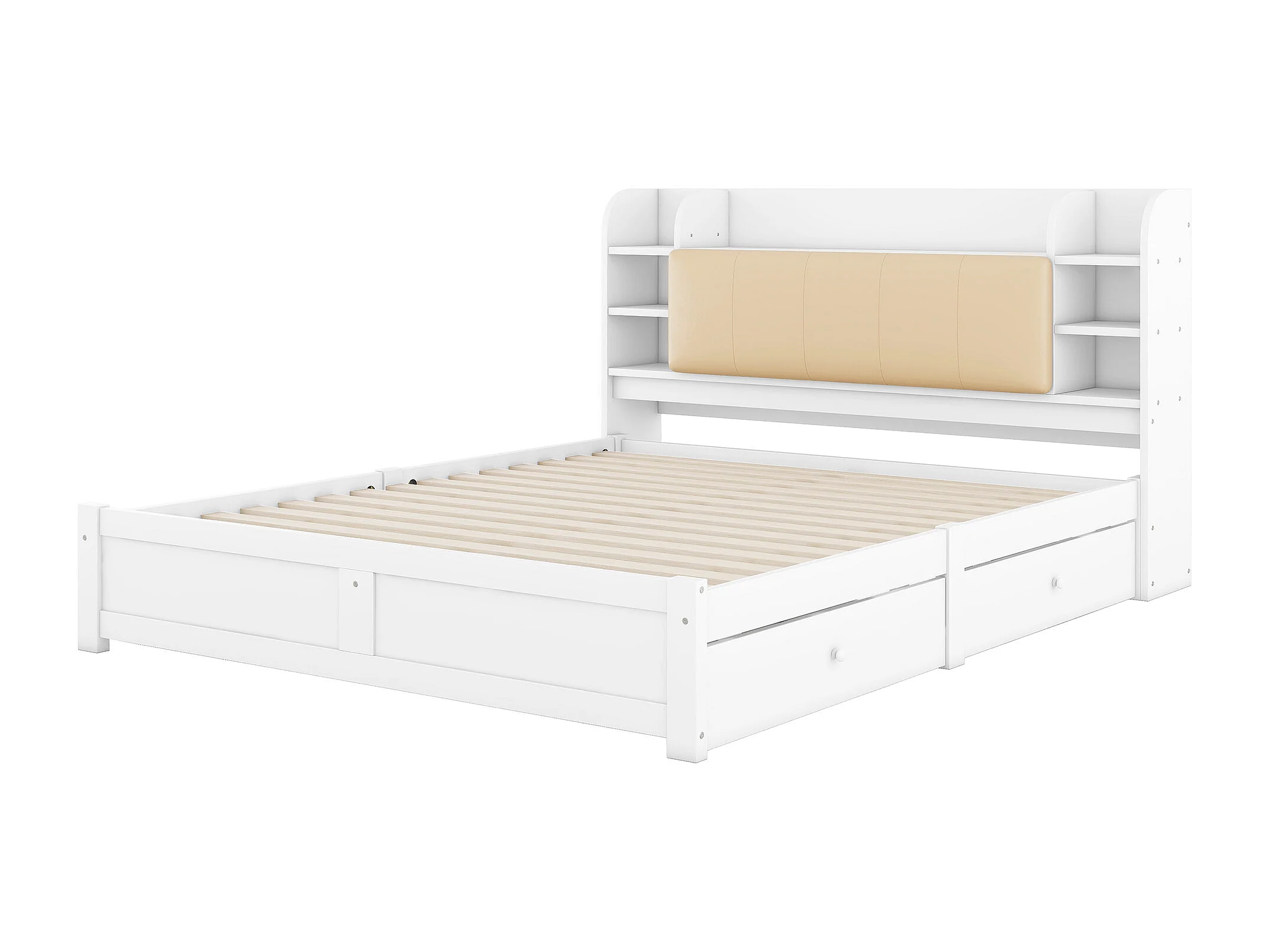 Cama de matrimonio 180 x 200 cm con 4 cajones y cabecero con almacenaje - Madera blanca