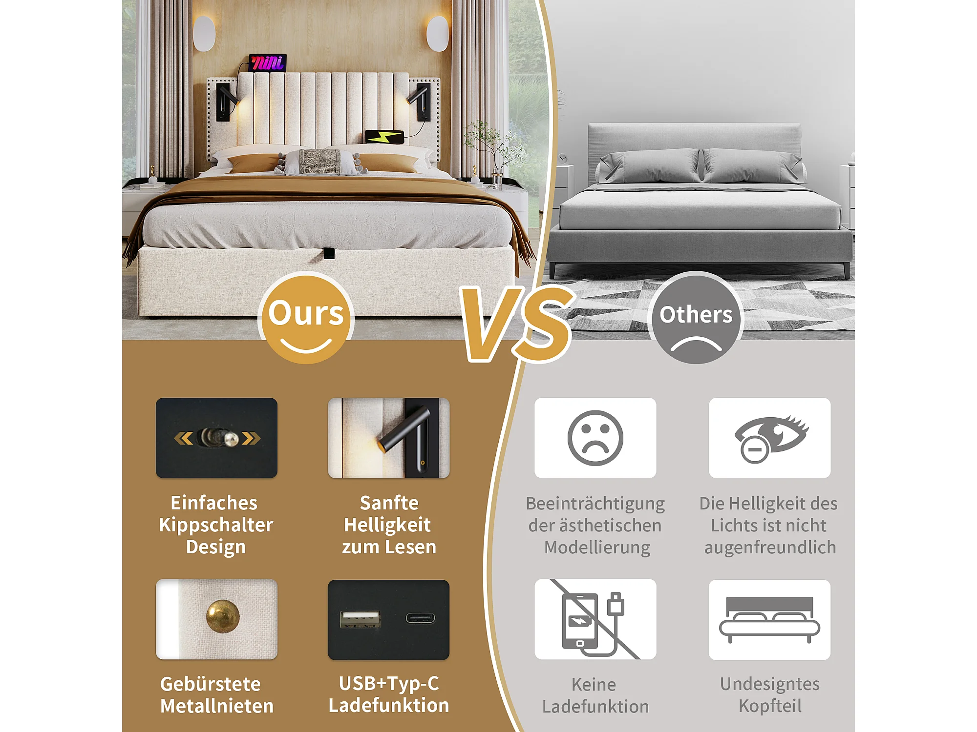 Cama de matrimonio 180x200, con almacenaje, cabecero con iluminación LED y puertos USB, algodón beige (203x187x106 cm)