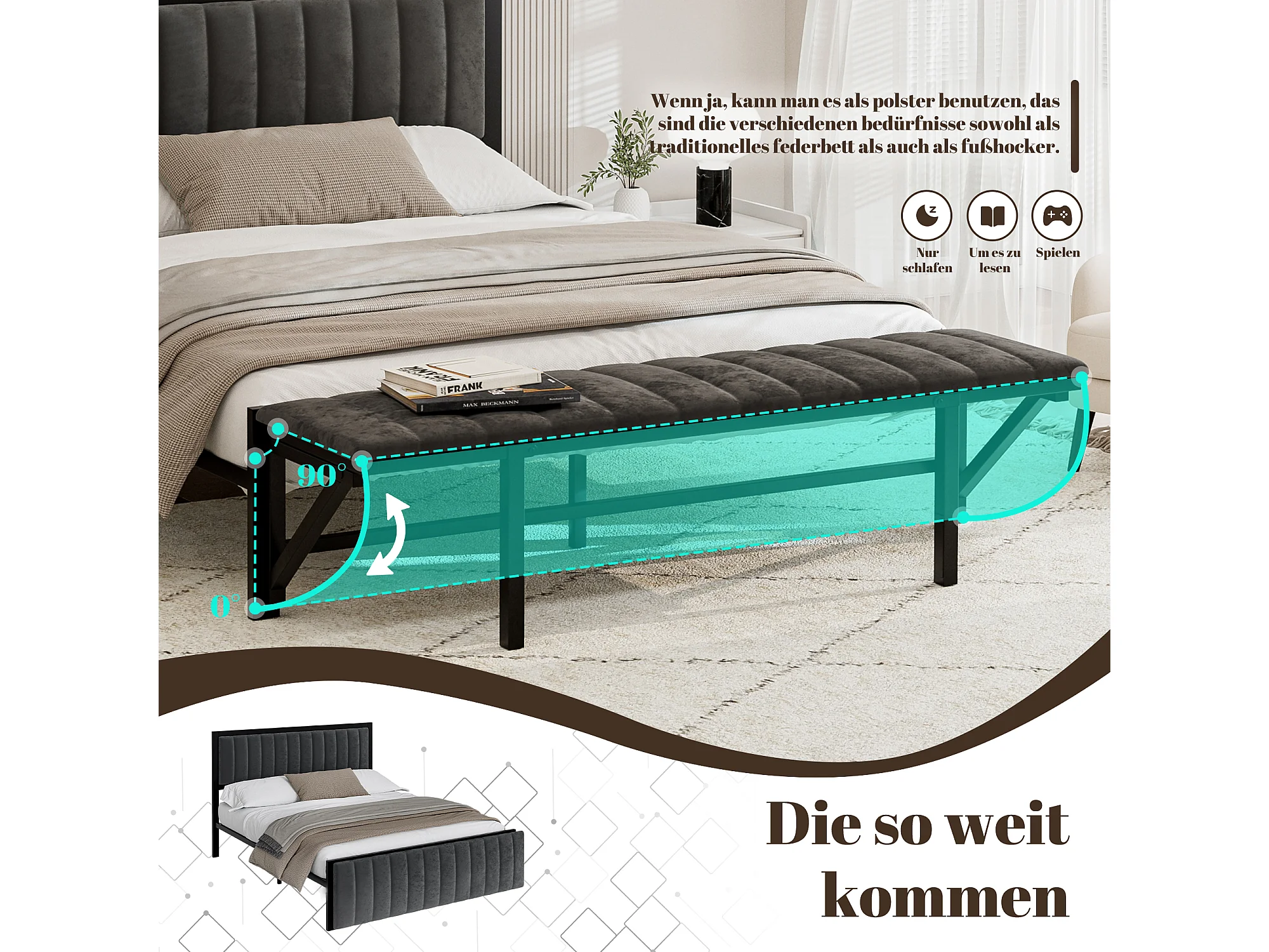 Cama de matrimonio tapizada 140x200 cm, con banqueta abatible, somier de láminas de hierro, terciopelo, gris oscuro