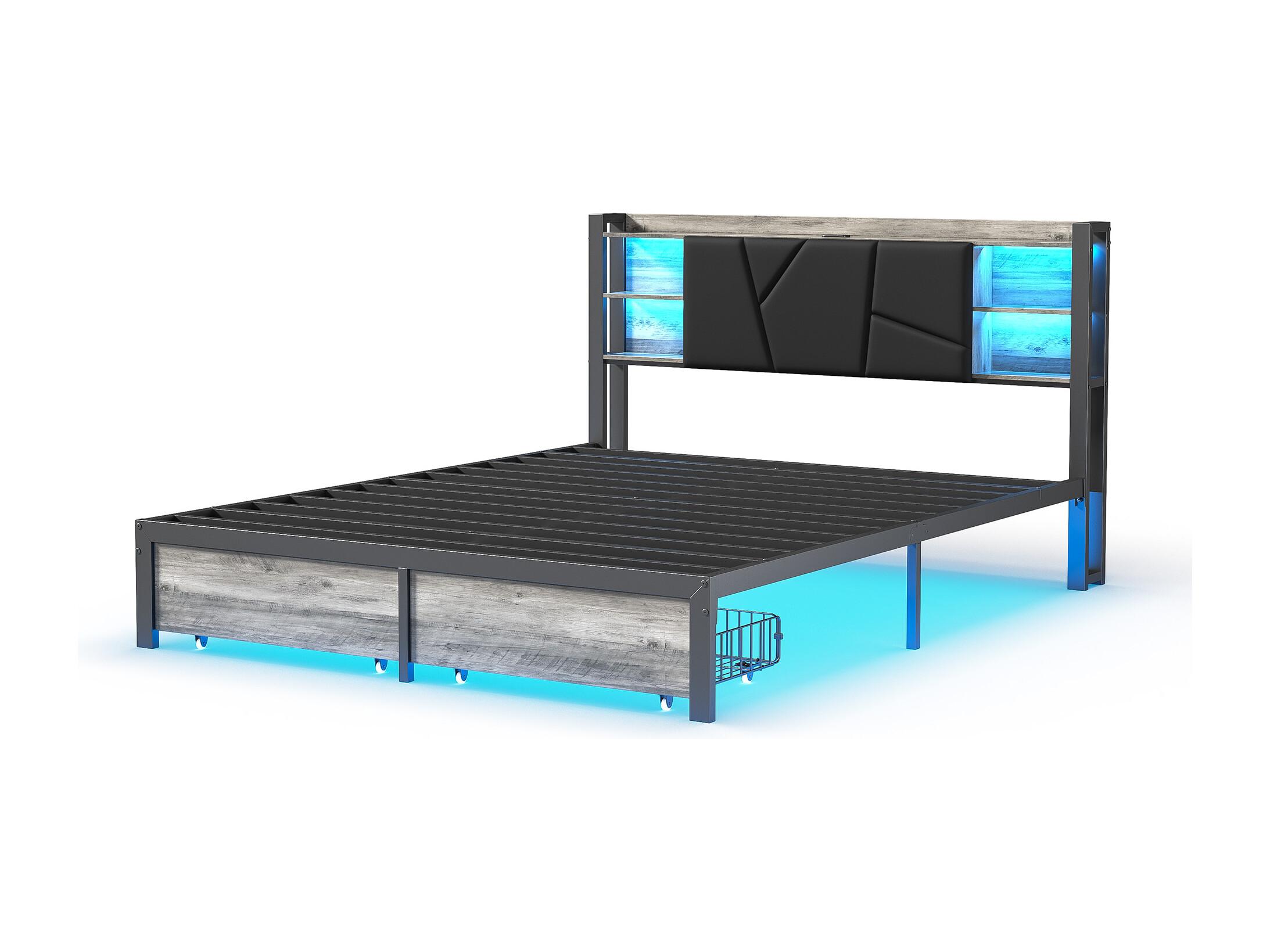 Cama doble de 140 x 200 cm con LED, estructura de metal, 2 cajones, cabecero con almacenaje y somier de láminas.