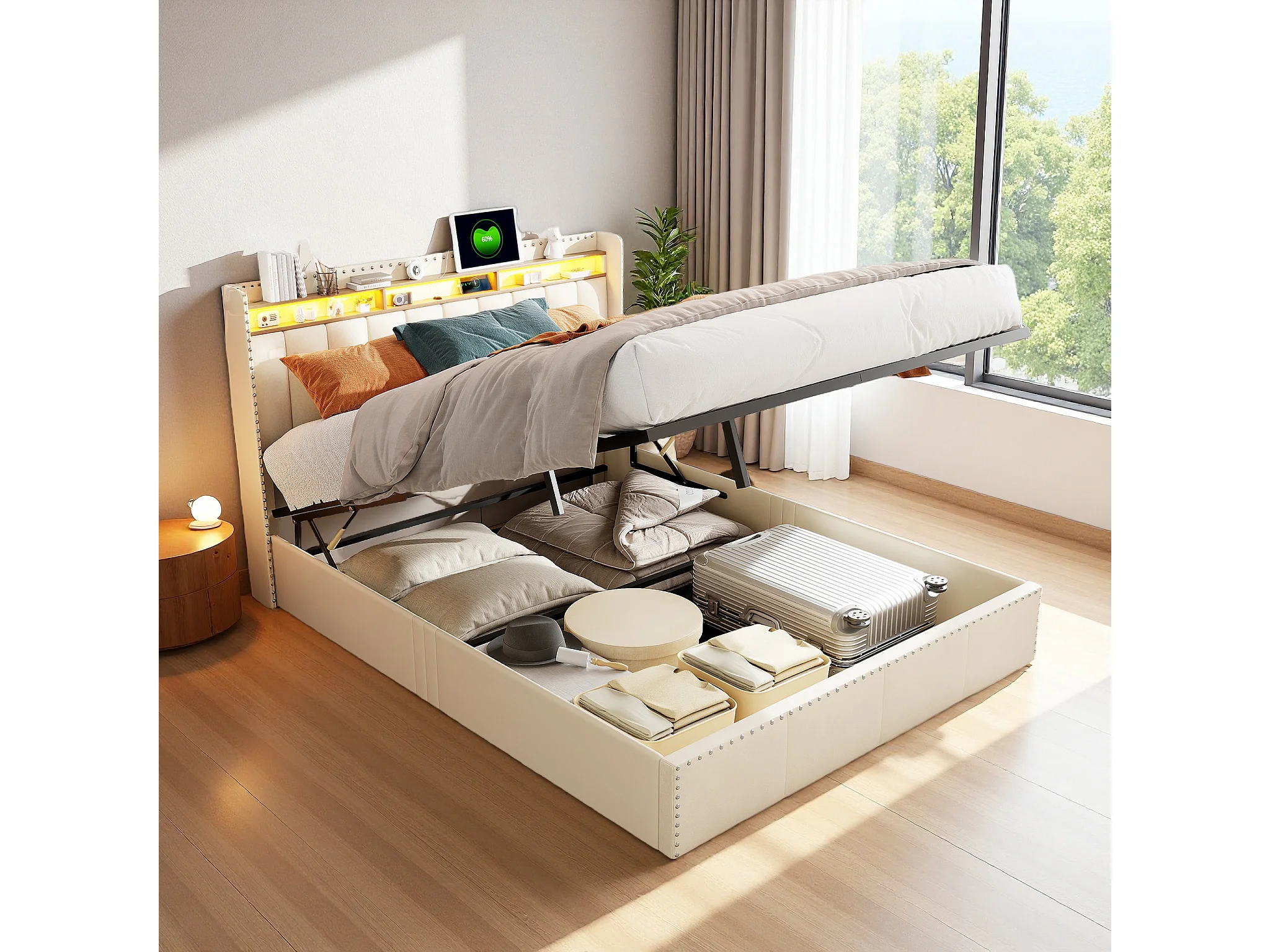 Cama de terciopelo beige 140x200 cm, con cabecero tapizado, LED, sistema de almacenaje con elevadores hidráulicos y decoración de tachuelas metálicas