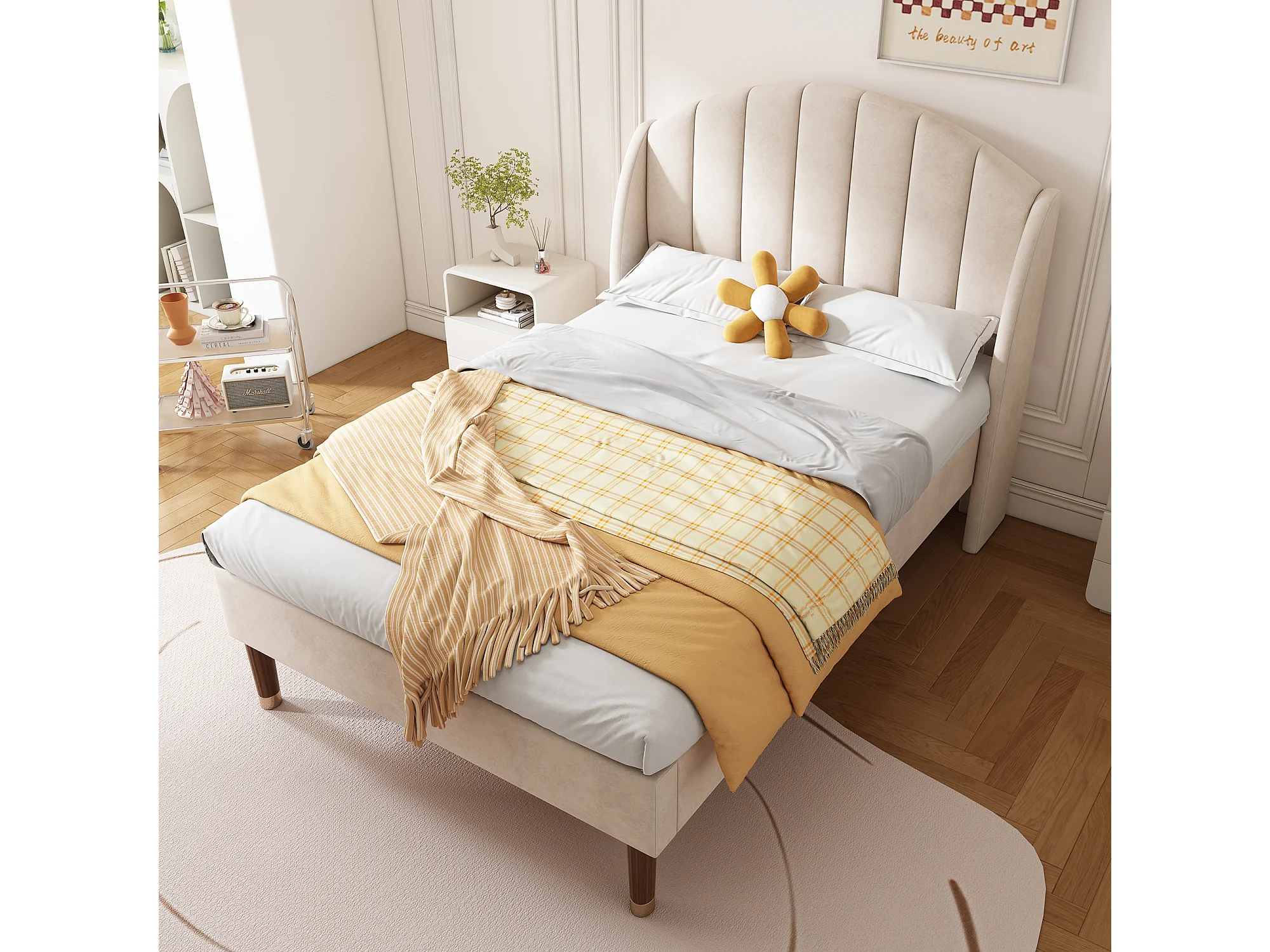 Cama de terciopelo beige de 90x200 cm con cabecero y somier de láminas, cama individual para adolescentes