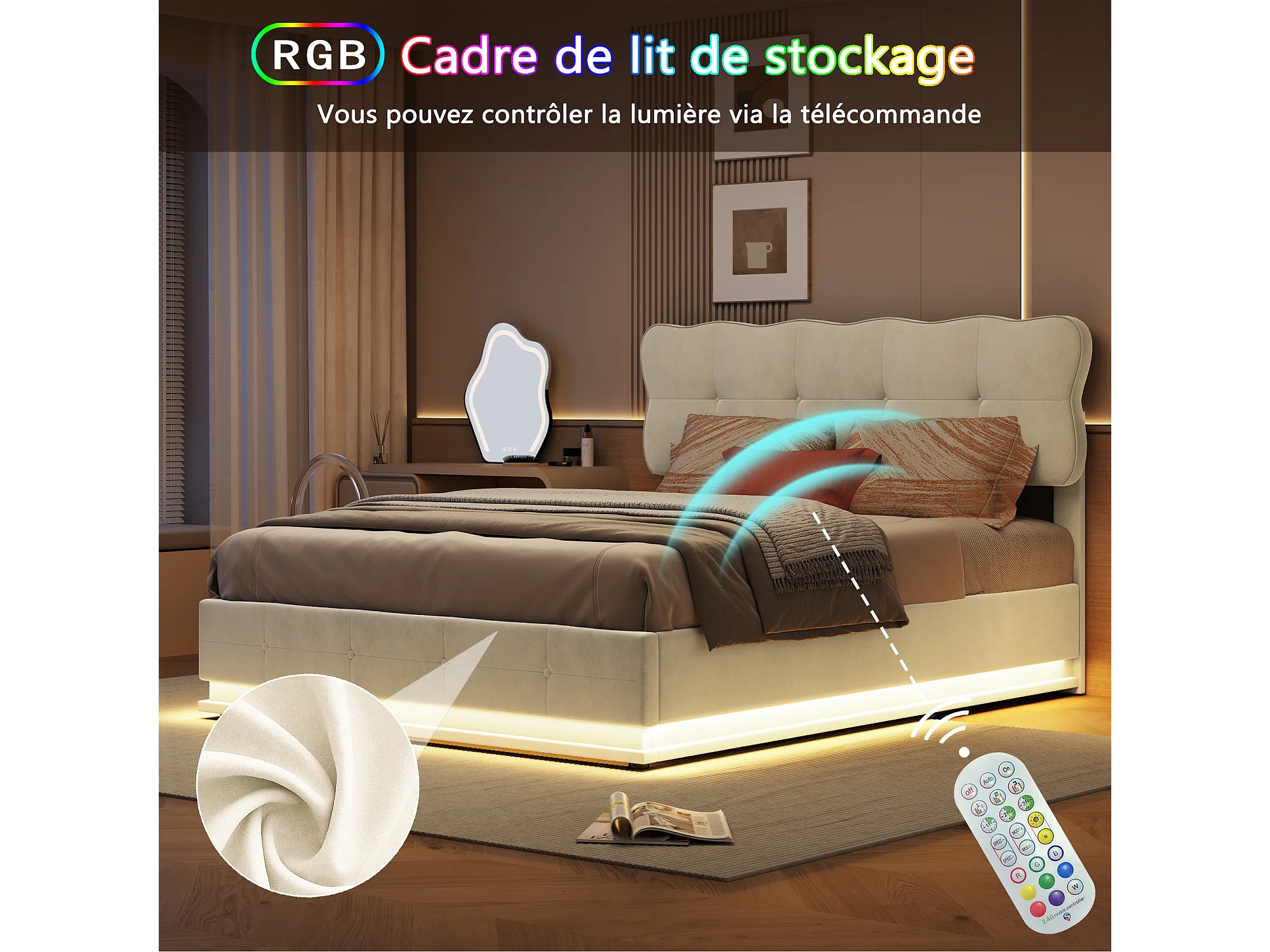 Cama doble 140 x 200 cm - con tira LED y función de almacenaje con resorte de gas - cama con canapé - terciopelo beige
