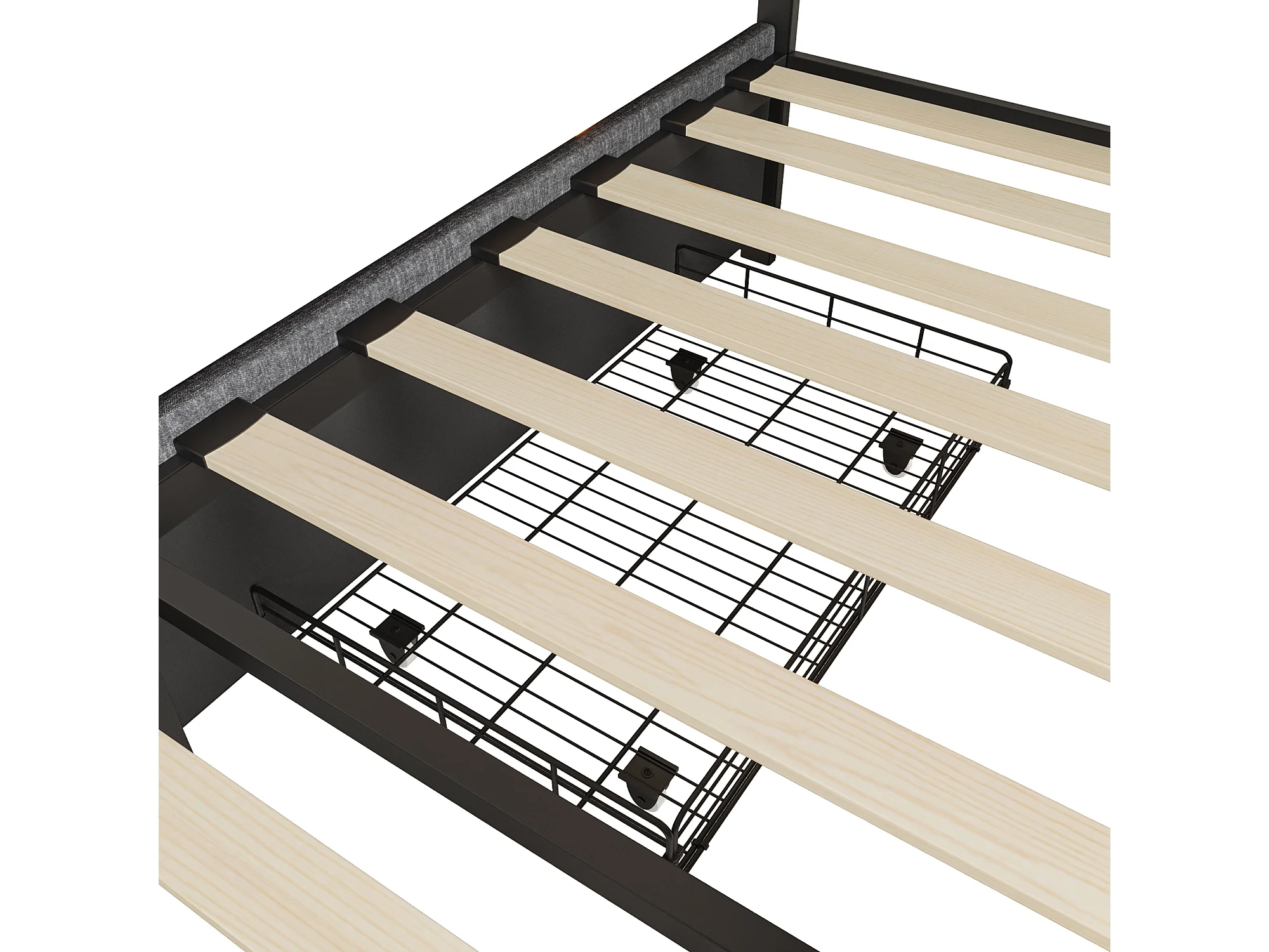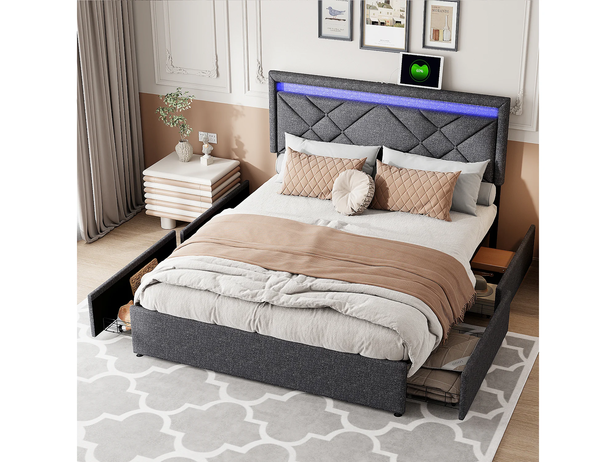 Cama doble 140x200, Canapé con LED y USB, Cabecero ajustable tapizado, Lino, Gris