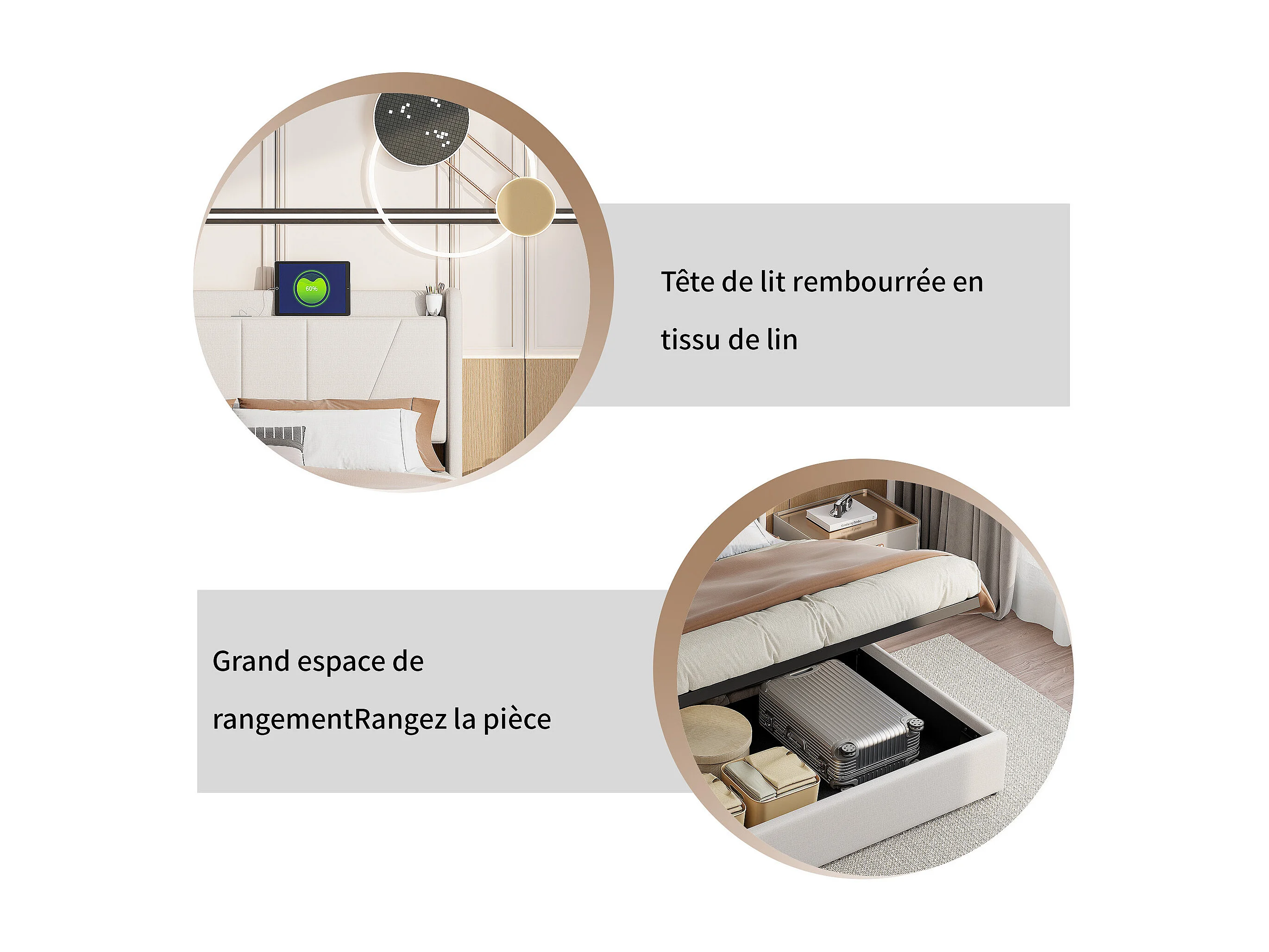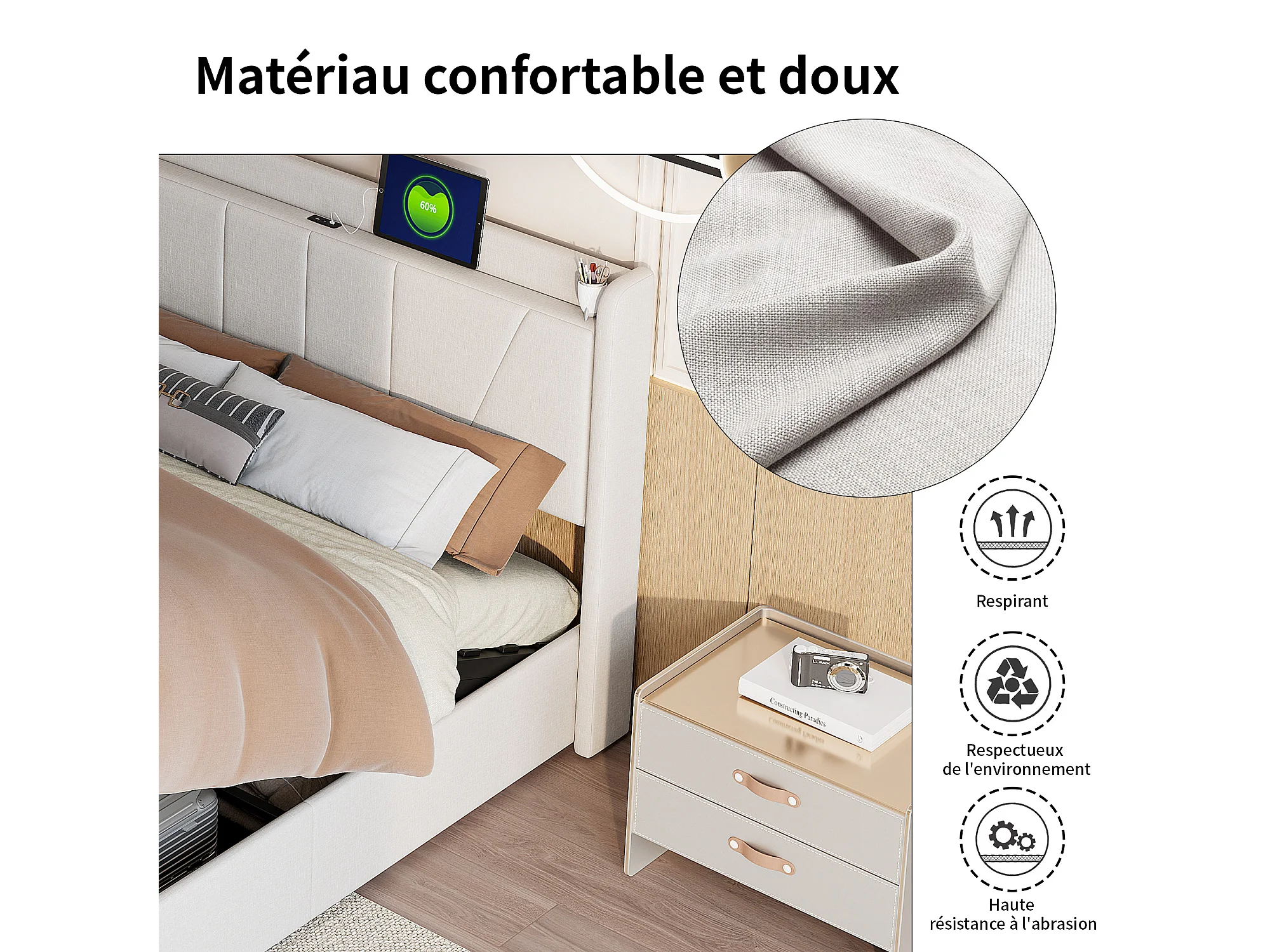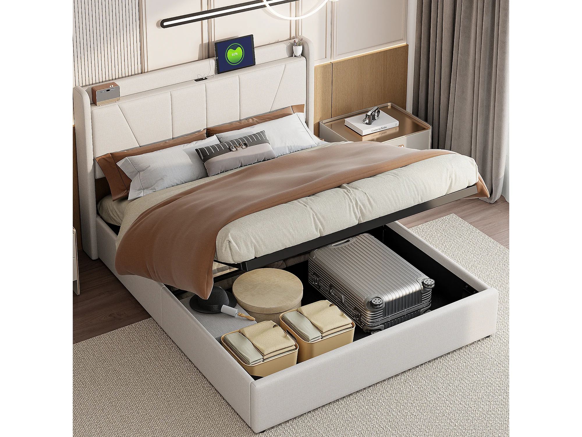 Cama doble 140x200 cm - Cabecero con 2 puertos USB + 1 puerto Tipo C - Compartimento hidráulico - Lino - Beige