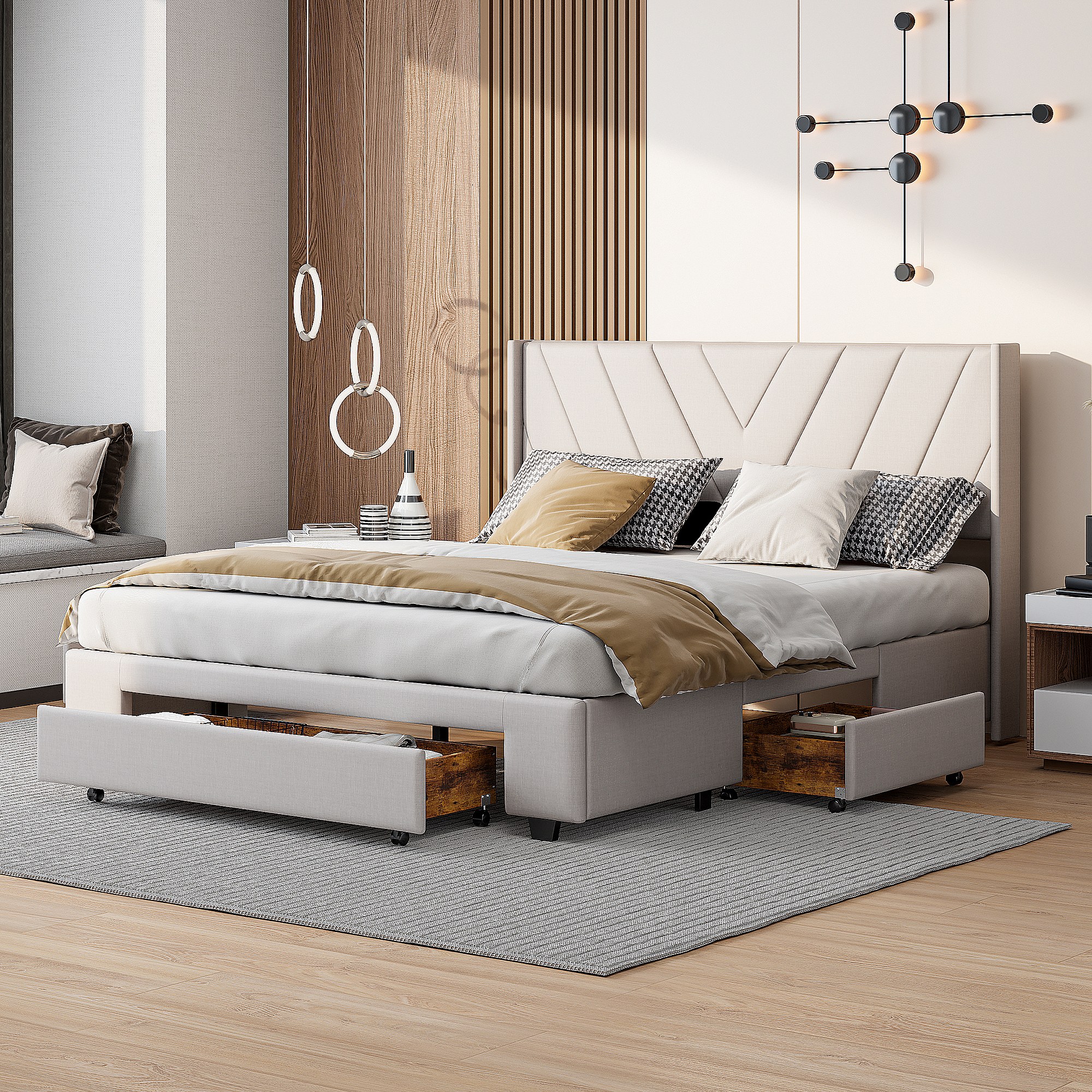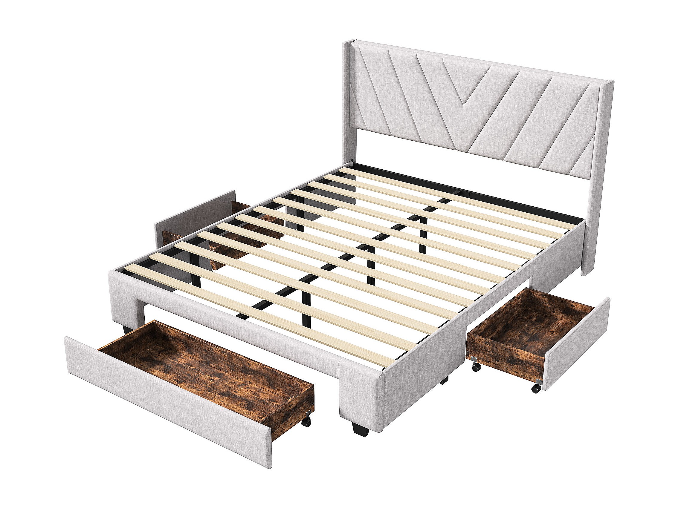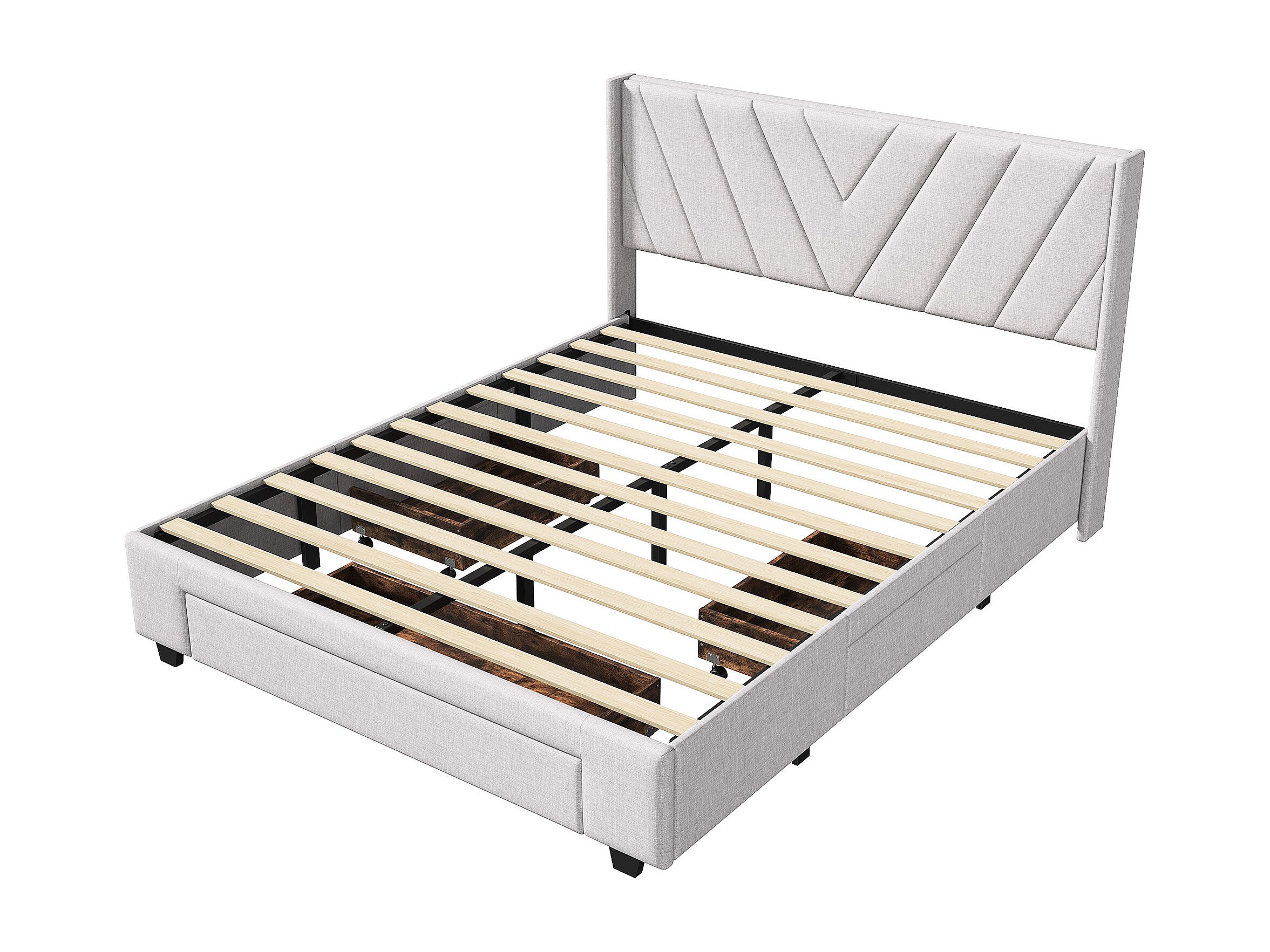 Cama doble de 140 x 200 cm con 4 cajones, estructura de cama con LED y somier de láminas, lino, beige