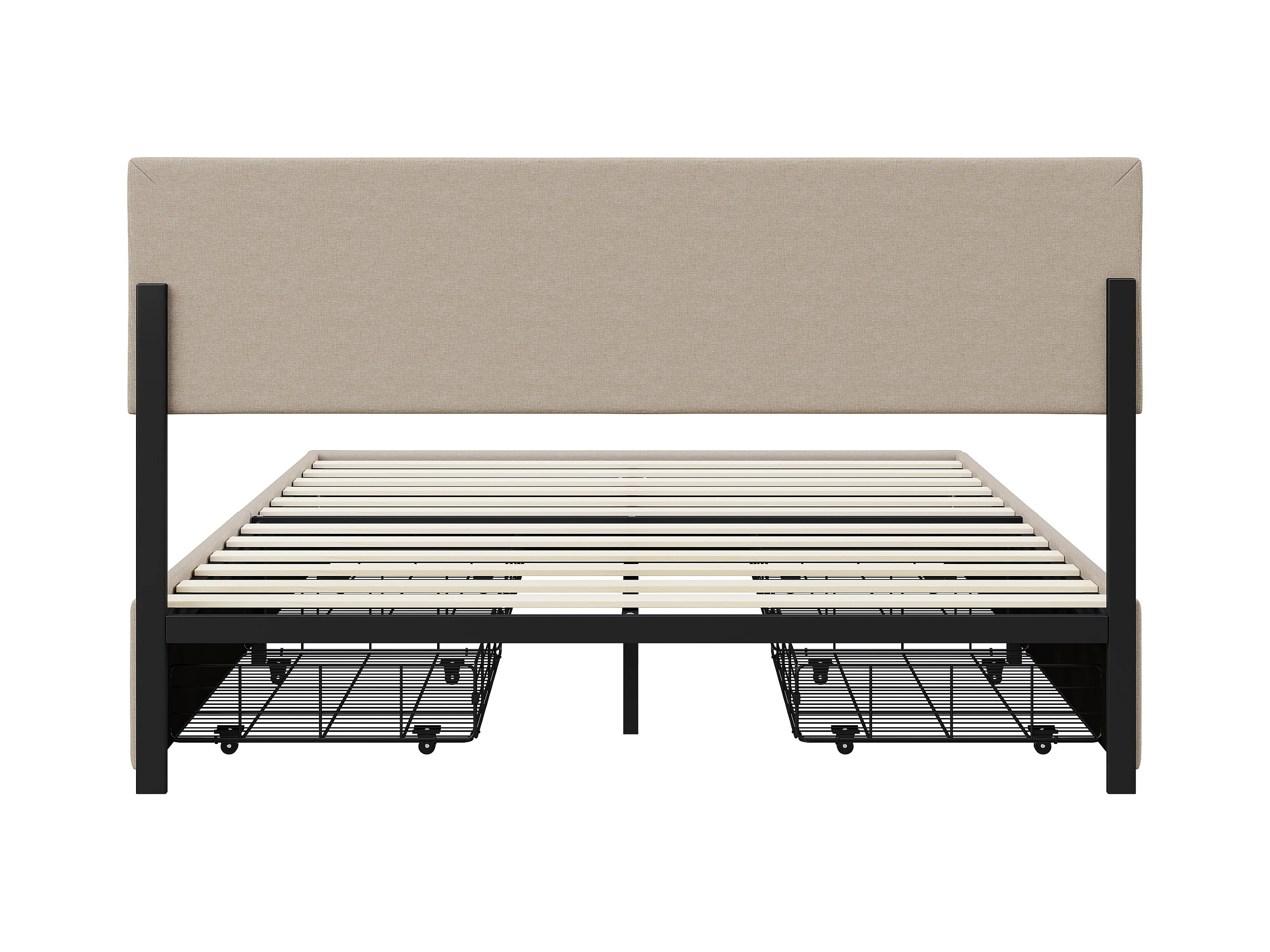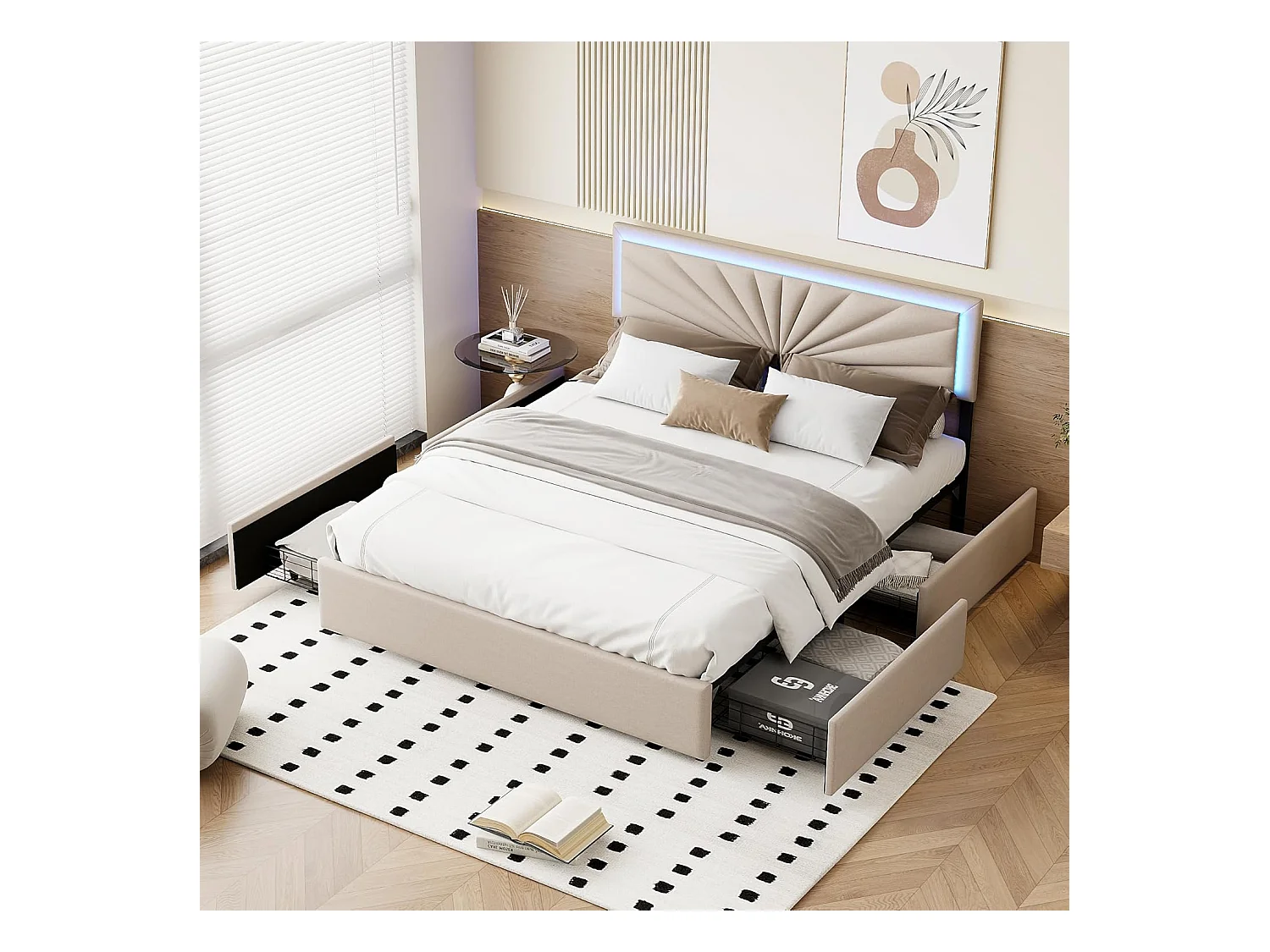 Cama tapizada 140x200 cm con USB, LED y 2 cajones - Madera - Beige (sin colchón)