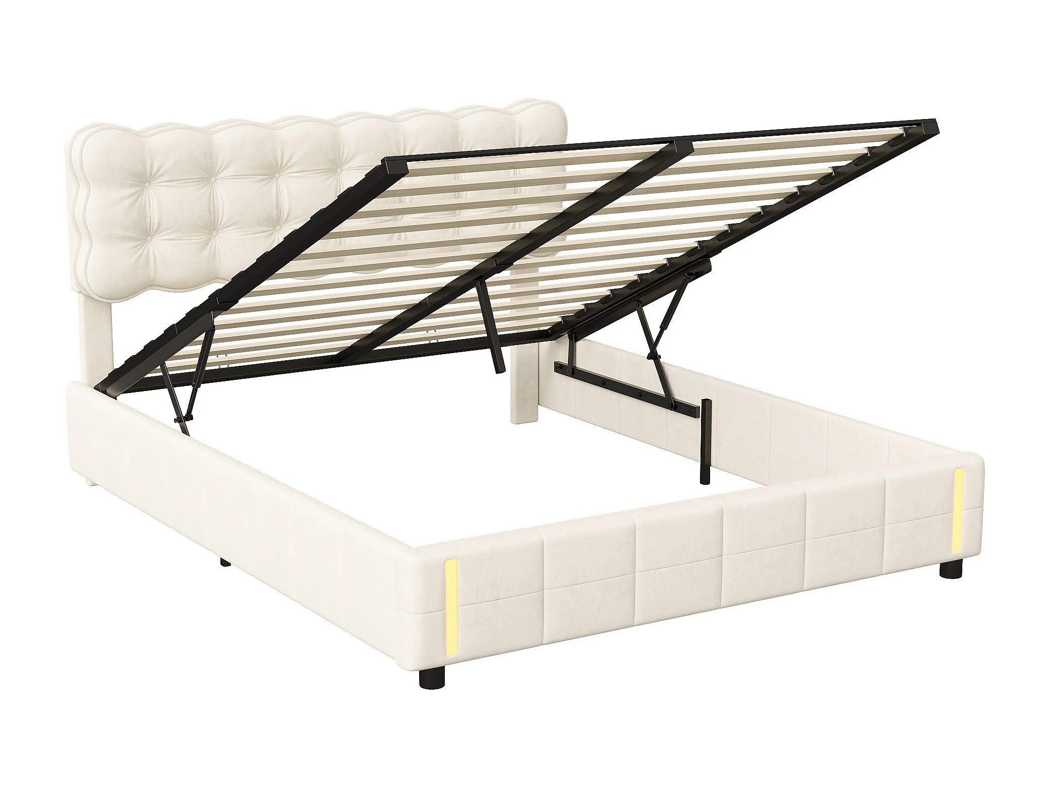 Cama doble 160 x 200 cm en terciopelo - cabecero ajustable - canapé hidráulico - barra luminosa - beige