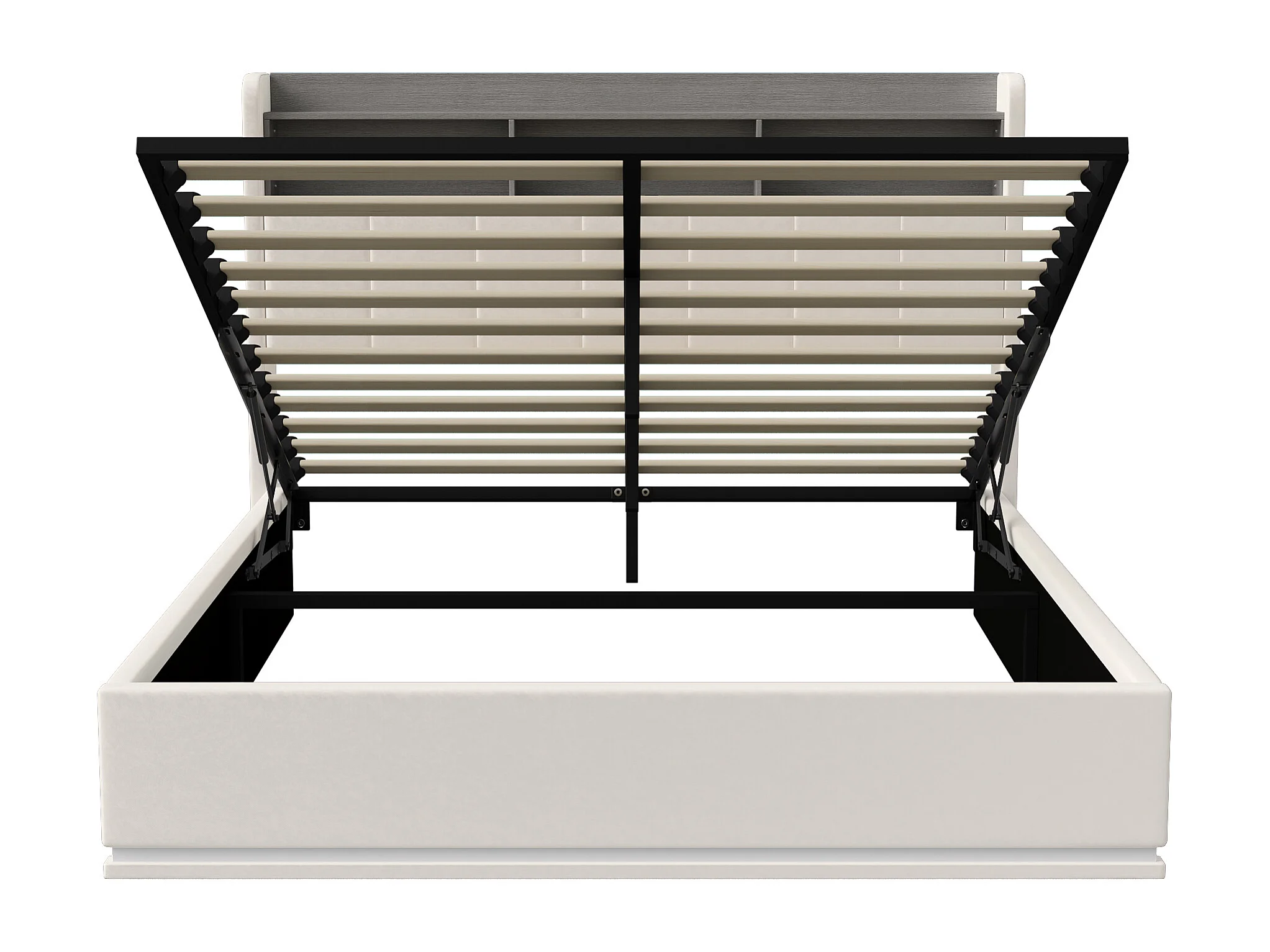 Cama doble 160x200 cm con iluminación LED y puertos USB - cabecero con compartimentos de almacenaje - canapé hidráulico - terciopelo - blanco