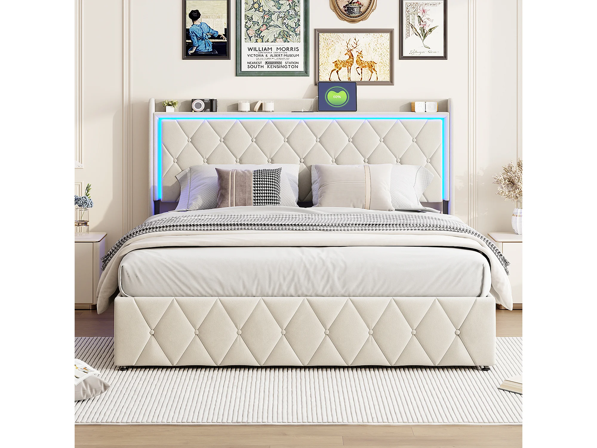 Cama doble 160x200cm con almacenaje hidráulico - cabecero con LED y puertos USB - terciopelo - beige