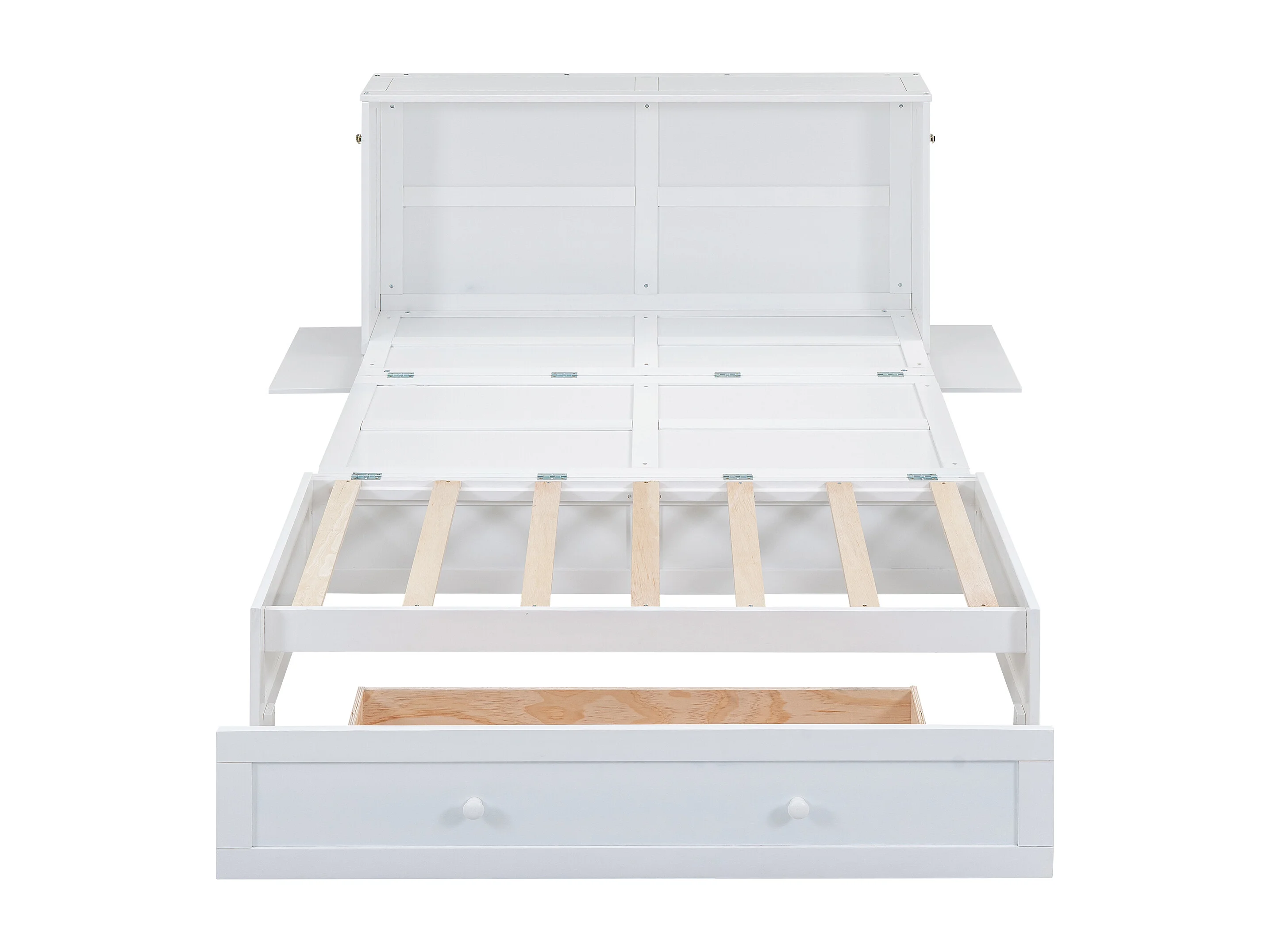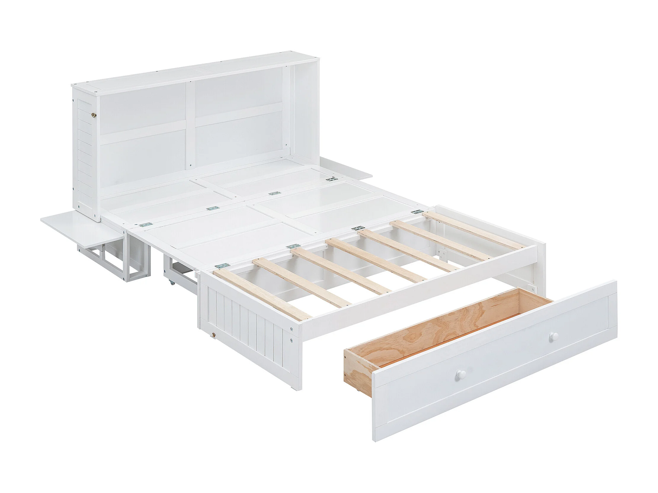 Cama doble 140x200 cm en pino y MDF con cabecero contenedor, estantes abiertos y 3 cajones - Blanco