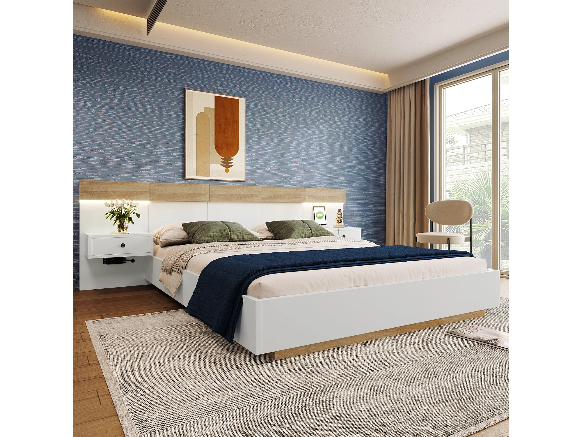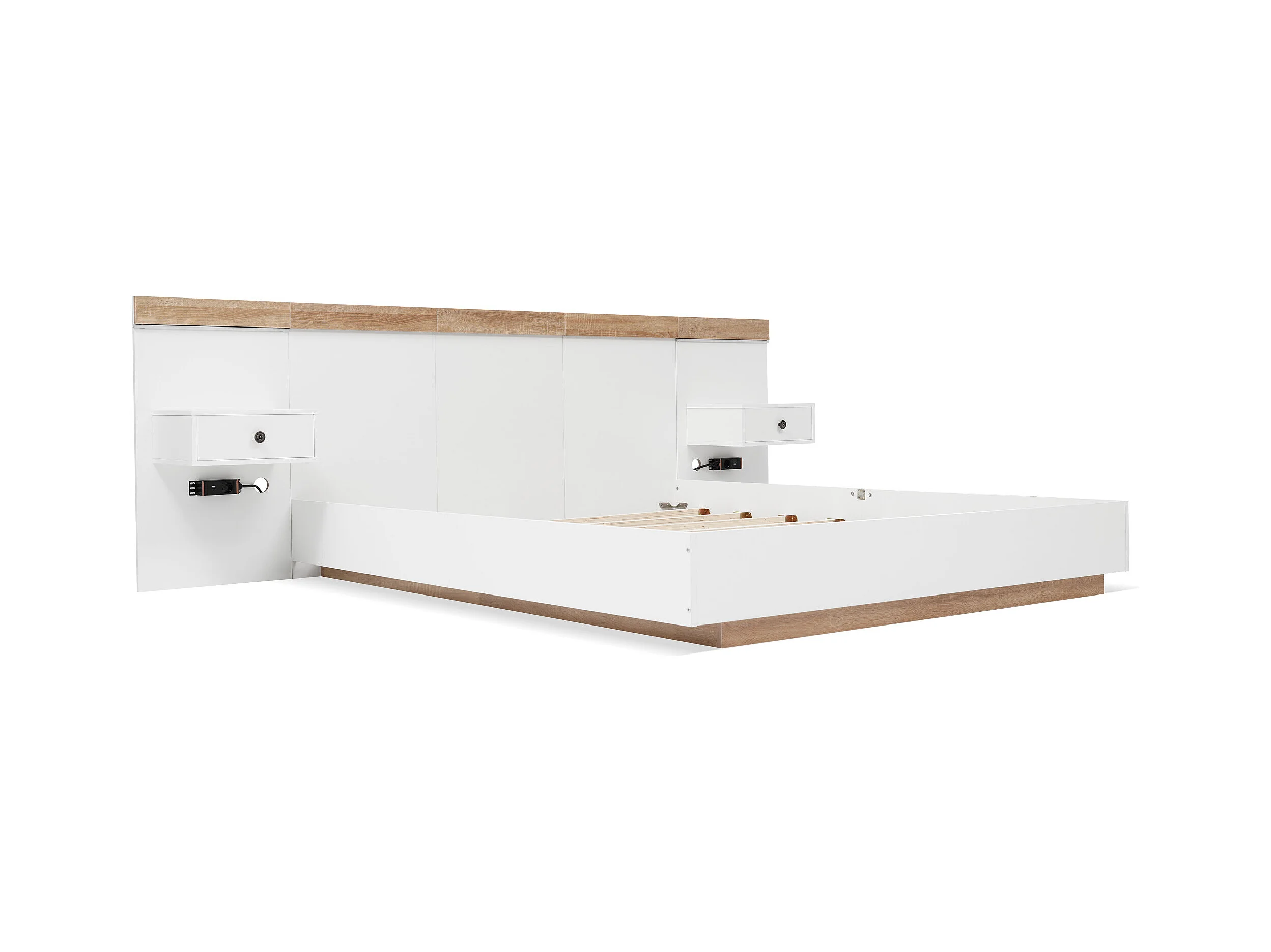 Cama doble adulto 160x200cm con 2 mesitas de noche, iluminación LED y puerto USB-C - Blanco y natural claro