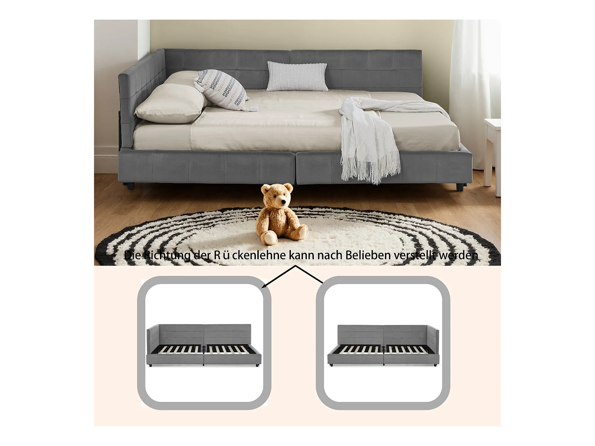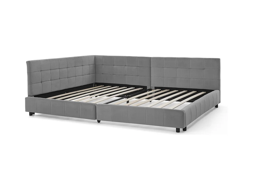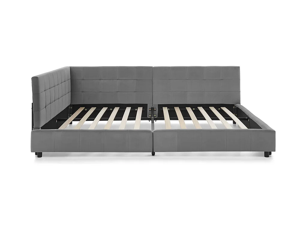 Cama doble 160x200 cm en terciopelo gris, con soporte de listones de madera, para adultos y adolescentes (sin colchón)