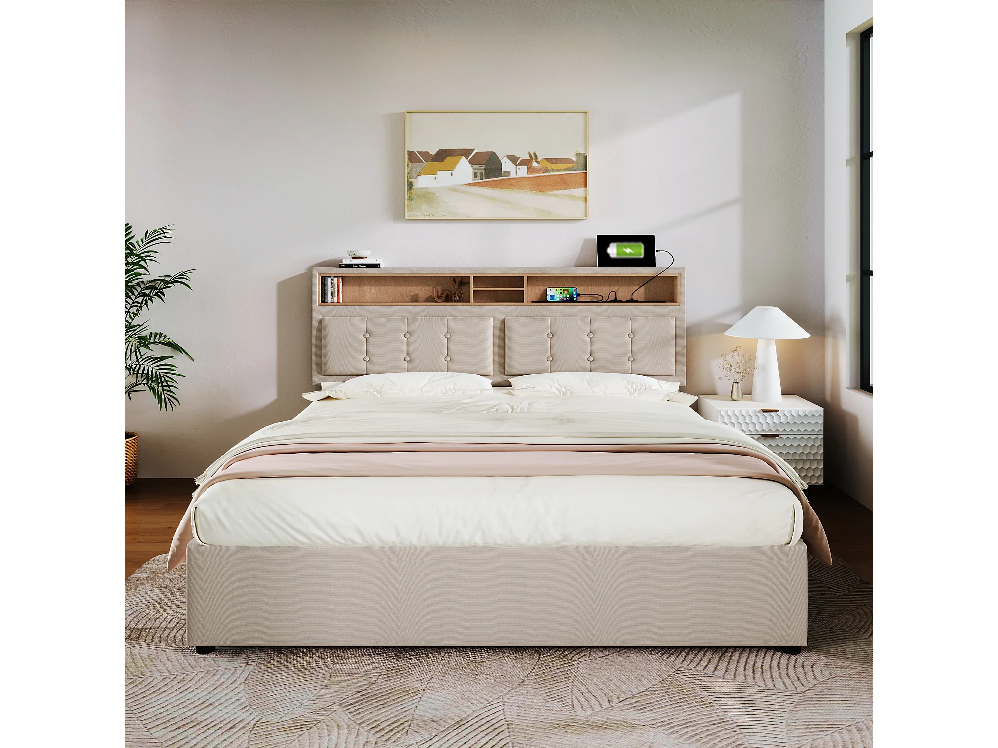 Cama doble con cabecero ajustable, toma USB-C integrada, almacenaje, lino beige (143x204x92 cm)