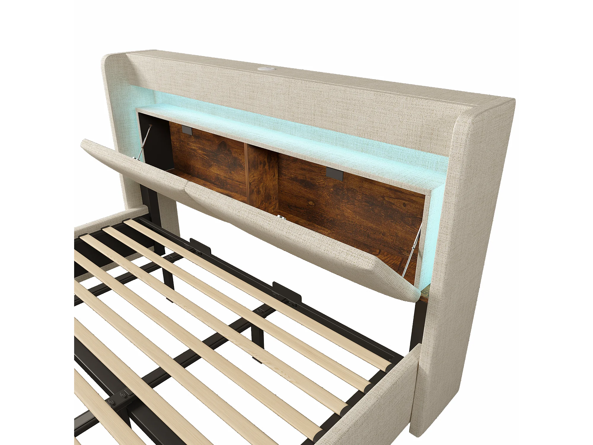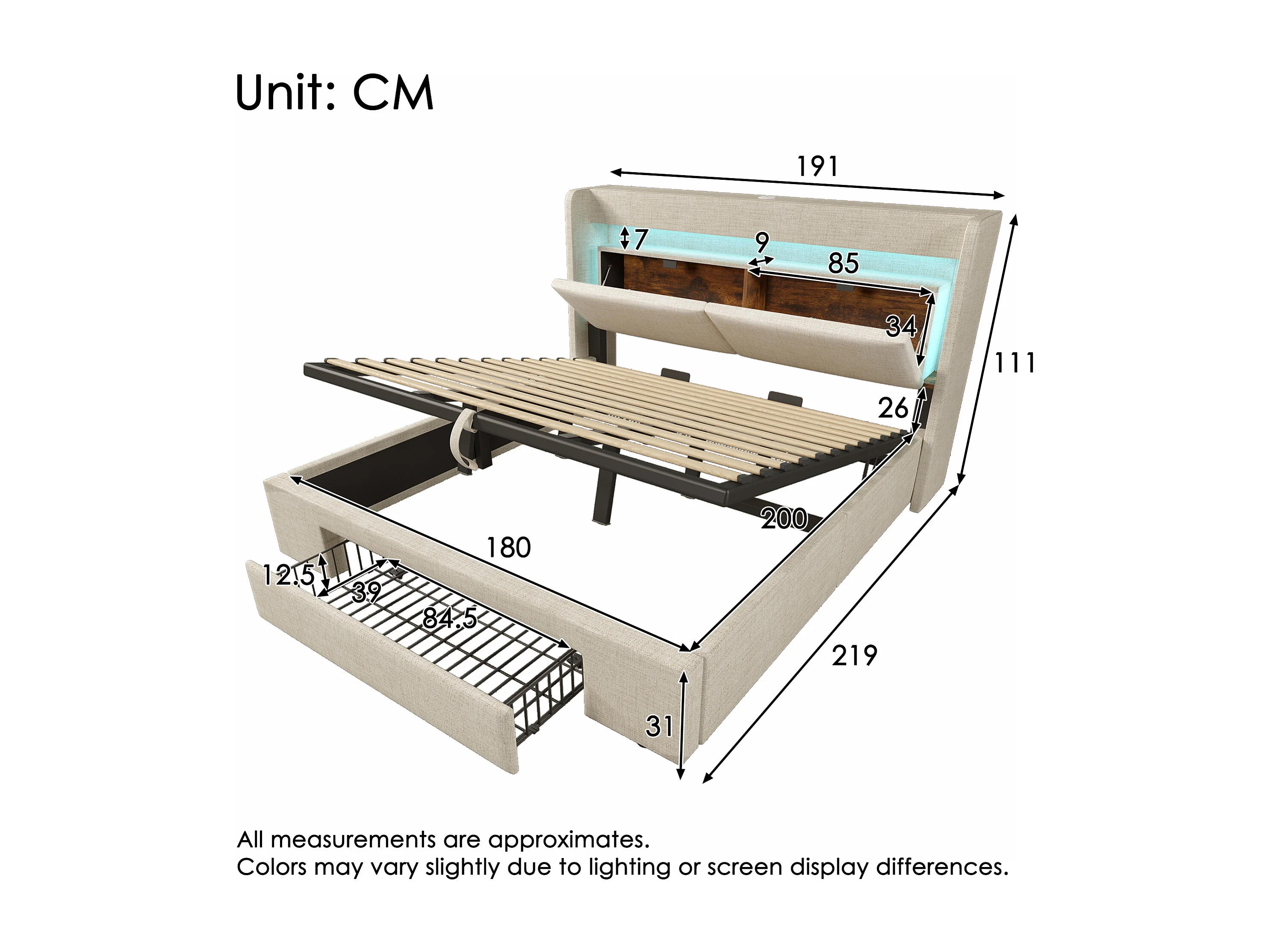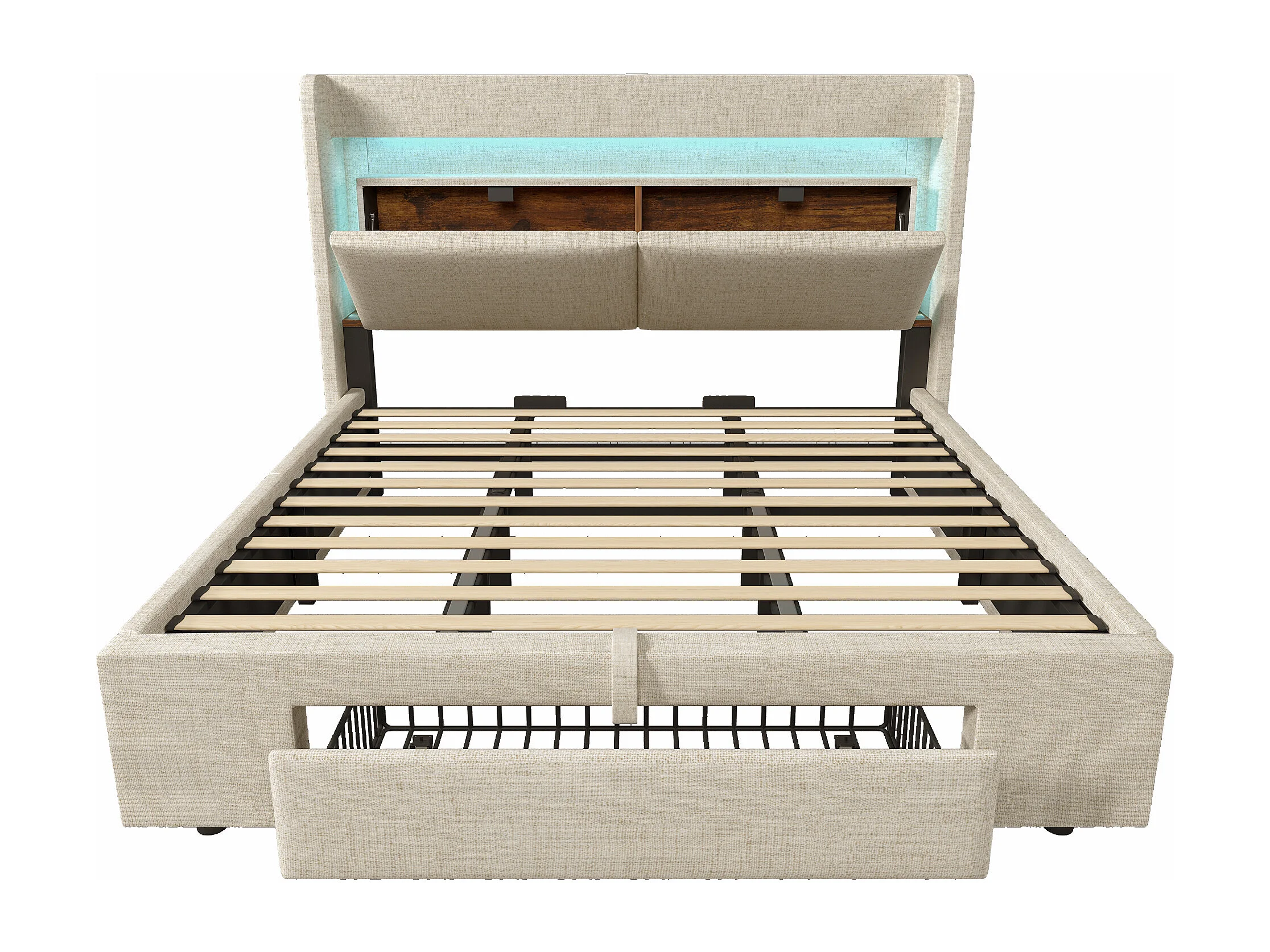Cama doble con canapé 180x200 cm en lino beige - Cama adulto con LED, puertos USB y cajón (colchón no incluido)