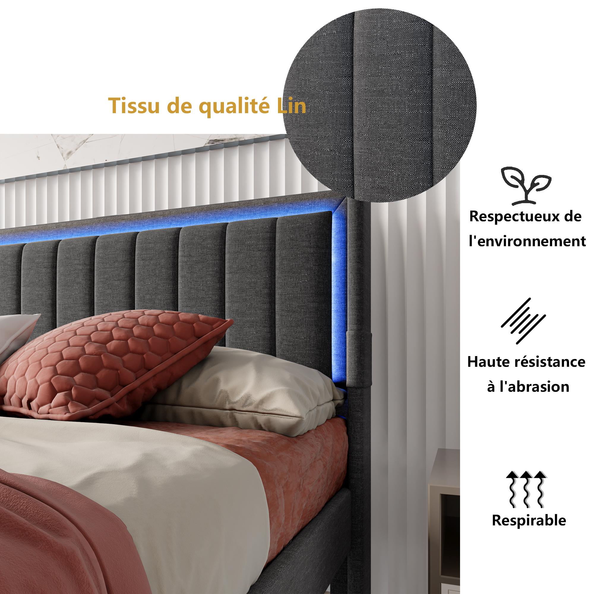 Cama con canapé 140x200 cm, con iluminación LED y toma USB, con espacio de almacenaje, tejido de lino, color gris