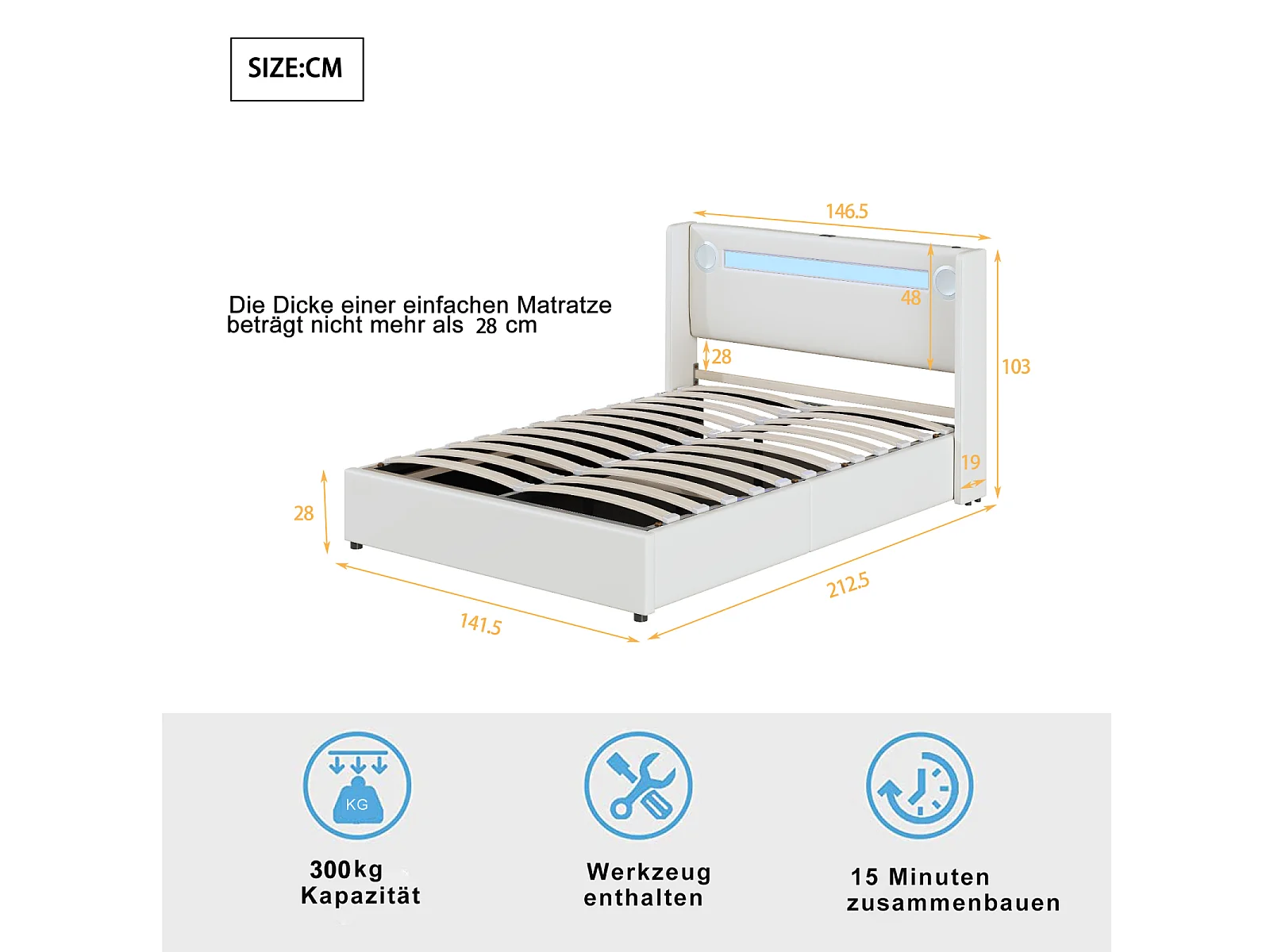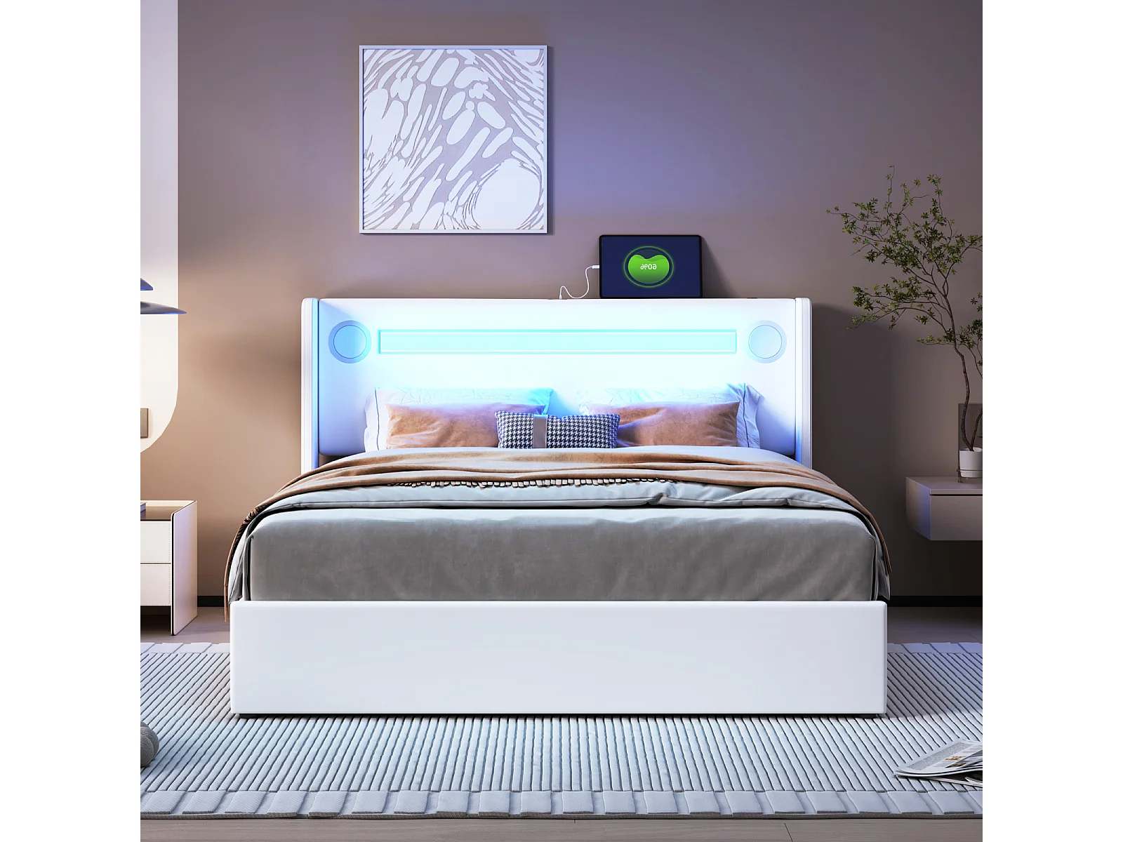 Cama doble de 140x200 cm en PU blanco con LED, reproductor Bluetooth, puerto USB, compartimento de almacenamiento y somier de láminas integrado.
