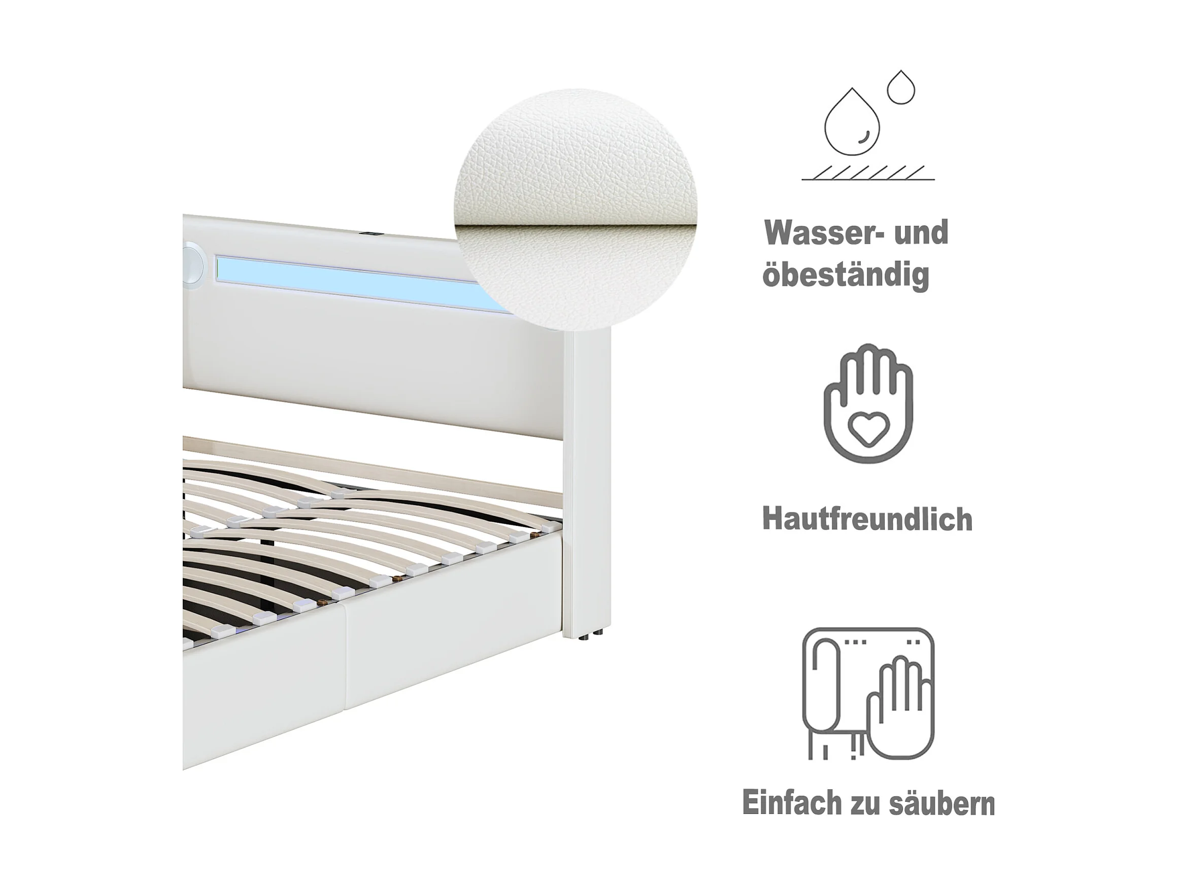 Cama suspendida de 140x200 cm en PU blanco + madera clara, cajón de almacenaje, iluminación LED bajo la cama, doble puerto USB, bolsillo lateral