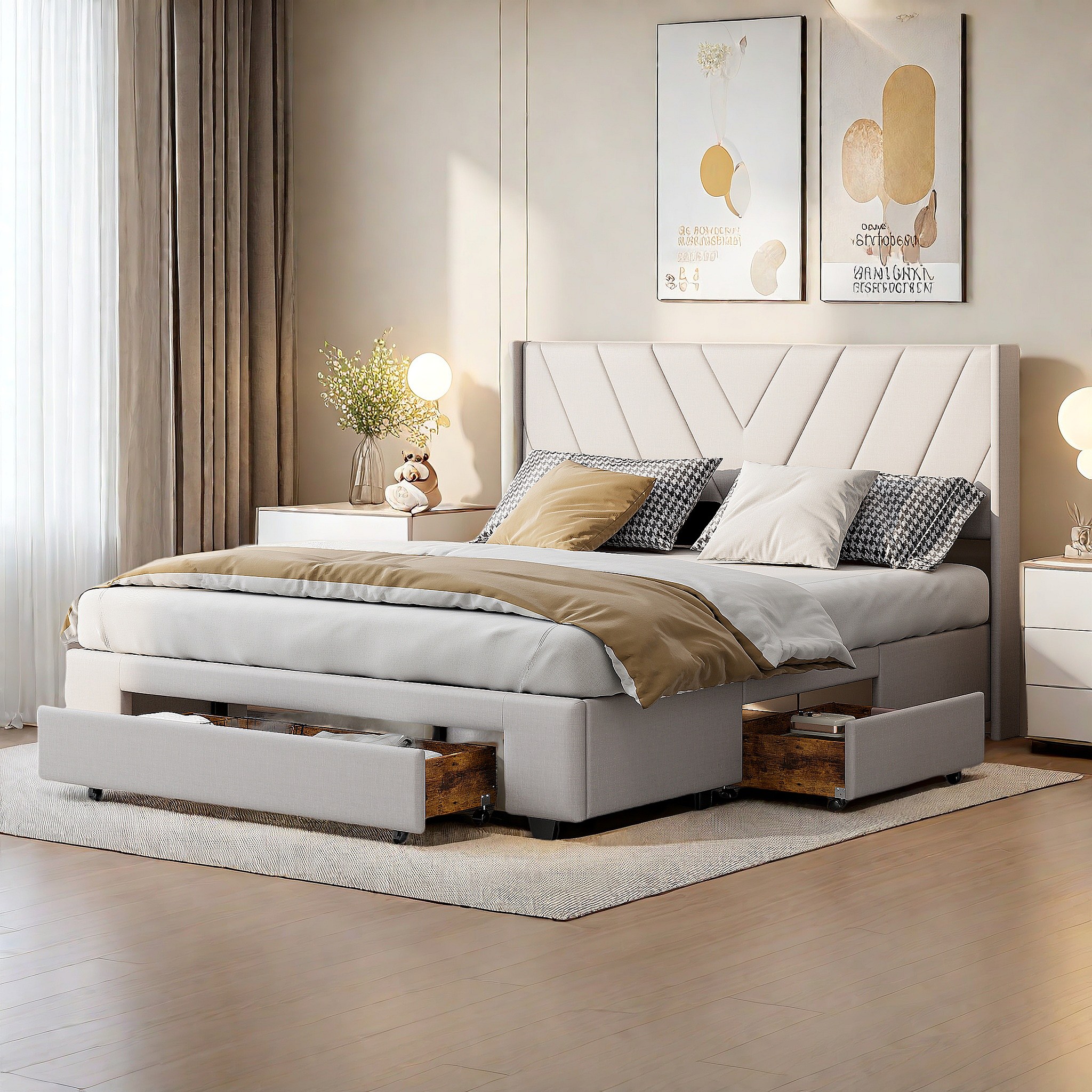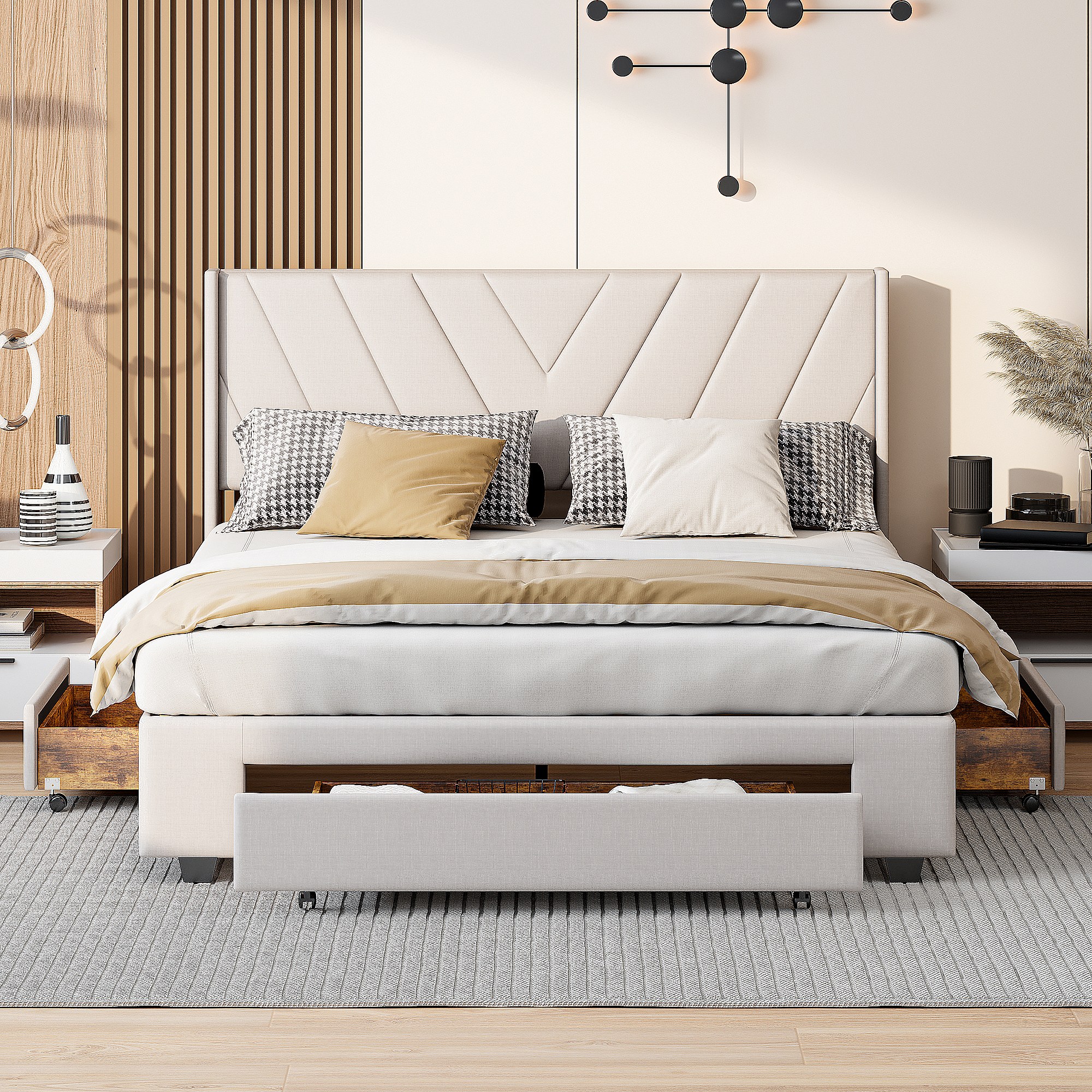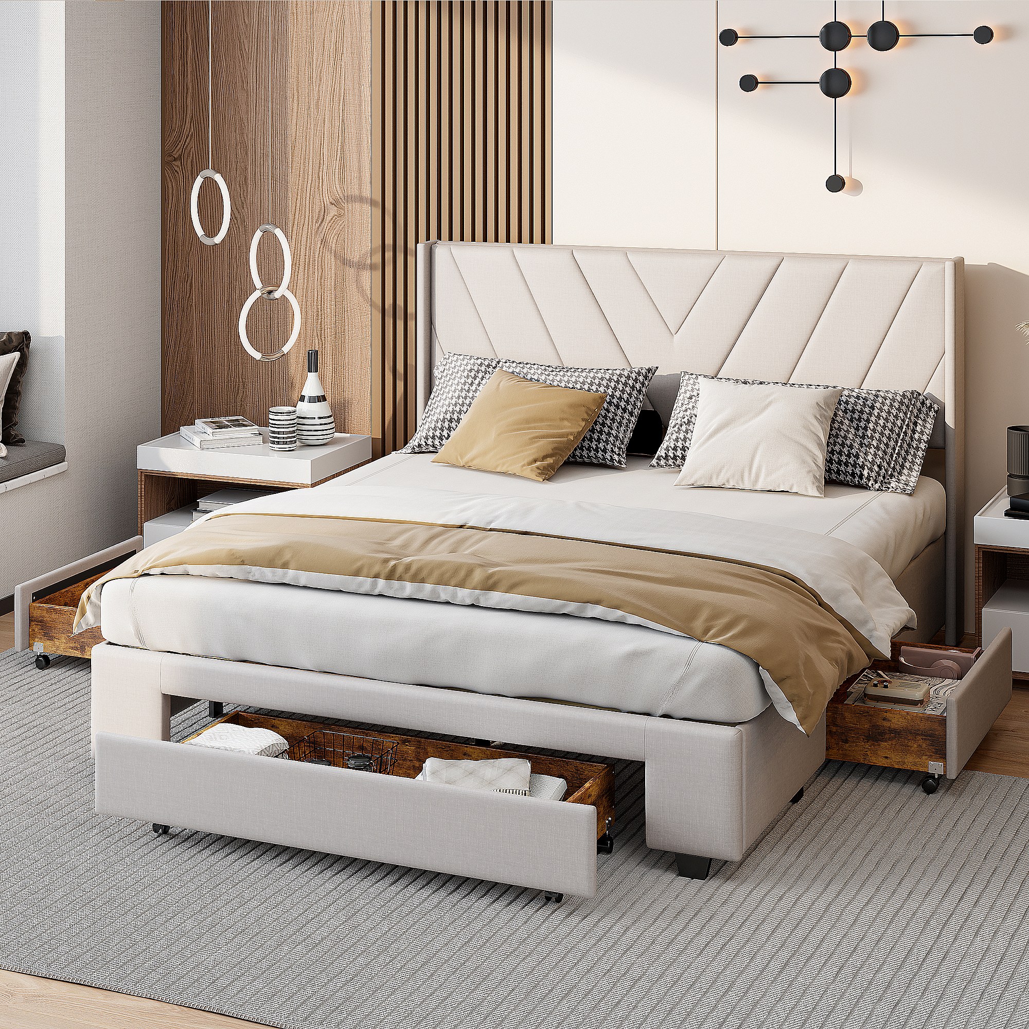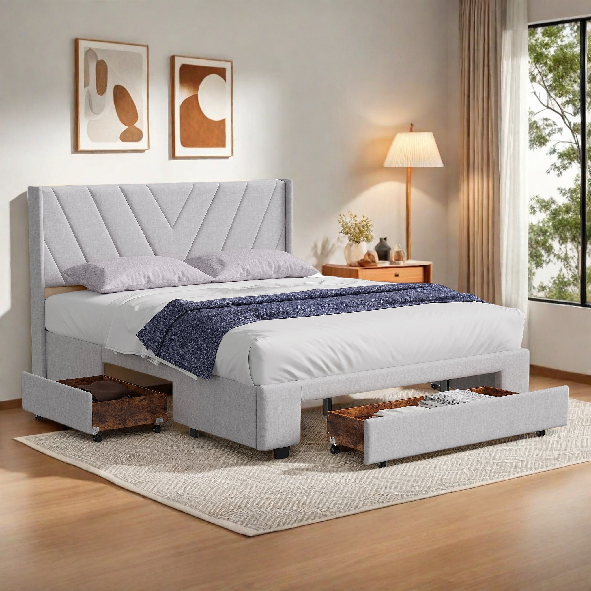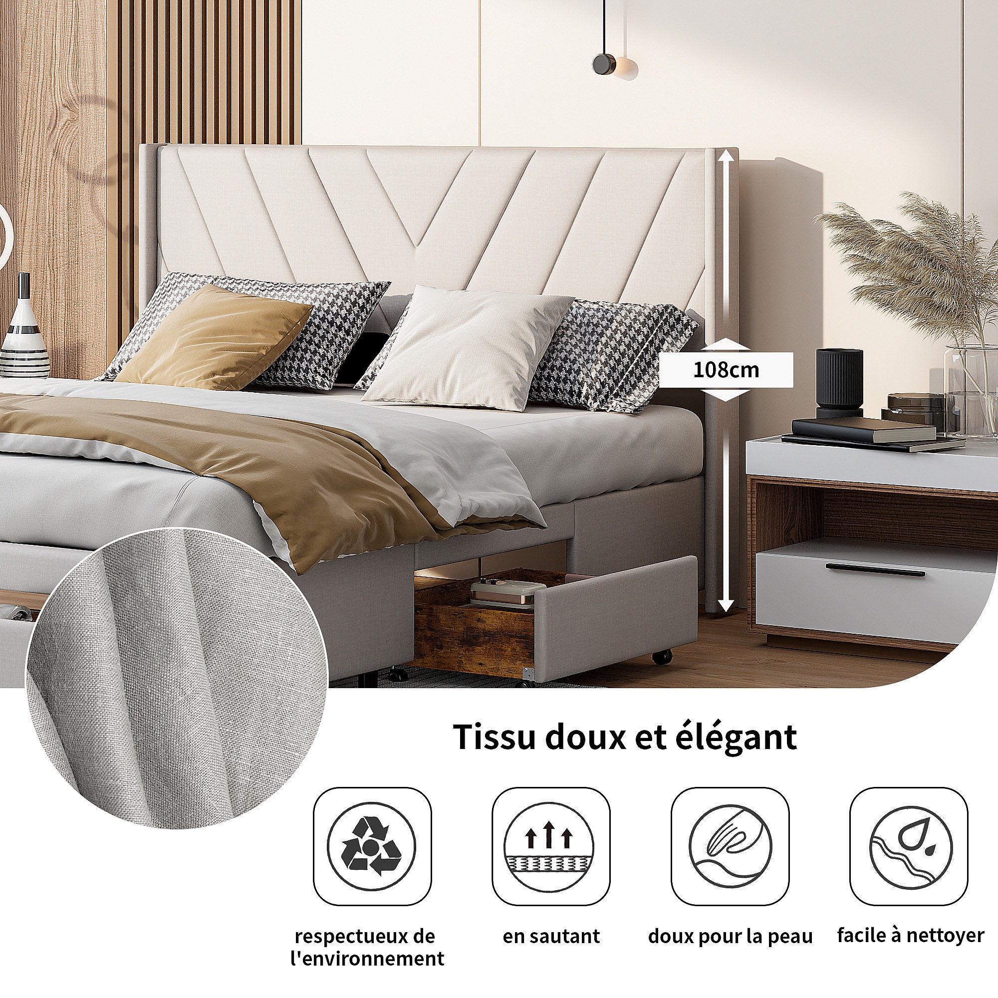 Cama doble de 160 x 200 cm en lino beige con 3 cajones y estructura tapizada - Tejido ecológico, suave y cómodo, fácil de limpiar