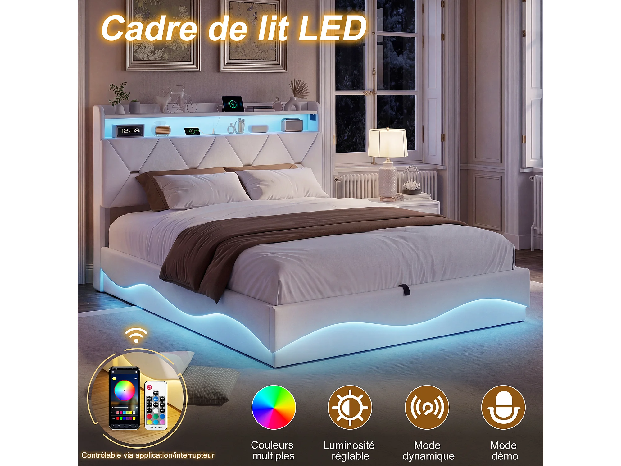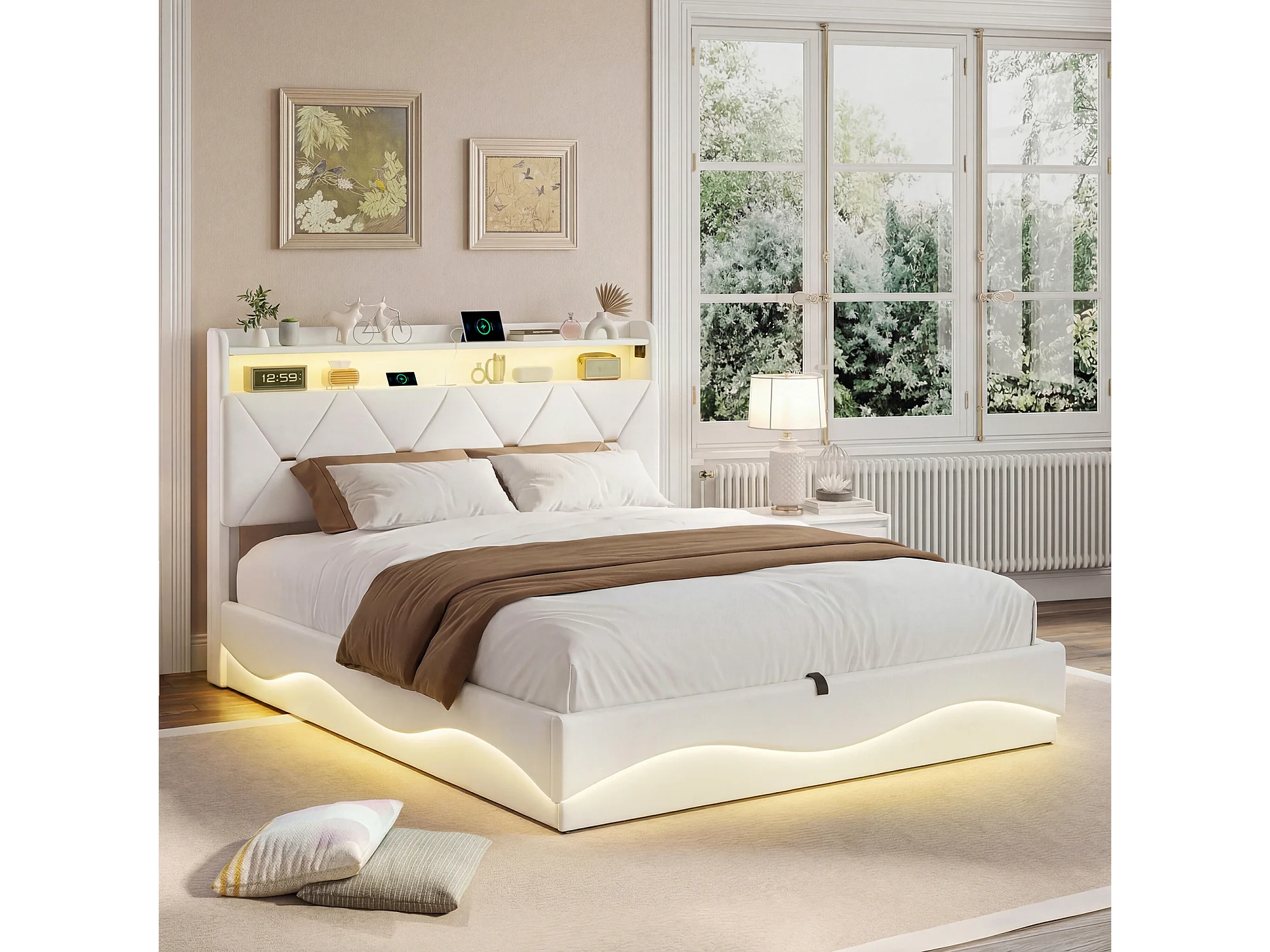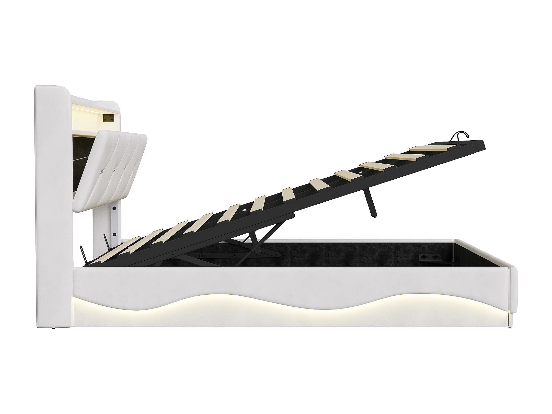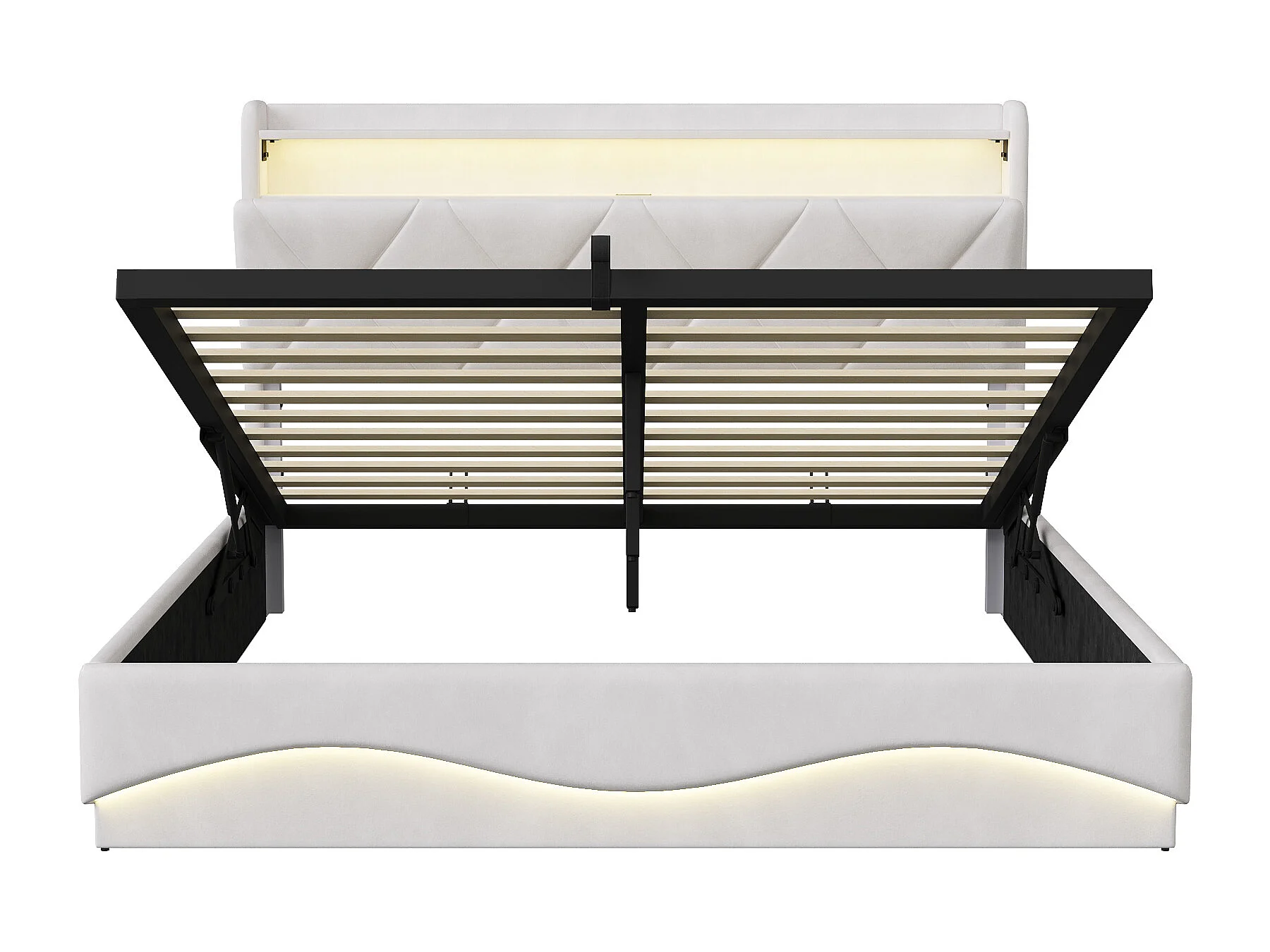 Cama doble de 160x200 cm con almacenamiento hidráulico - cabecero con LED y puerto USB - terciopelo - Beige